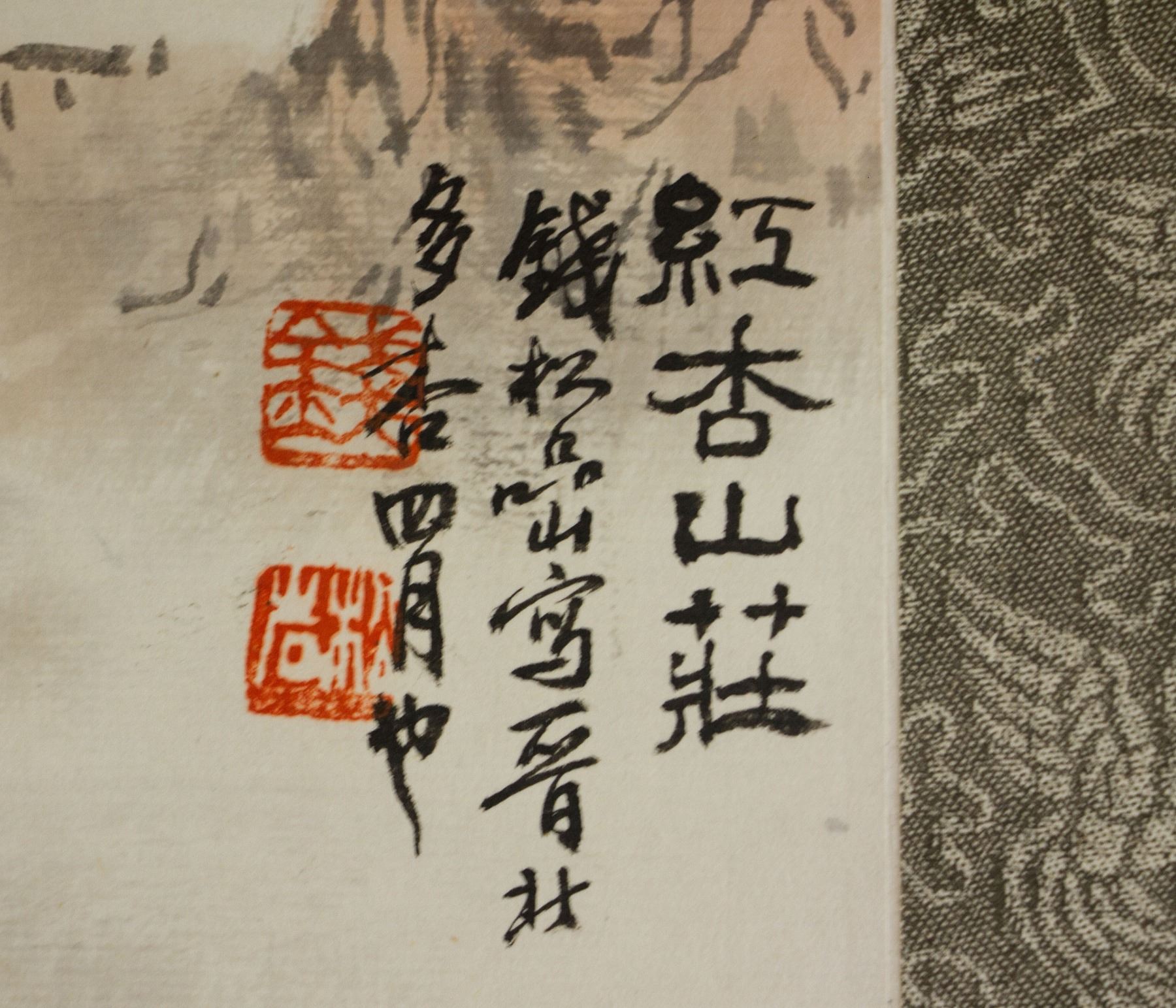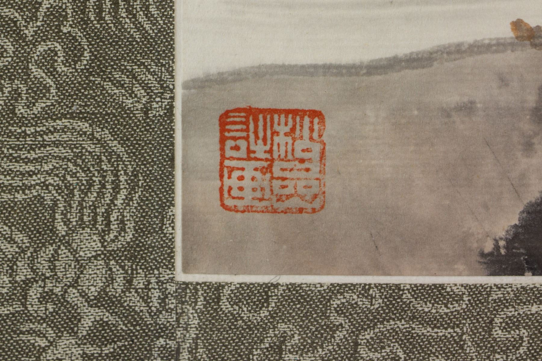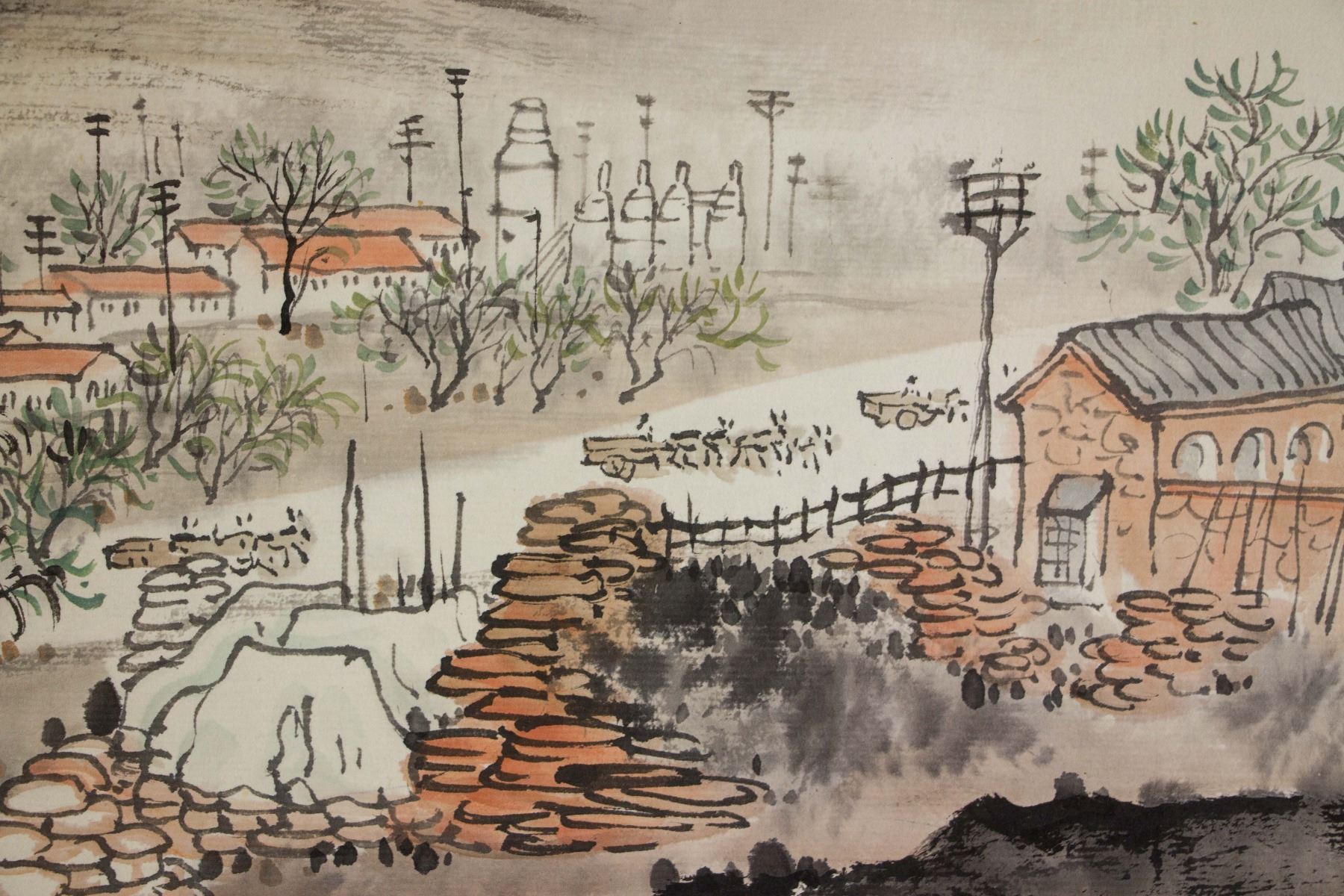 Mountainous landscape with village; Chinese ink and watercolour on paper roll; signed Qian Songyan (1899-1985); inscribed with 3 artists seals; 29 cm x 35 cm