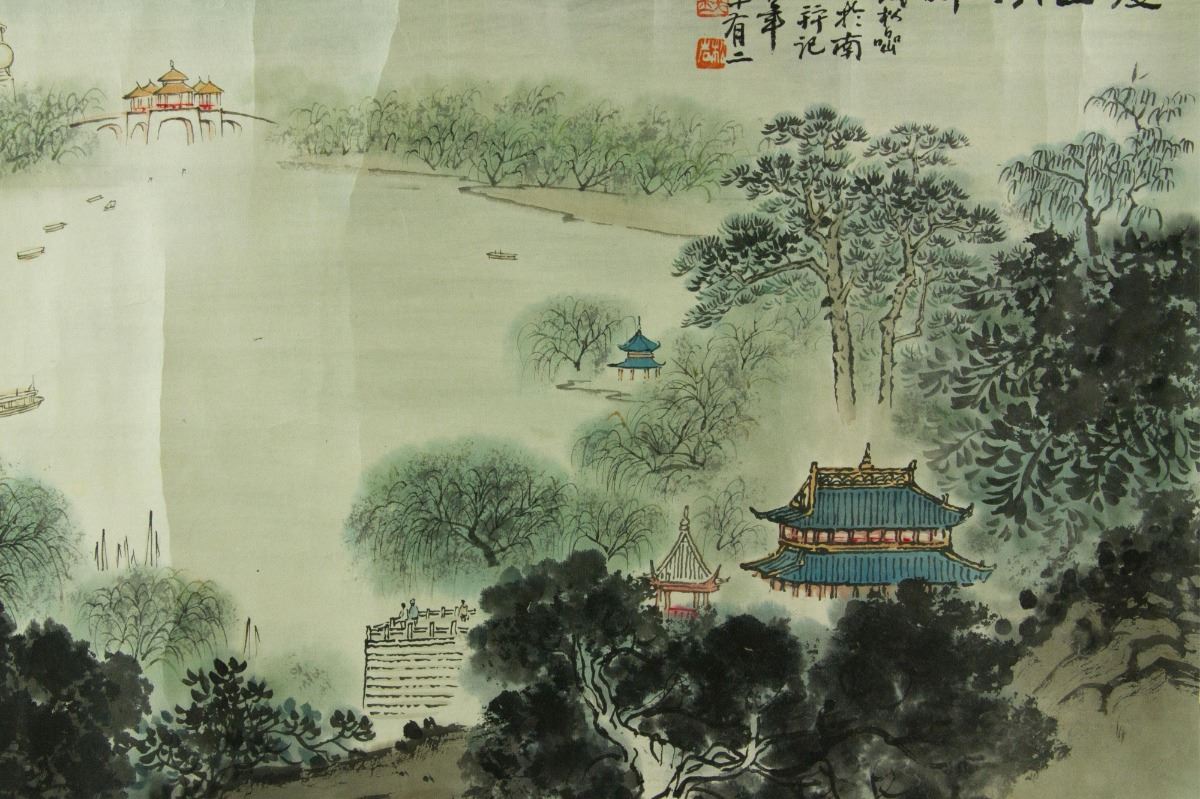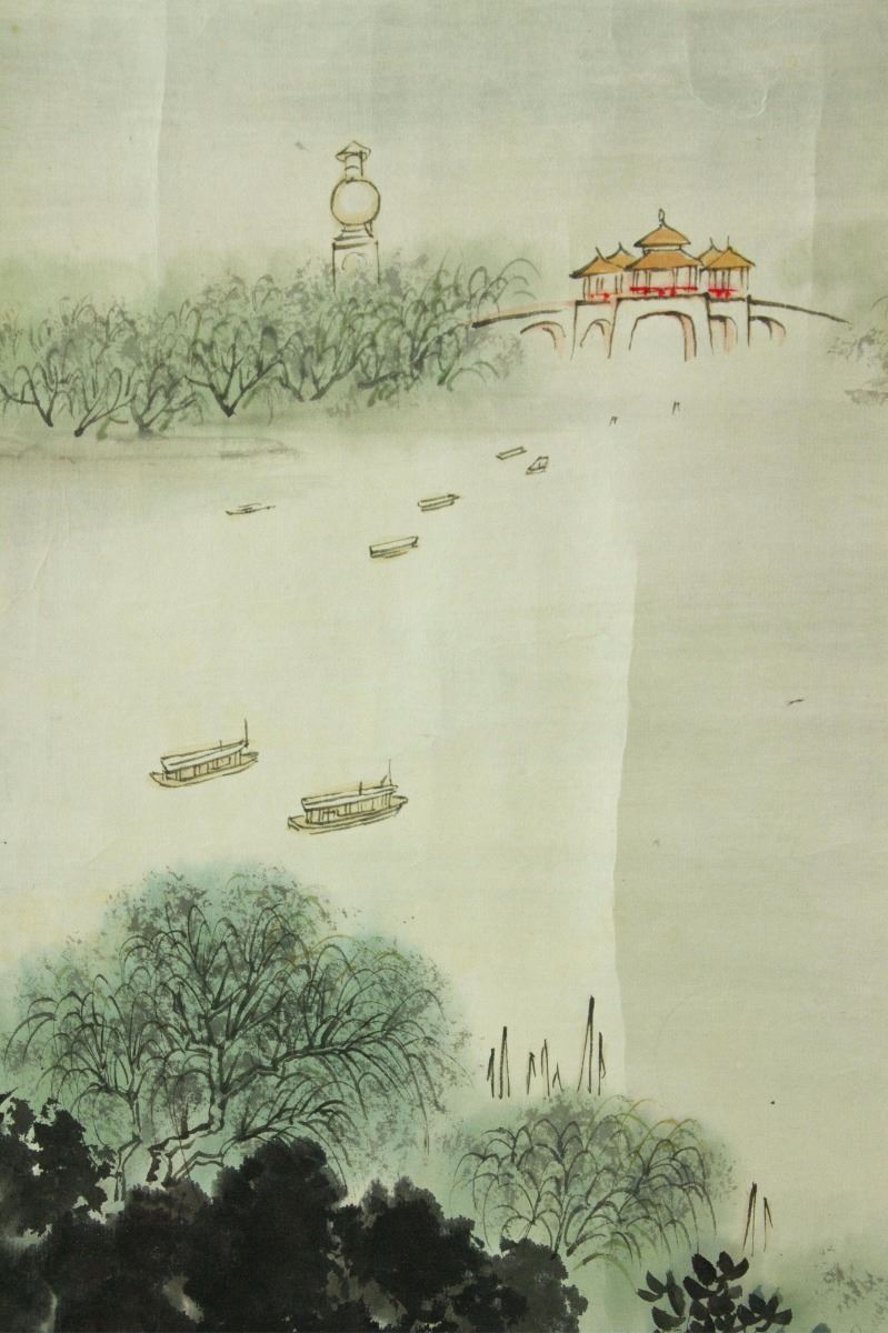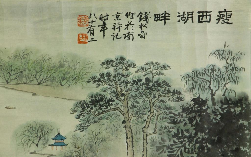 Scenery besides West Lake; Chinese ink and watercolour on paper; signed Qian Songyan and inscribed with two artist seals; 42 cm x 66 cm
