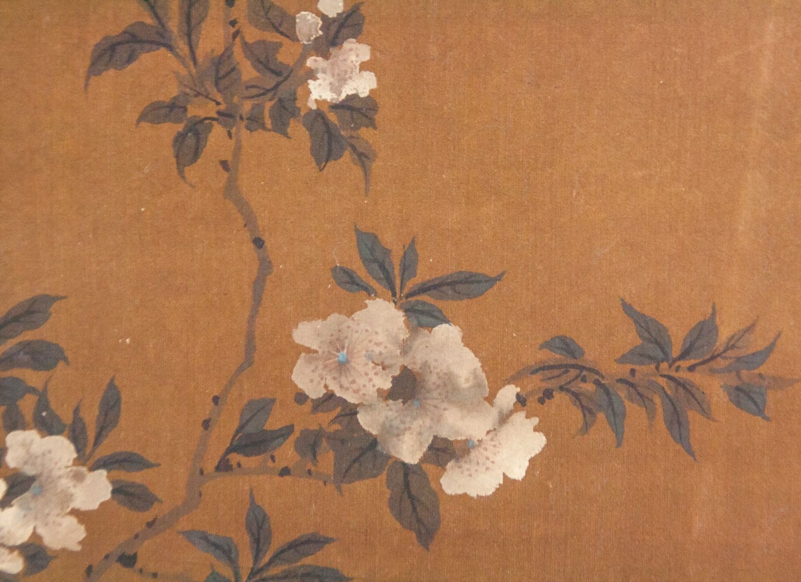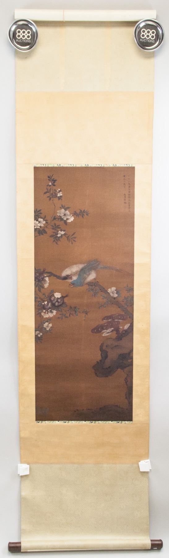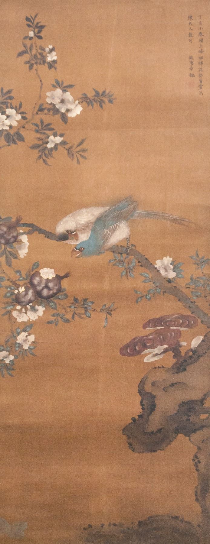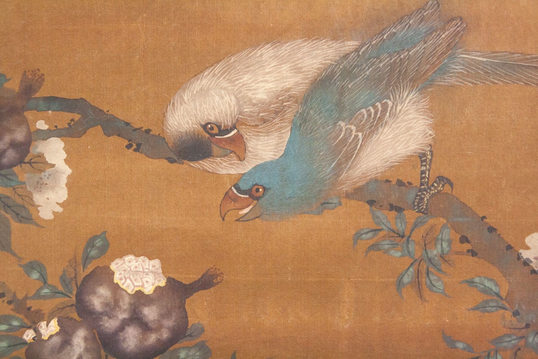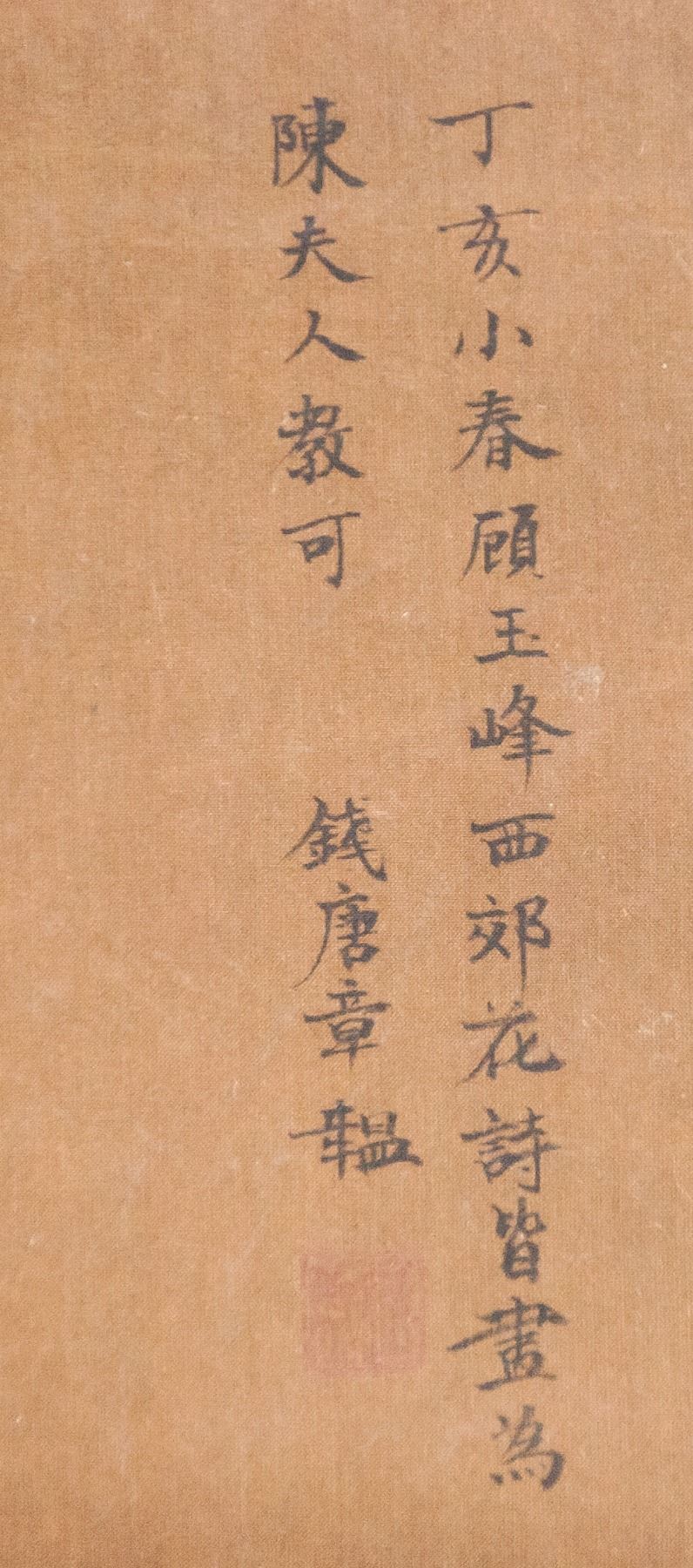 Chinese ink and watercolor on fabric scroll. Featuring birds and flowers. Signed "Qian Tangzhang" to the top right in Chinese characters. Inscribed with one seal. 97 x 36 cm.