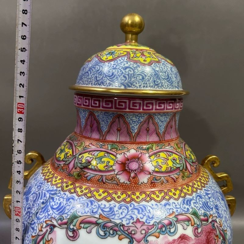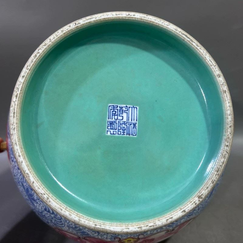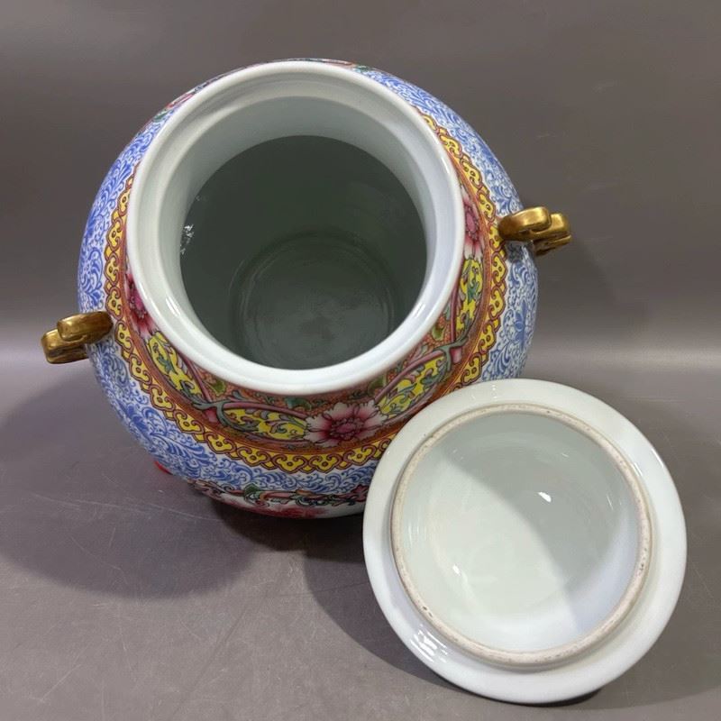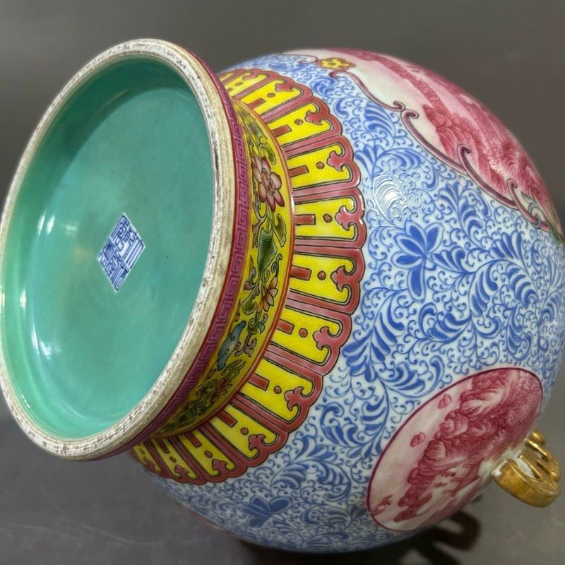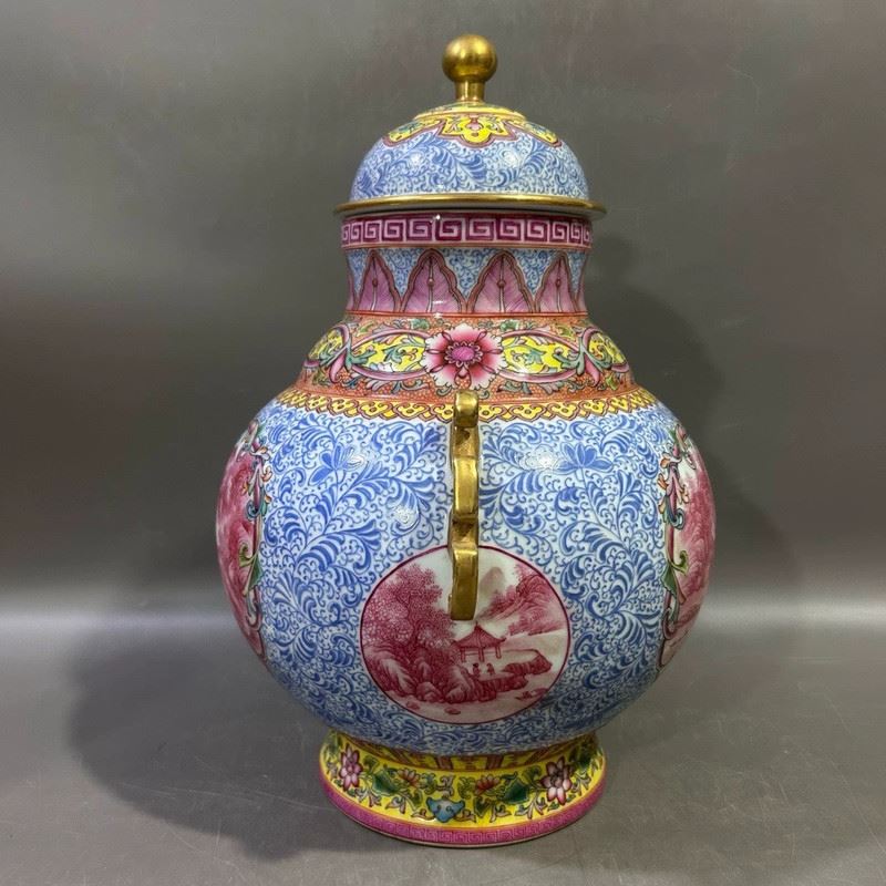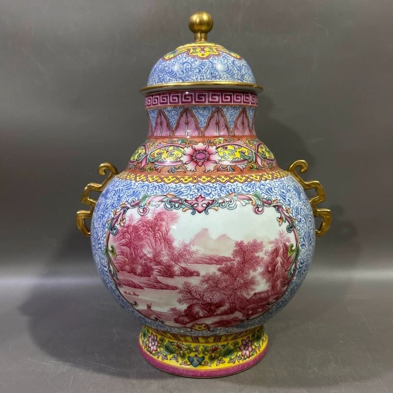 This Qianlong period blue floral open-window iron red landscape lidded vase blends exquisite blue floral porcelain with iron red craftsmanship, showcasing the elegance and superb skill of Qing Dynasty court art. The vase features an open-window design with vivid landscape paintings, contrasting vibrant colors. The pairing of iron red and blue floral motifs highlights the intricate beauty of nature. The golden lid and handles add a touch of luxury, reflecting the perfection of traditional ceramic craftsmanship. This vase is not only a representative piece of traditional art but also holds significant collectible value.