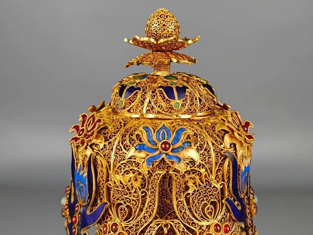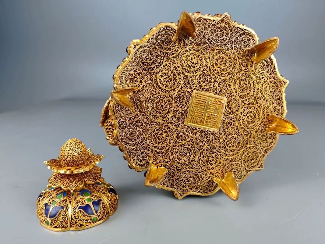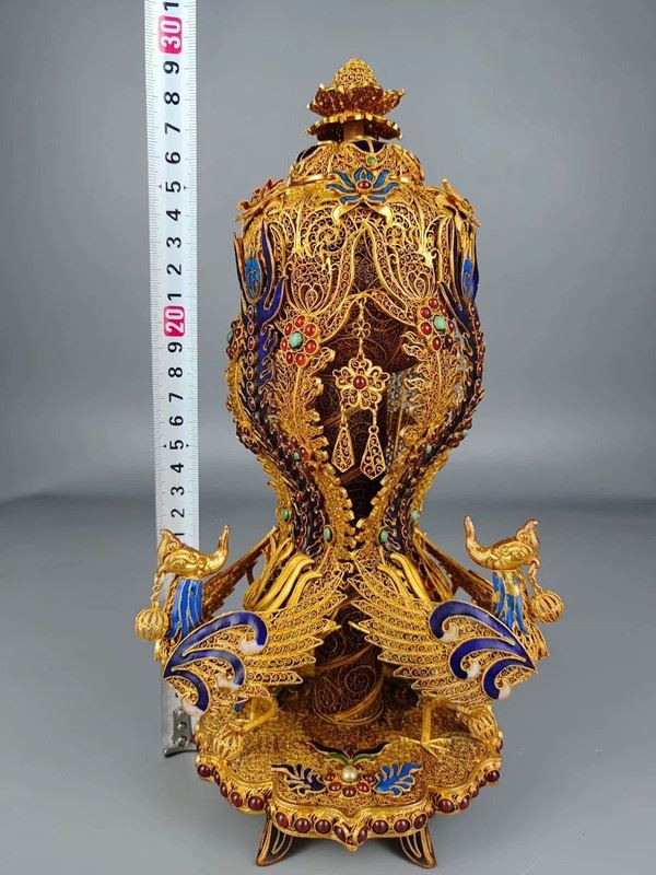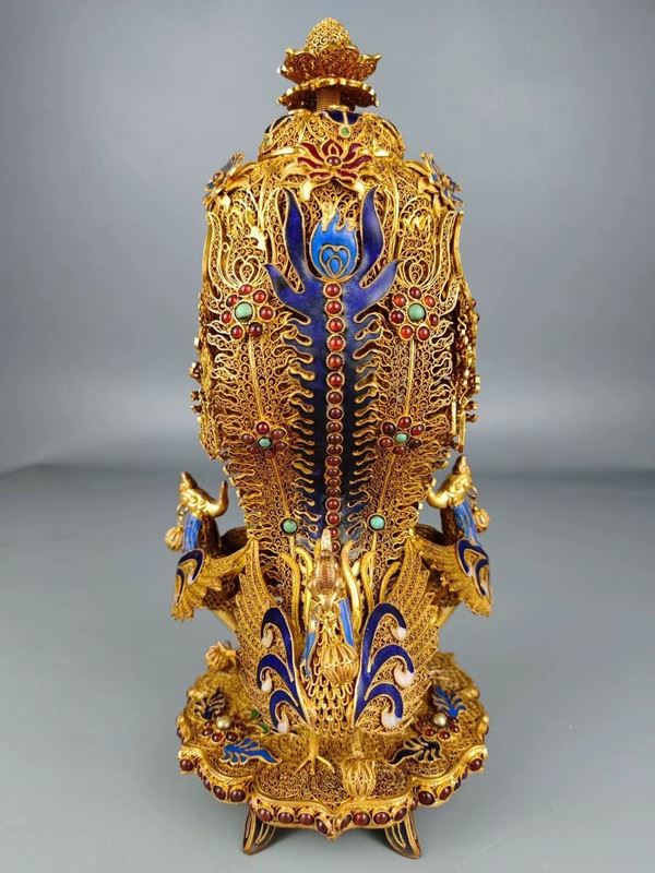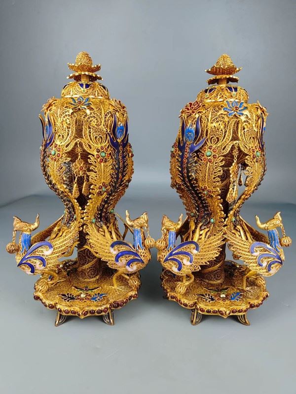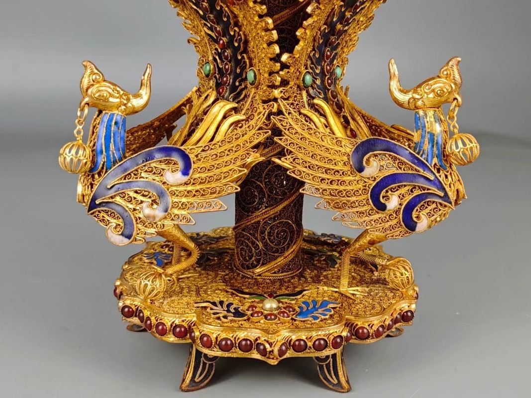This pair of gilt bronze cloisonné phoenixes from the Qianlong period features exquisite craftsmanship, with the phoenixes spread in elegant form, shining with gold. The fine filigree work and the inlaid gemstones enhance the luxuriousness of this piece, showcasing the peak of Qing Dynasty court art. It is not only a masterpiece of metalworking from the Qianlong era but also a valuable collector’s item.