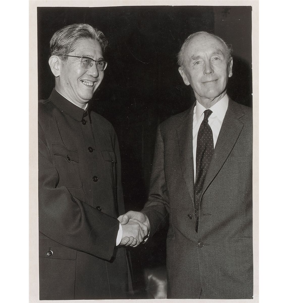Chinese foreign minister (1913–1983) from 1974 to 1976, whose talks with Henry Kissinger played an important role in the drafting of the Shanghai Communique. Glossy 6 x 8 photo of Qiao Guanhua shaking hands with former British Prime Minister Alexander Frederick Douglas-Home, signed on the reverse in ink by Qiao in Chinese and dated June 14, 1974. Photo is also annotated on the reverse in an unknown hand. Affixed to a slightly larger piece of cardstock. Moderate scattered creases, mainly to image side, but a few to signed side as well, otherwise fine condition; signature remains bold and unaffected.