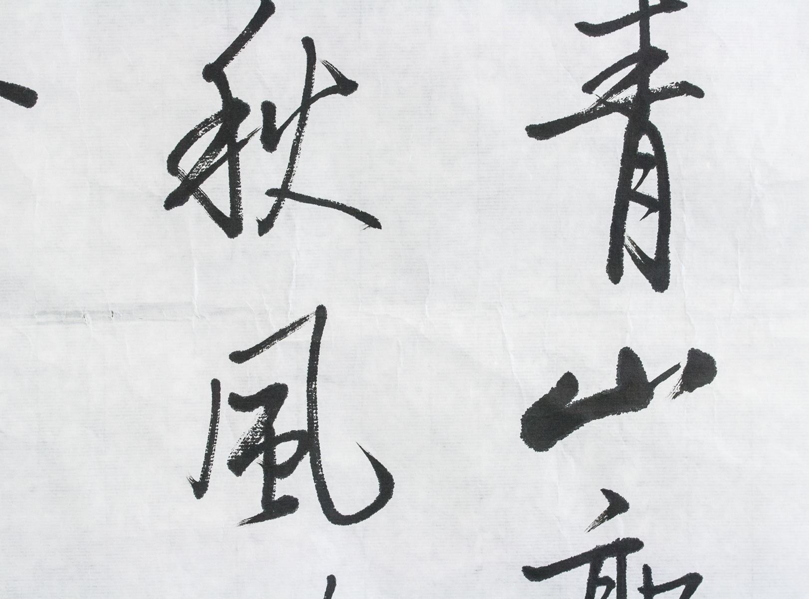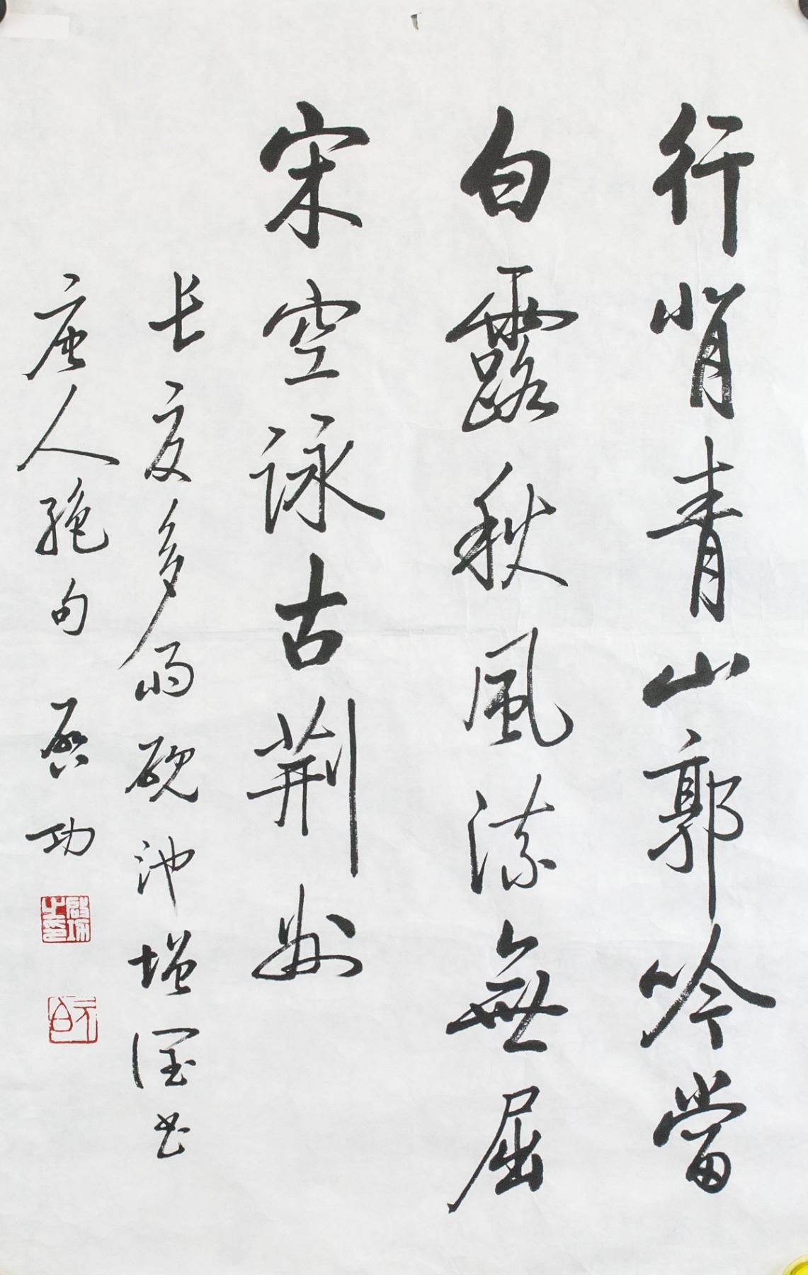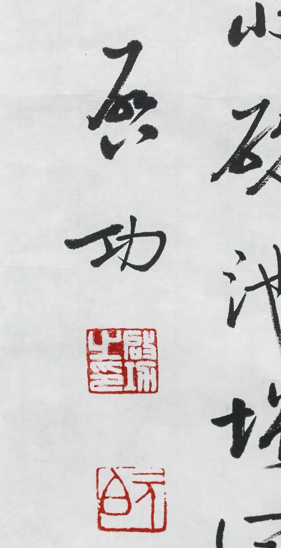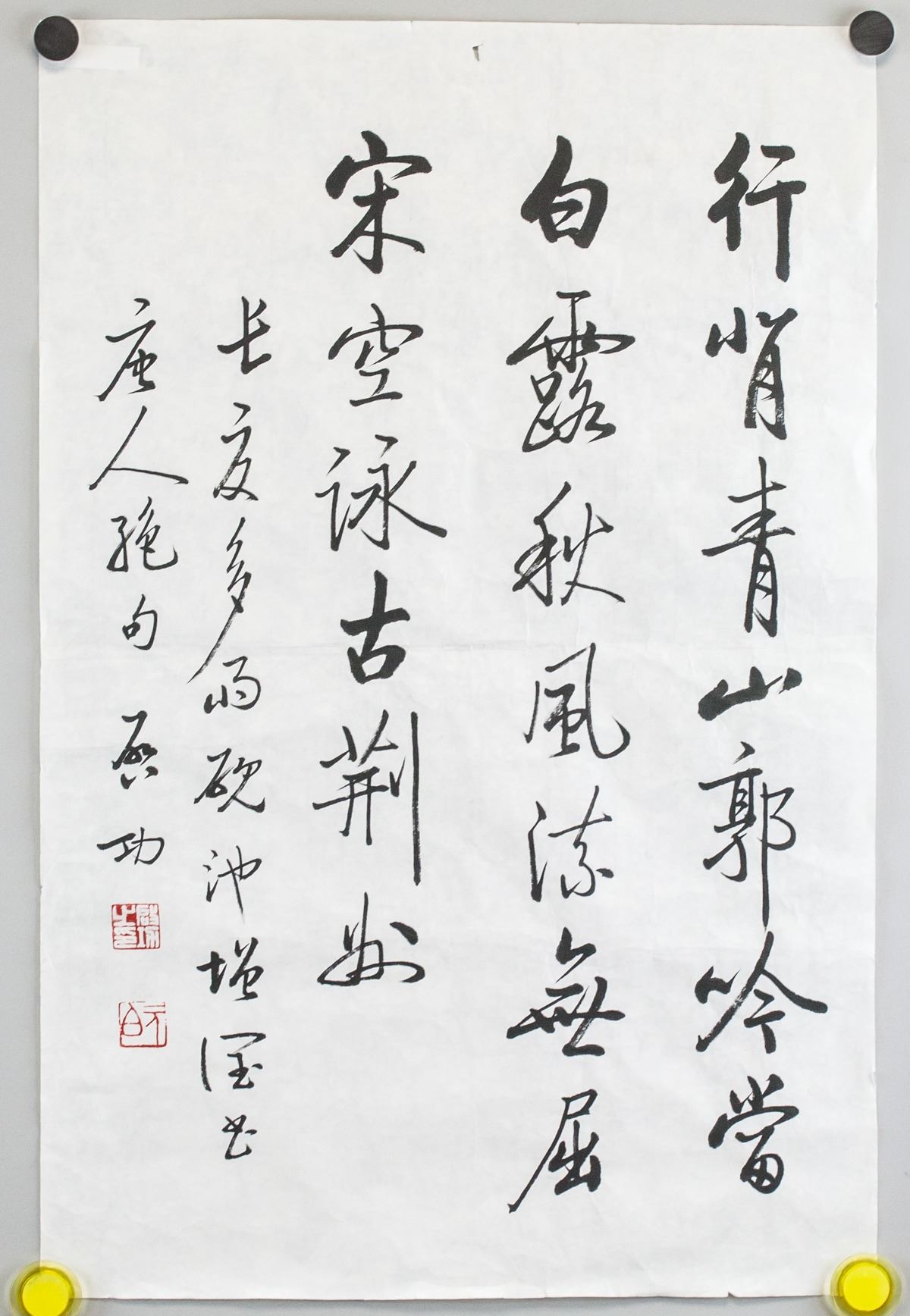 Ink on paper. Featuring Chinese calligraphy. Signed "Qigong" in Chinese characters to the left. Inscribed with two artist seals. Attributed to Qigong (1912-2005, Chinese). 70 x 46 cm.