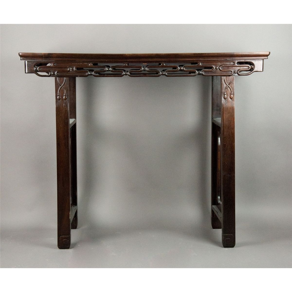 Qing period, Chinese Huanghuali alter table, apron piece carved with repeating decorative scrolls motifs, pieces connected with wood joints. 99 cm x 122 cm x 41.5 cm. Slight repair on the repeating decorative openwork scroll.