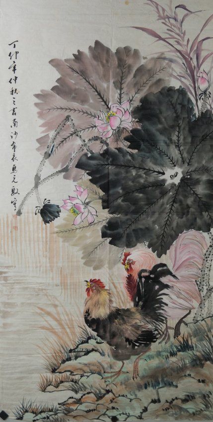 Two chickens, butterfly and orchids, Chinese ink and watercolour on paper; Attributed to Ma Yuan Yu (1669-1722) and inscribed with two artist seals; 130 cm x 68 cm