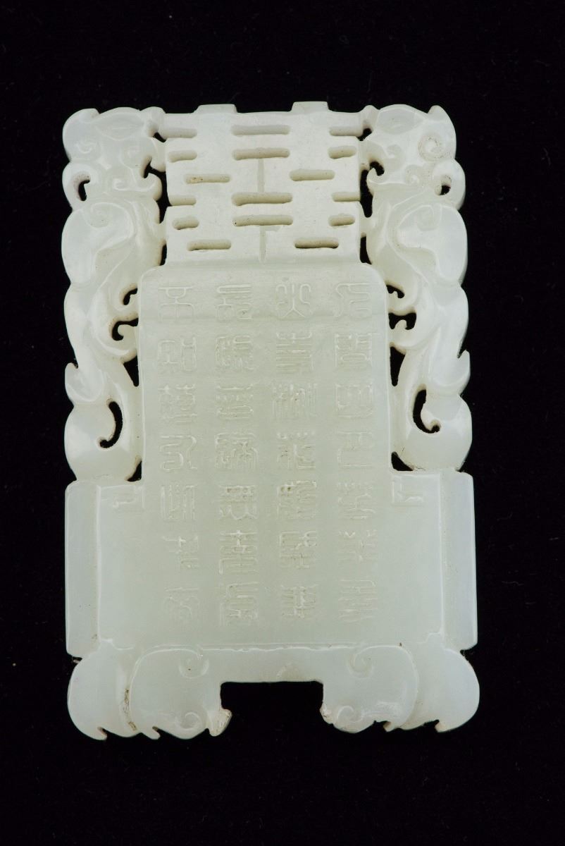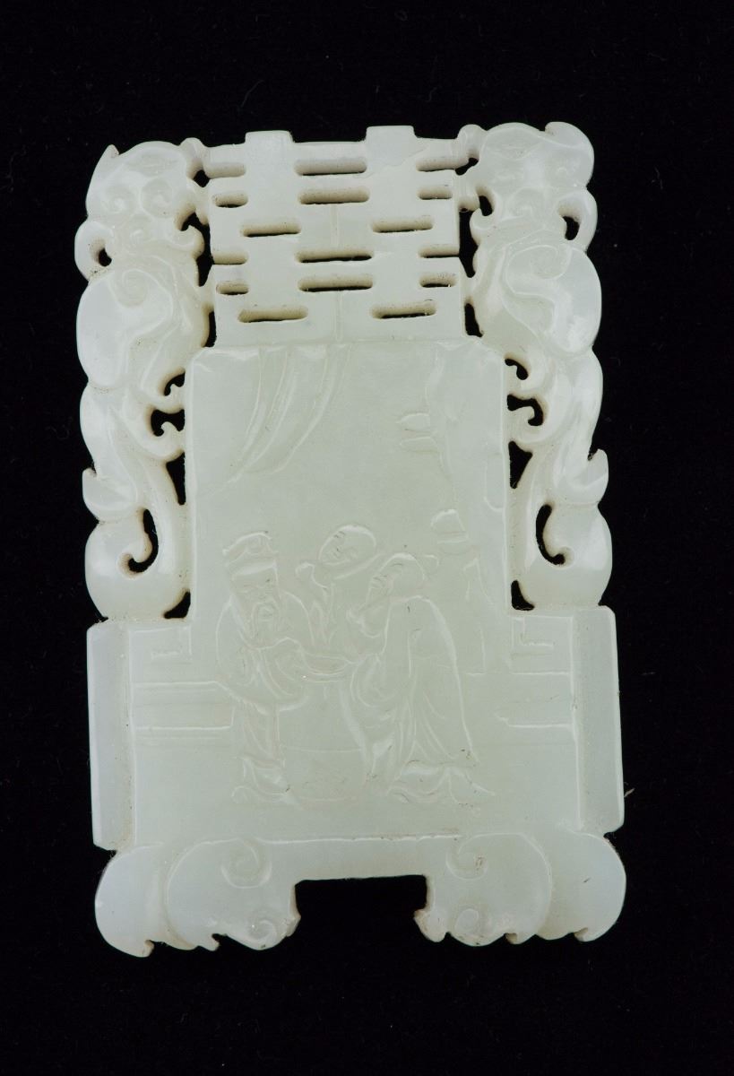Qing period, Chinese white jade square pendant, featuring open work design on top with carved court scene in low relief on one side and Chinese script on verso. L: 7 cm, W: 4.7 cm, 76 grams. Jiang Collection Toronto.