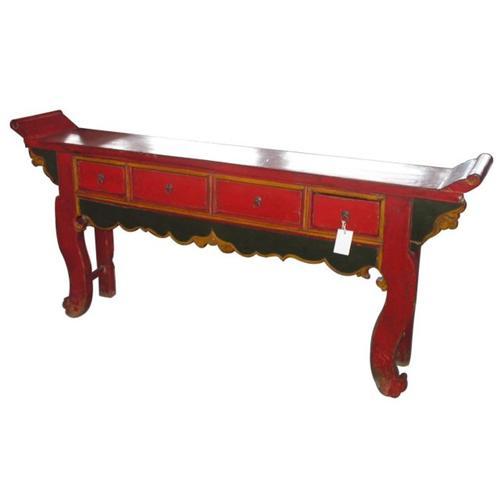 The antique furniture is a piece of exquisite chinese Qing dynasty's console table made of wood gathered from Hebei province in China.A wonderful piece for a room that can hold it.At the beginning of the Qing Dynasty, furniture followed Ming patterns and styles.Qing Furniture showed its own uniqueness with the absorption of western art. It was larger in size with grandeur and pageantry.Engraving was a popular and important means of furniture decoration. The subjects range from auspicious character patterns, to geometric patterns and scenes in nature with animals, mountains and waters, flowers and grass. Color painting, especially gold painting, was widely used.Commercial symbols emerged, such as patterns concerning money and fortune.To later Qing furniture has less engraving ,instead ,inlays of stone, porcelain and bone, which catch the eye more easily than exquisite engraving, are used to tell of the luxurious lifestyle of the owner. In addition, color and gold painting become the vogue depicting the preference for gaudiness by the wealthy.