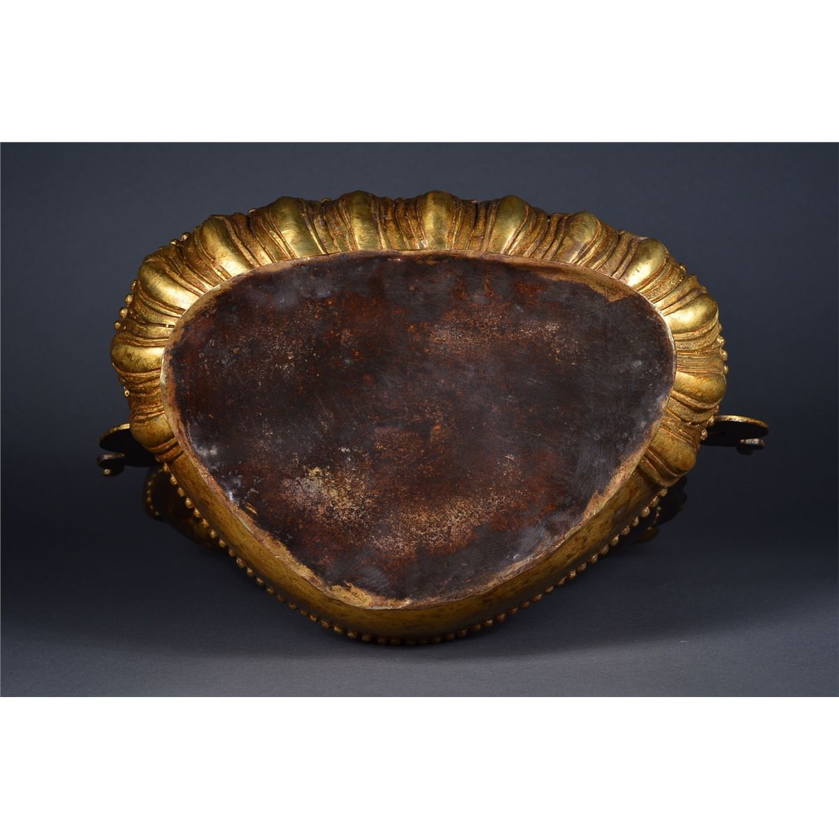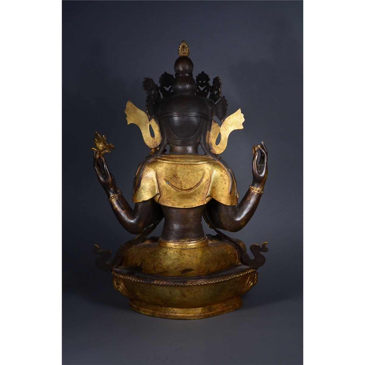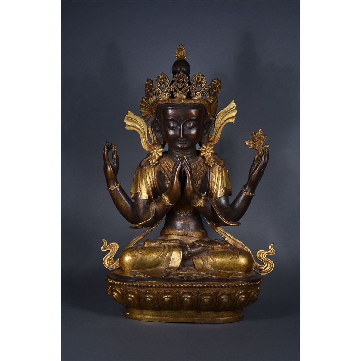Chinese Qing Dynasty bronze cast figure of Avalokiteshvara; seated in padmasana on a double lotus pedestal; wearing a flowing dhoti, shawl, and pendant earrings; the tightly curled hair and usnisa surmounted by a knop finial behind a five-leaf crown; the slender figure dressed in shawls and dhoti; H: 46 cm, L: 28 cm, W: 19 cm