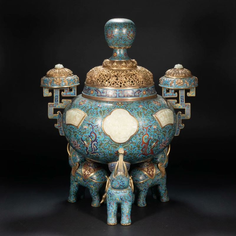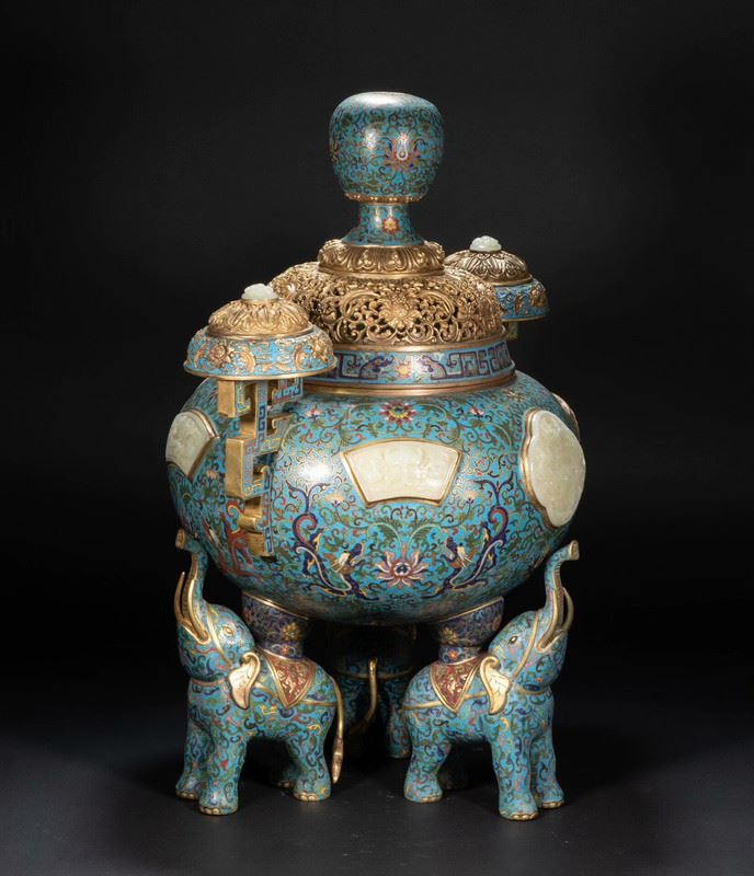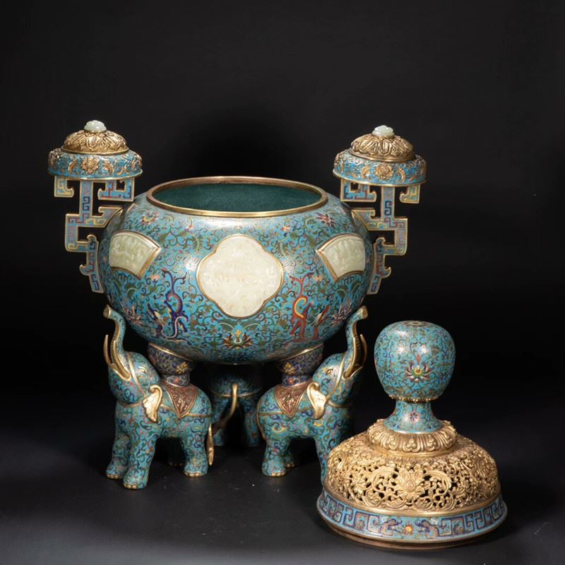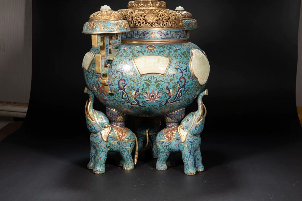 This Qing Dynasty cloisonné incense burner features four delicately crafted elephant ears as supports, showcasing the traditional craftsmanship of cloisonné decoration. The main body of the incense burner is dominated by blue tones with golden borders, creating vibrant and distinct layers of color. The metal parts are meticulously sculpted with intricate designs, emphasizing superb craftsmanship. The design reflects royal grandeur and the exquisite skills of the artisans, symbolizing good fortune and nobility.