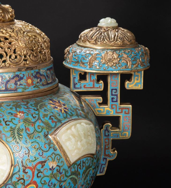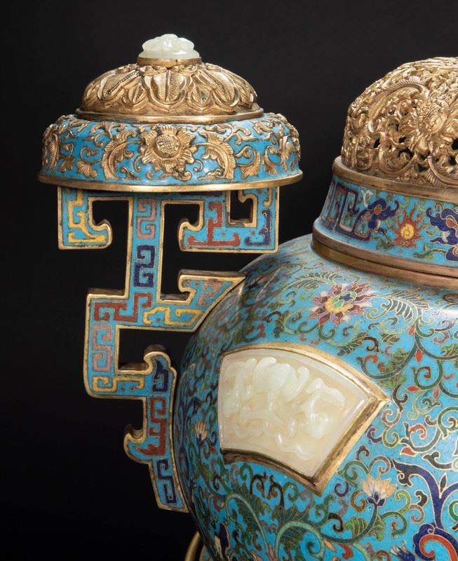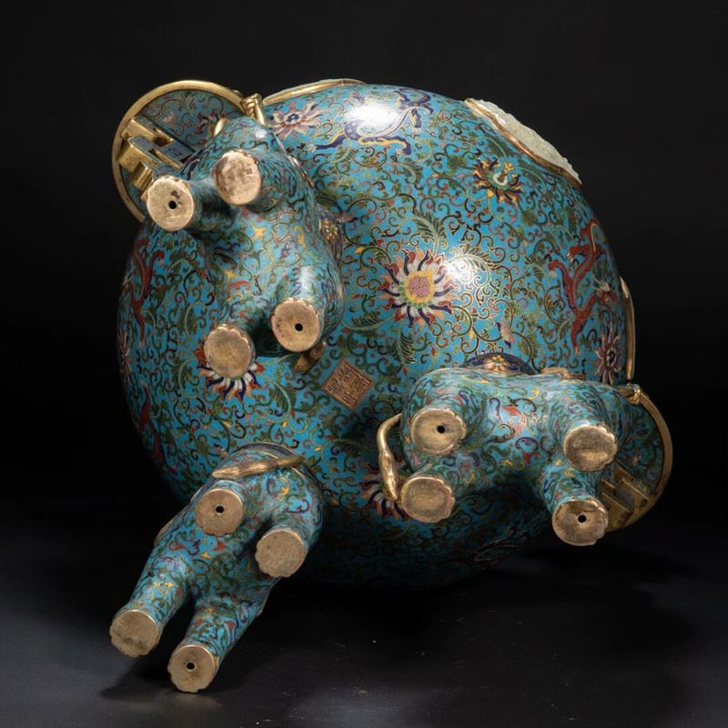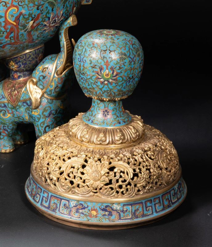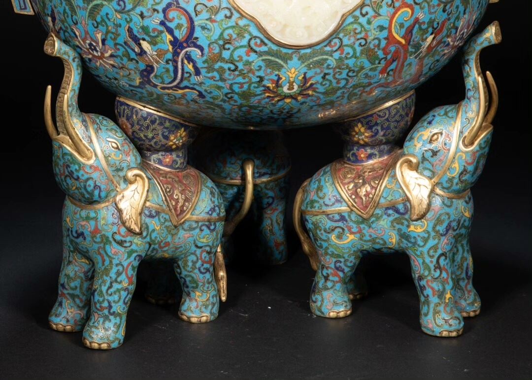 This Qing Dynasty cloisonné incense burner features four delicately crafted elephant ears as supports, showcasing the traditional craftsmanship of cloisonné decoration. The main body of the incense burner is dominated by blue tones with golden borders, creating vibrant and distinct layers of color. The metal parts are meticulously sculpted with intricate designs, emphasizing superb craftsmanship. The design reflects royal grandeur and the exquisite skills of the artisans, symbolizing good fortune and nobility.
