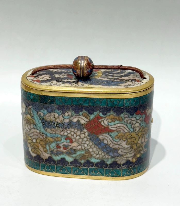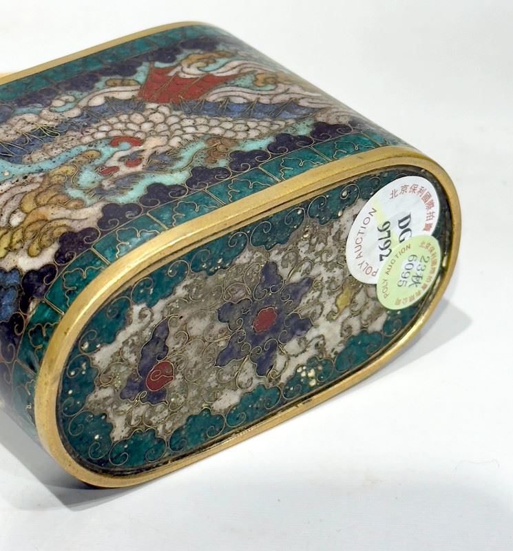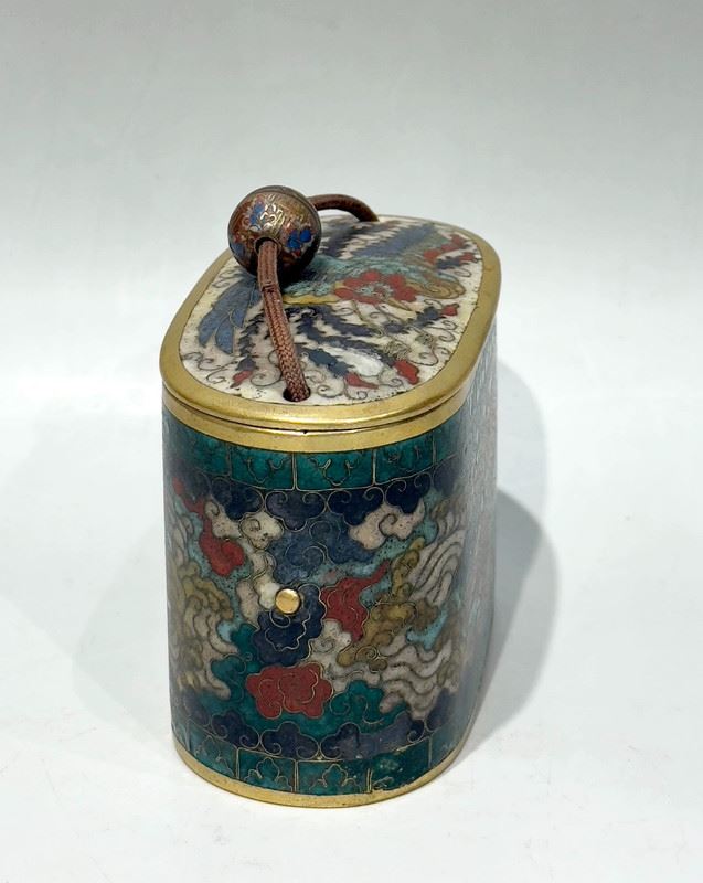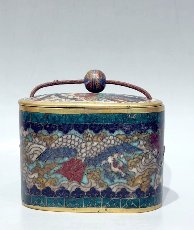 This oval rectangular cloisonné box features a deep blue ground adorned with a flying crane among auspicious clouds, symbolizing longevity and transcendence. The wings and feathers are rendered with delicate enamel colors, highlighted by gilt bronze borders. The cover is topped with a cord handle and a spherical knob for portability. With its vivid colors and refined workmanship, this piece embodies both decorative and practical functions, characteristic of Qing cloisonné artistry.