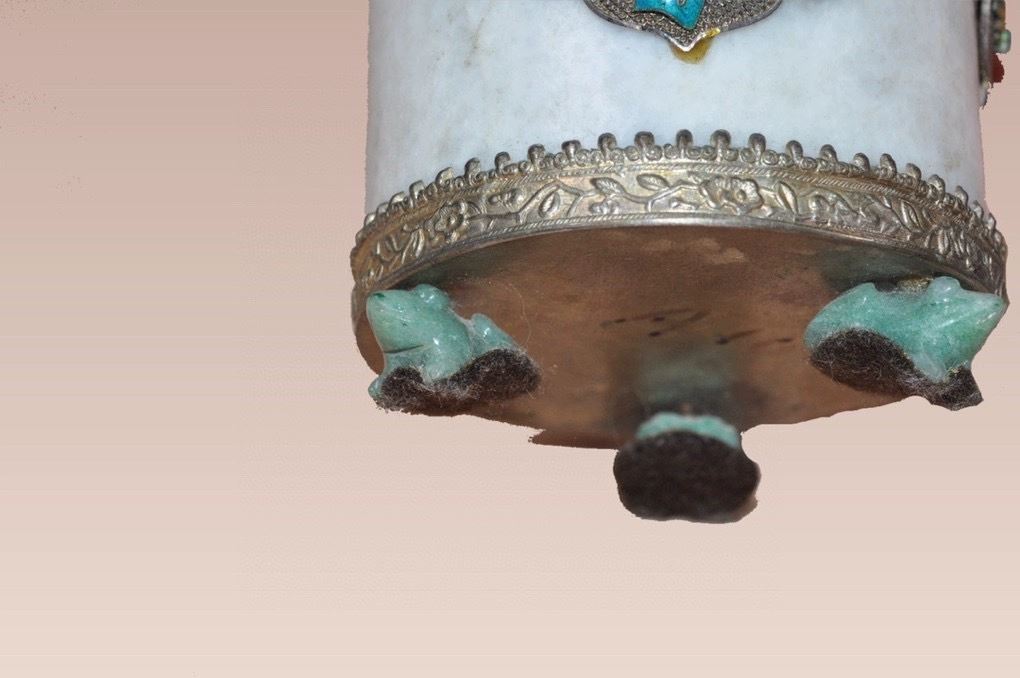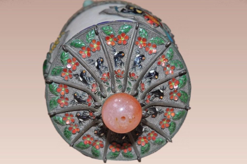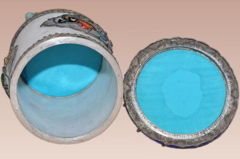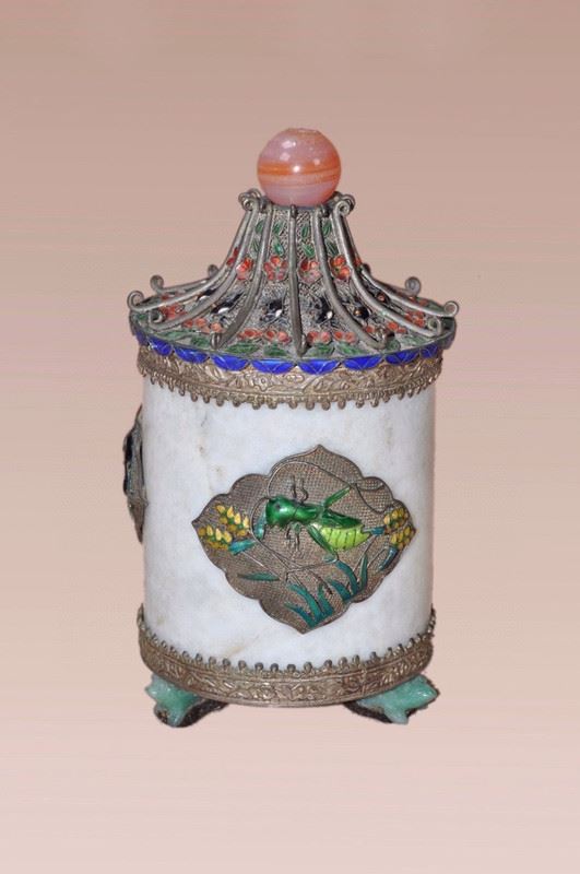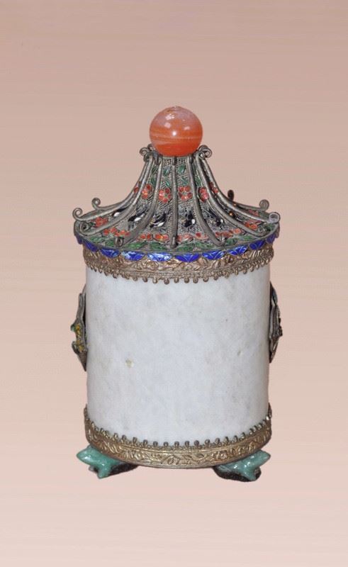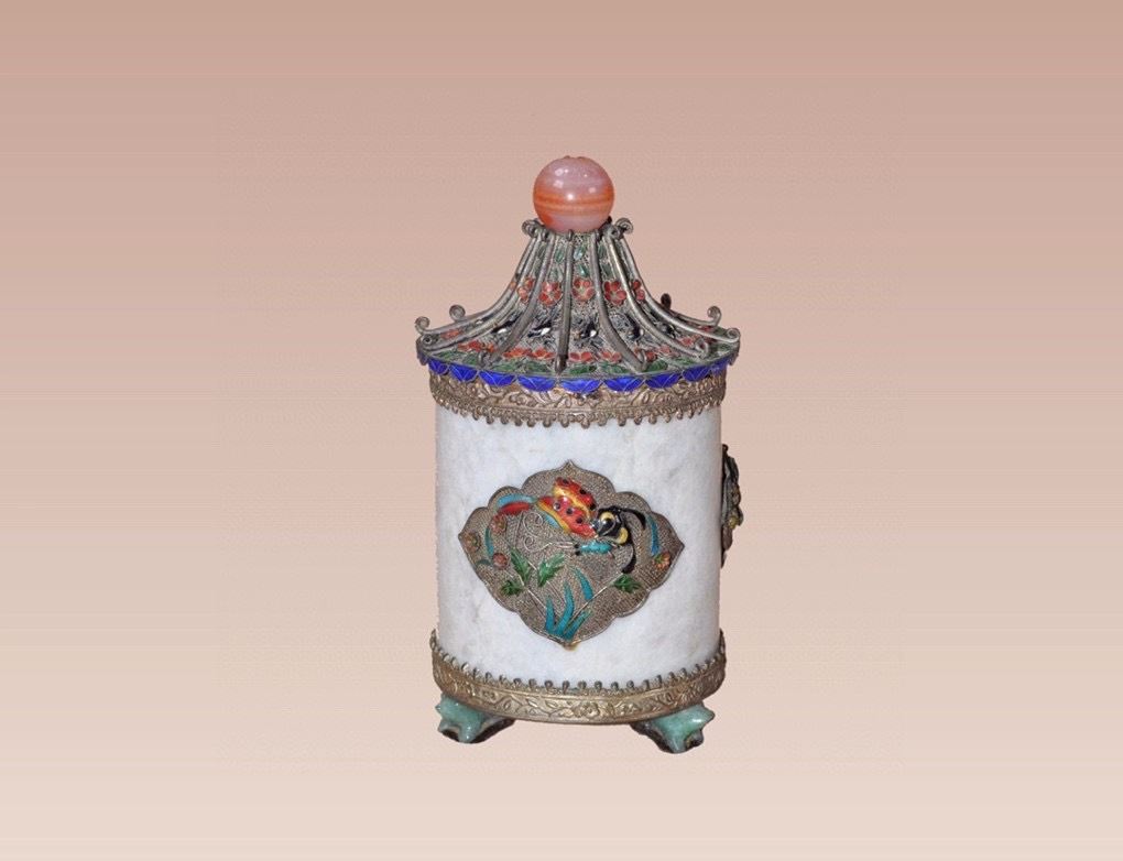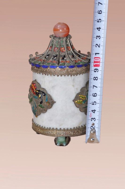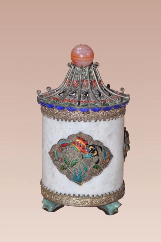 This Qing Dynasty tea caddy features a smooth white jade body, adorned with cloisonné enamel motifs of flowers and fish, painted in vibrant and auspicious colors. The lid is designed in a pagoda form, decorated with red and blue enamels, and topped with a polished agate finial, enhancing its elegance. The gilt-bronze base with four sturdy feet provides stability and grandeur. Combining the refinement of jade with the brilliance of cloisonné craftsmanship, this tea caddy is both practical and a highly collectible work of art.