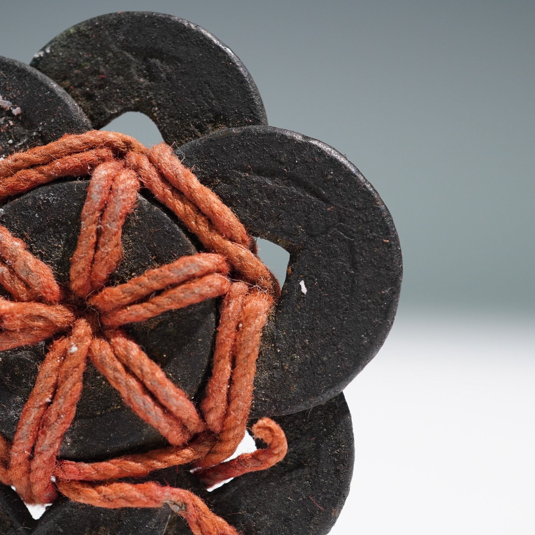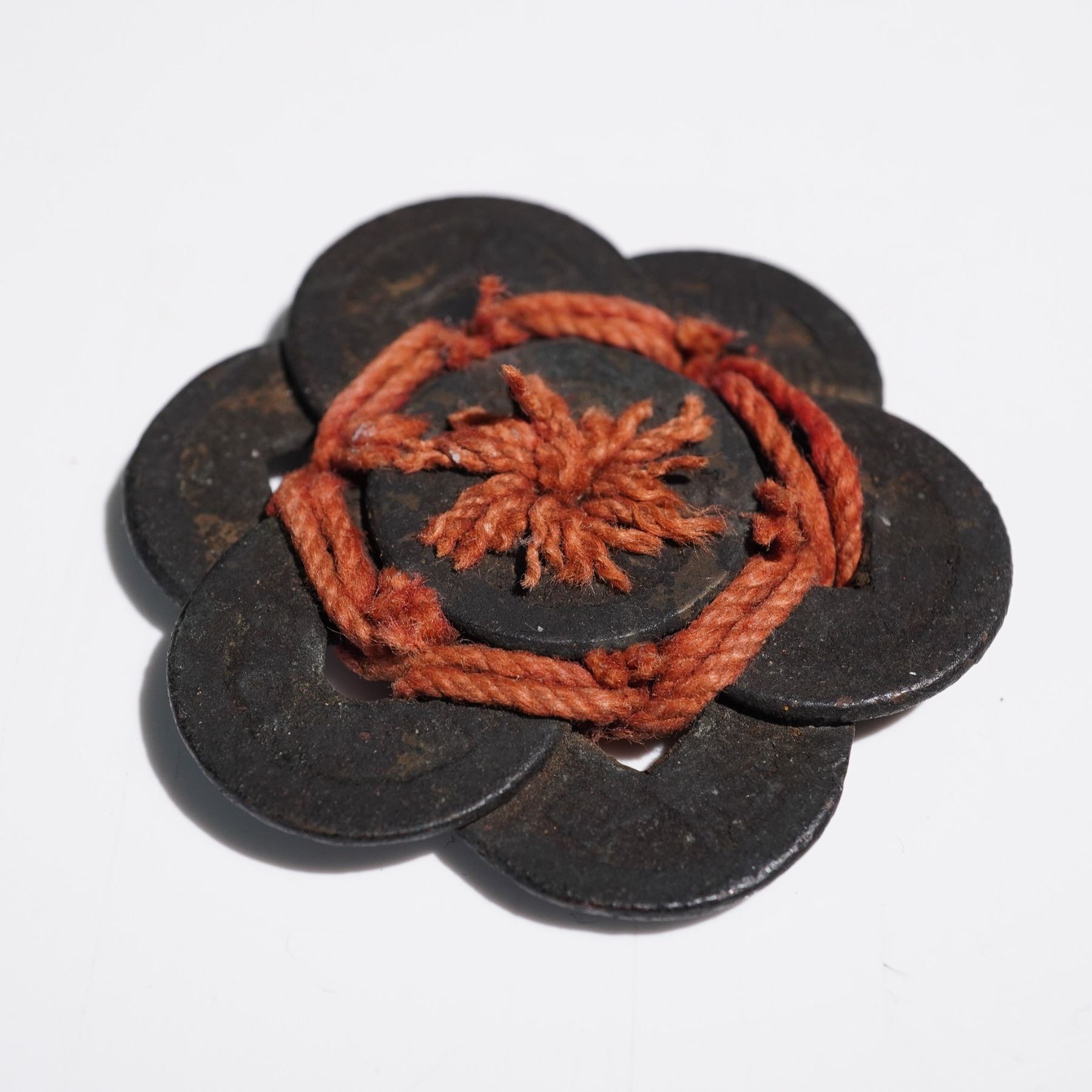 A decorative grouping of eight Chinese Qing dynasty coins arranged in a floral medallion pattern and bound together with a traditional red cord. Each cast bronze coin features a square central hole, a design common to imperial coinage spanning centuries. The red cord, symbolic of prosperity and good fortune, is woven through the center and outer rings in a star-like configuration. This arrangement may have served as a good luck charm, ritual object, or decorative talisman.