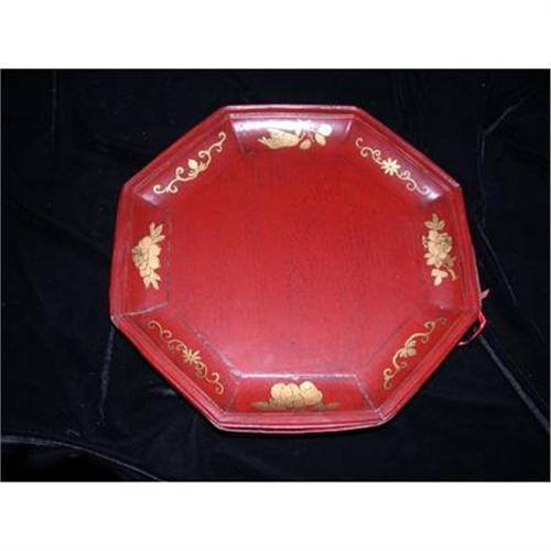 Qing Dynasty Circa 1880-1900-made of fir wood, these plates were often used during wedding ceremonies. It was used to hold nuts and snacks. This is a Groom's plate. It is octagon shaped representing the eight great celestials of buddhism. The gold leaf designs on the plate's border indicates a wealthy new beginning.  This plate has normal wear for it's age. It does have a slight separation at 1 joint. This plate is from Zhejiang and has the validation sticker on back. It measures approx. 11 1/2".