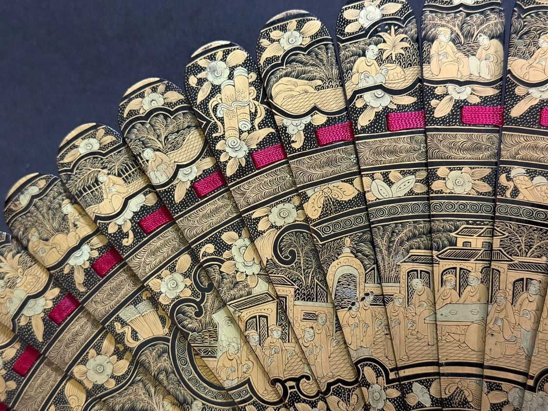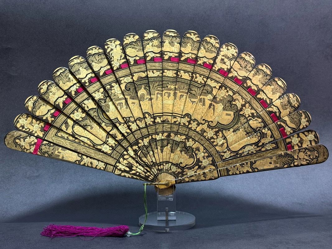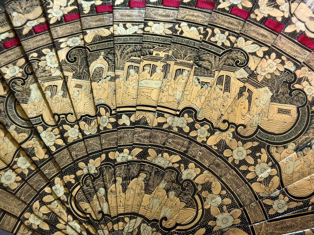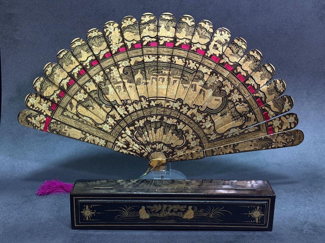 This Qing Dynasty lacquered export fan exemplifies exquisite craftsmanship, with finely carved wooden ribs finished in black lacquer and decorated with gilt paintings. The fan depicts the bustling Canton Thirteen Factories scene, featuring trading ships, foreign hongs, figures, and architecture, vividly illustrating the prosperity of the period. The golden lines are finely executed with a clear sense of depth, showcasing the mastery of Qing export lacquerware. Such fans were not only practical accessories but also important witnesses to Sino-Western trade and cultural exchange, making them highly valuable collectibles.