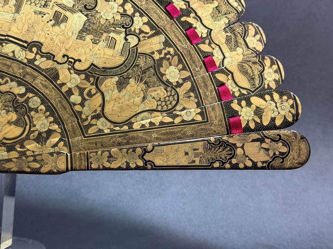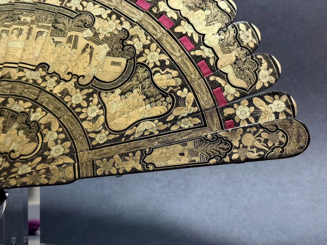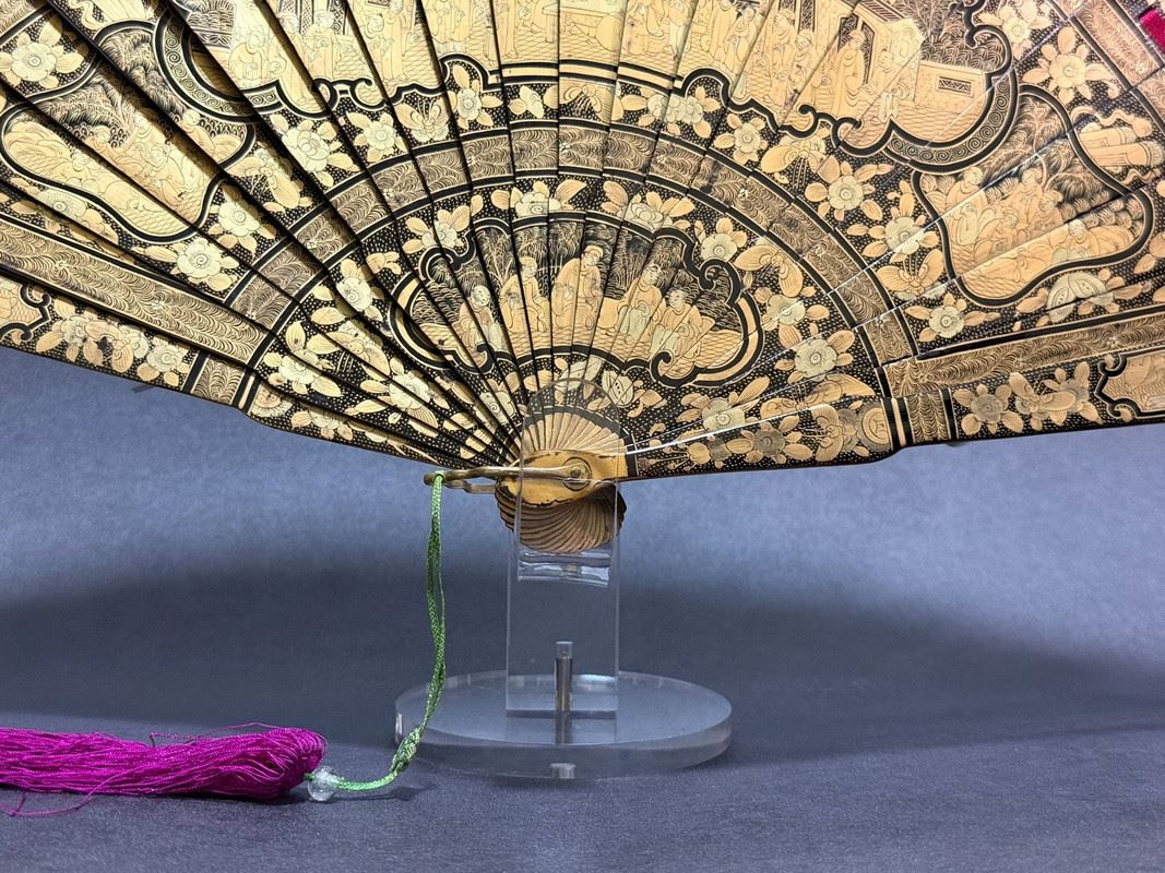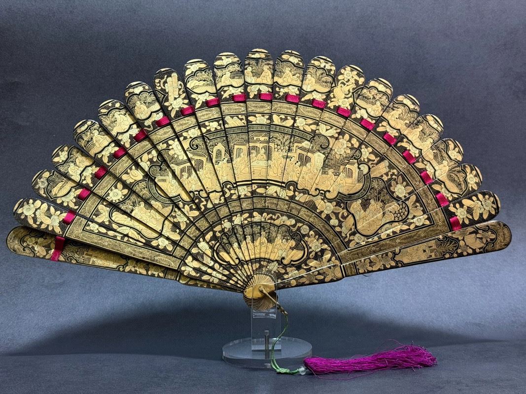 This Qing Dynasty lacquered export fan exemplifies exquisite craftsmanship, with finely carved wooden ribs finished in black lacquer and decorated with gilt paintings. The fan depicts the bustling Canton Thirteen Factories scene, featuring trading ships, foreign hongs, figures, and architecture, vividly illustrating the prosperity of the period. The golden lines are finely executed with a clear sense of depth, showcasing the mastery of Qing export lacquerware. Such fans were not only practical accessories but also important witnesses to Sino-Western trade and cultural exchange, making them highly valuable collectibles.