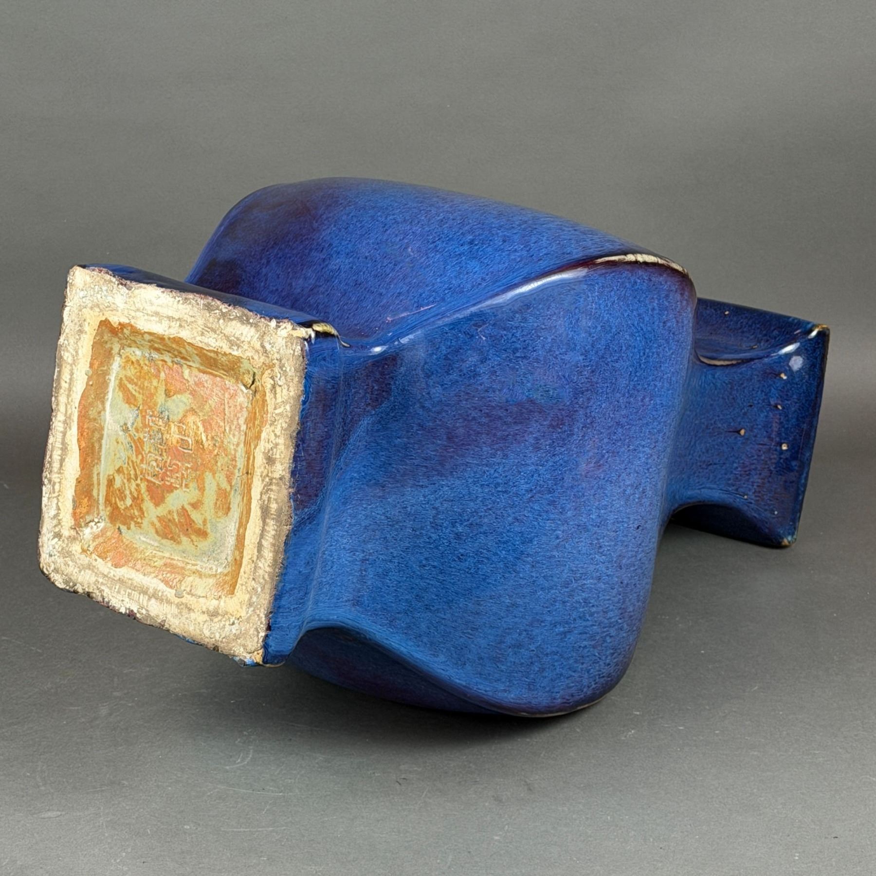 This ceramic vessel is a quadrangular pear-shaped vase featuring a swelling lower body that tapers to a waisted, flared neck with a square-profile rim. The item is identified as being in the satsume style and is finished in a thick, rich flambe glaze. The coloration is predominantly a deep, mottled cobalt blue with prominent streaks and patches of purplish-red effects, achieved through a high-fire copper-red derivative technique. Where the glaze thins at the rim and along the vertical corner ridges, it transitions to a translucent brownish-olive or cream tone. The vessel sits on a short, slightly splayed square foot. The recessed base features an impressed six-character mark in seal script arranged in two vertical columns of three characters each, reading Da Qing Yong Zheng Nian Zhi. A horizontal line is visible circling the midsection of the vase, representing a firing seam where the two halves of the vessel were joined.