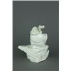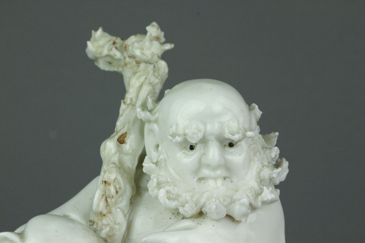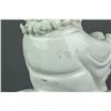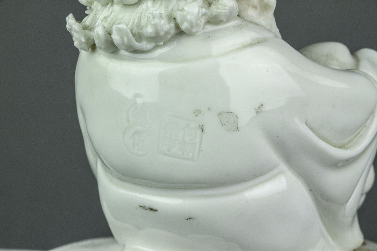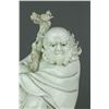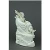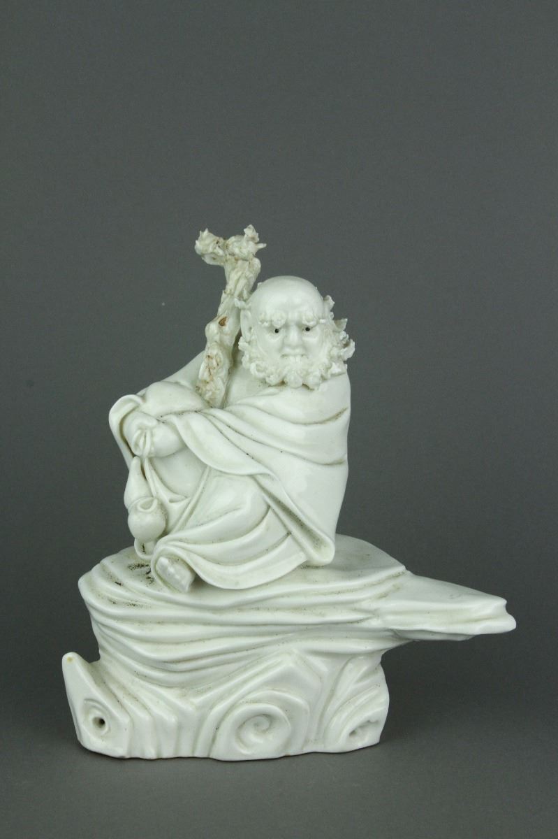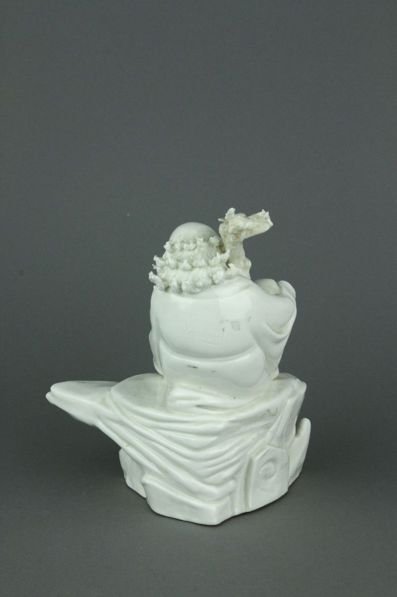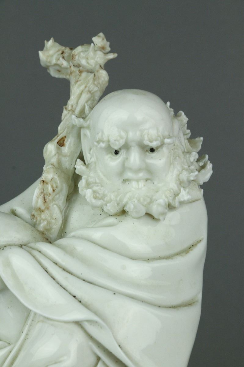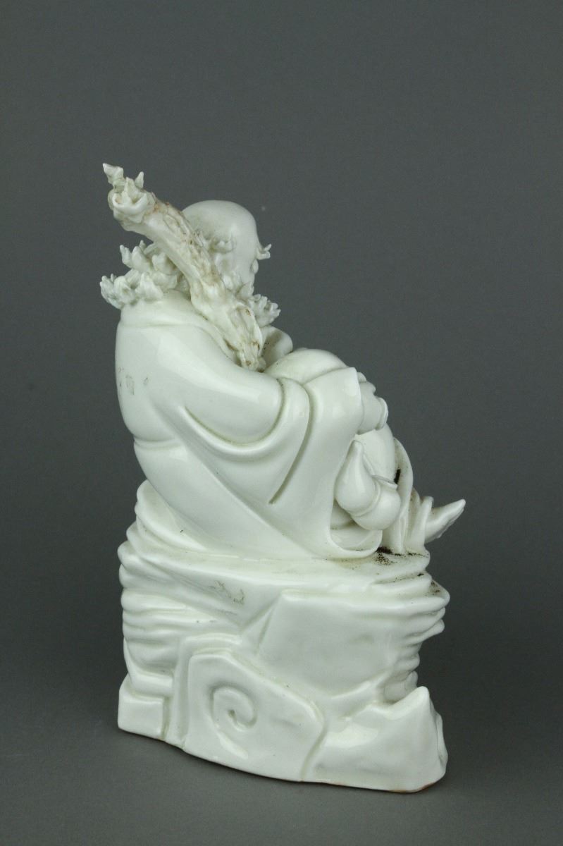Chinese Dehua blanc de chine porcelain figure; featuring Damo Bodhidharma seated with his walking stick on a jagged rock; with Dehua artist seal on back; H 17 cm x W 9 cm x L 14.5 cm, 681 grams