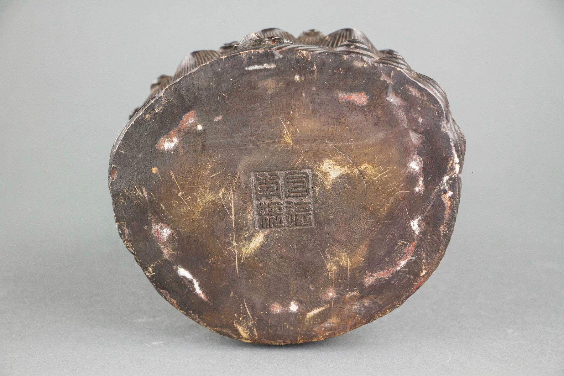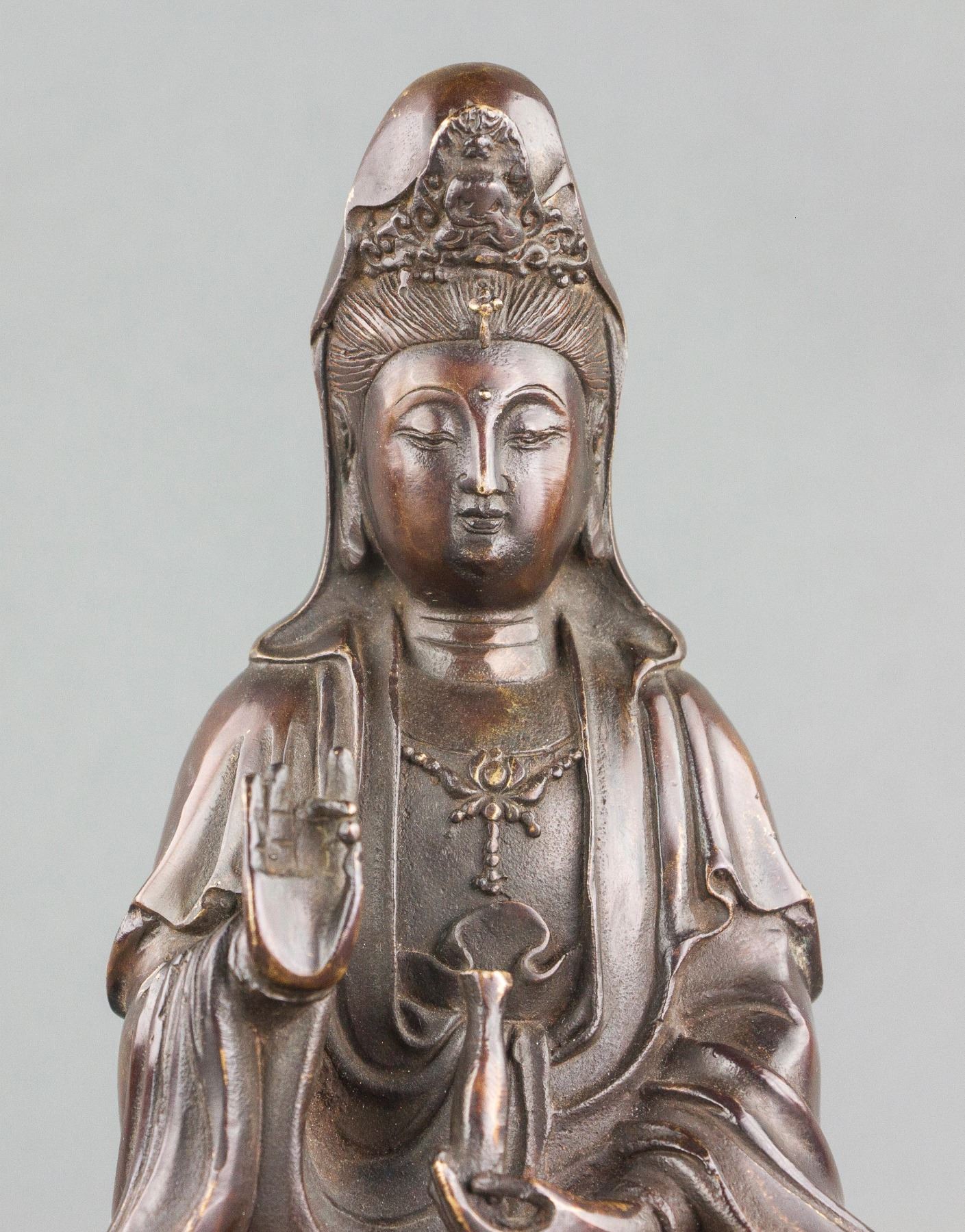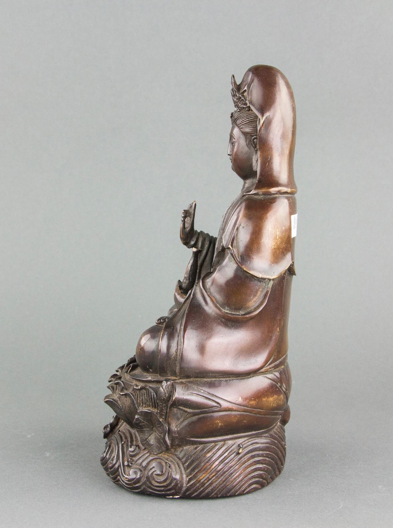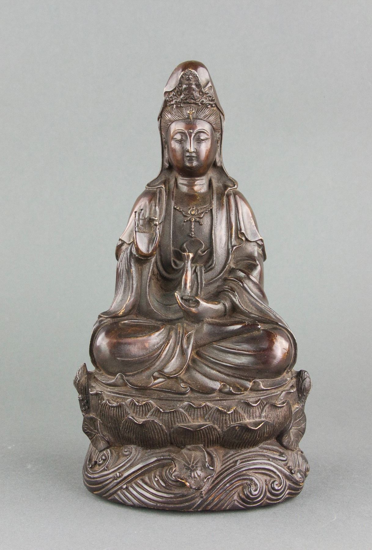 Chinese bronze Guanyin figure; depicting Guanyin sitting on lotus pedal base with Jinpin; four-character Xuande mark on base; Qing period; 24 cm x 13 cm, 1729 grams