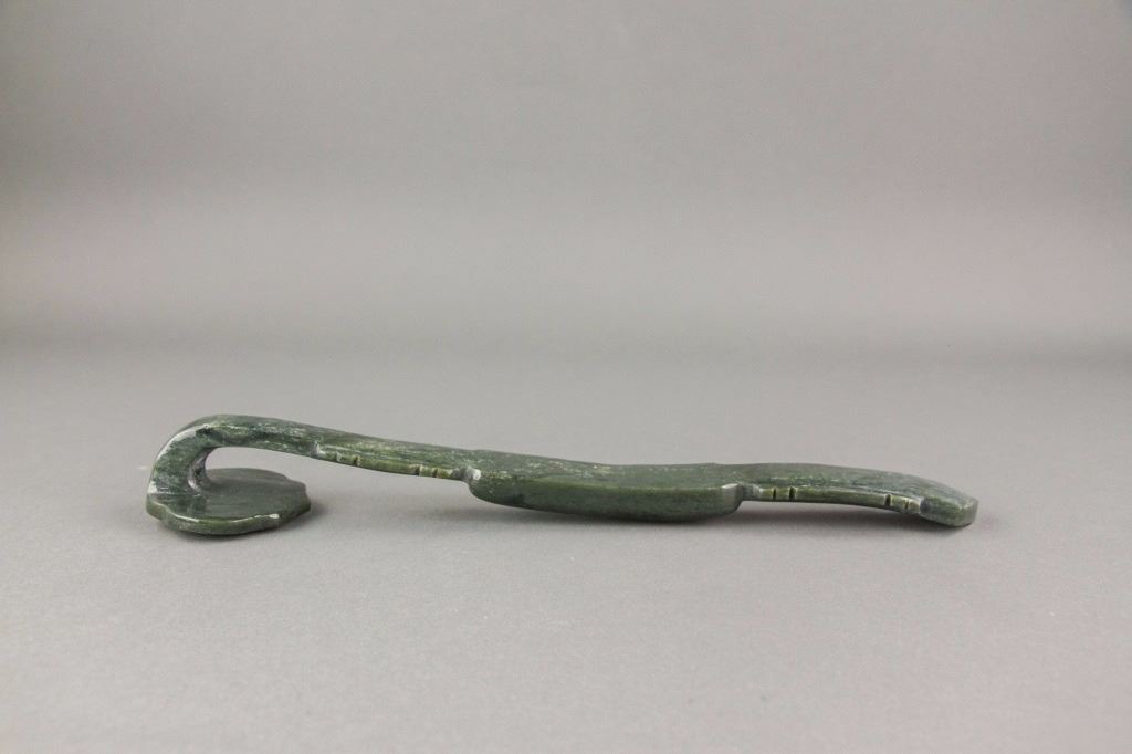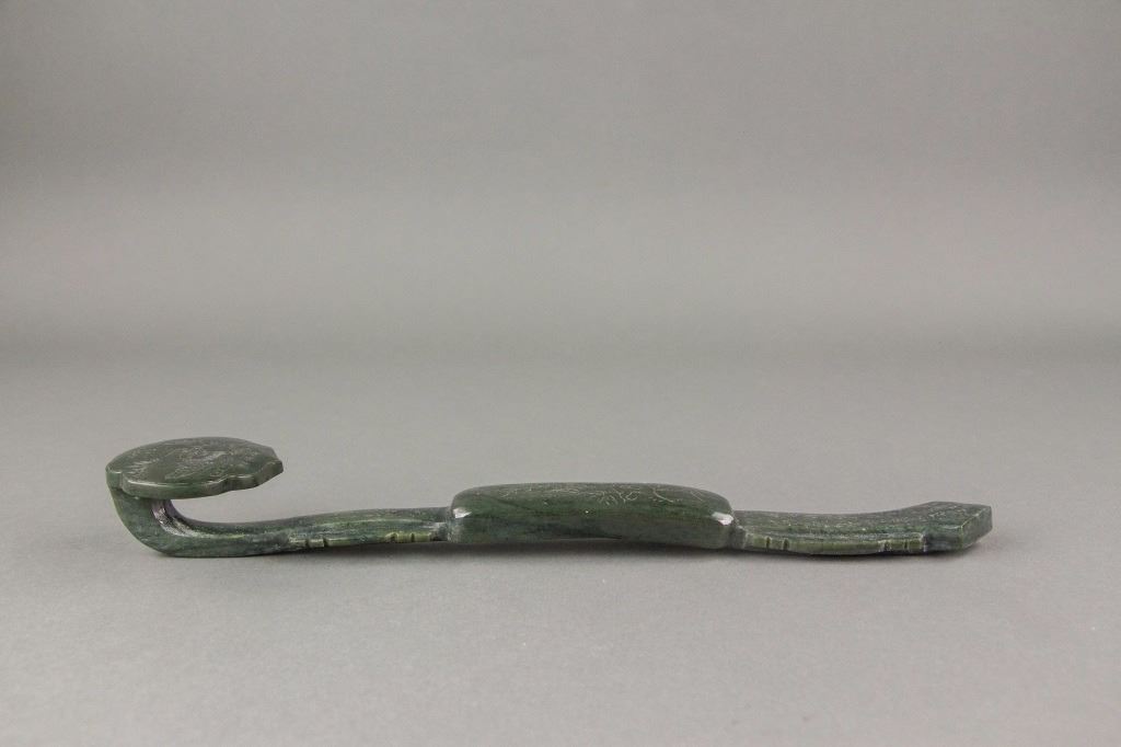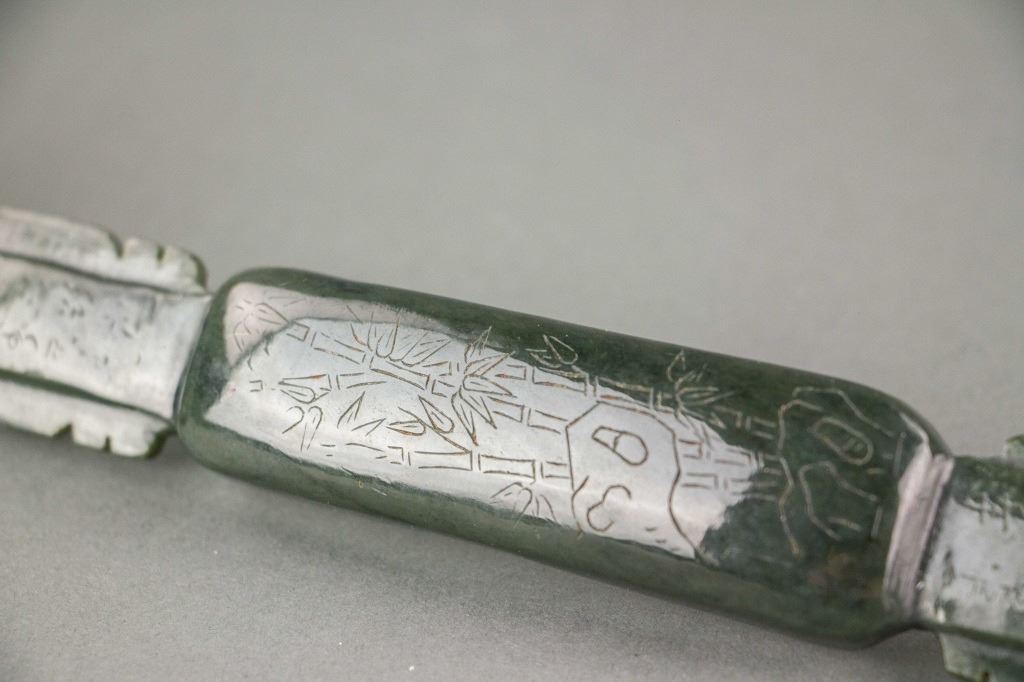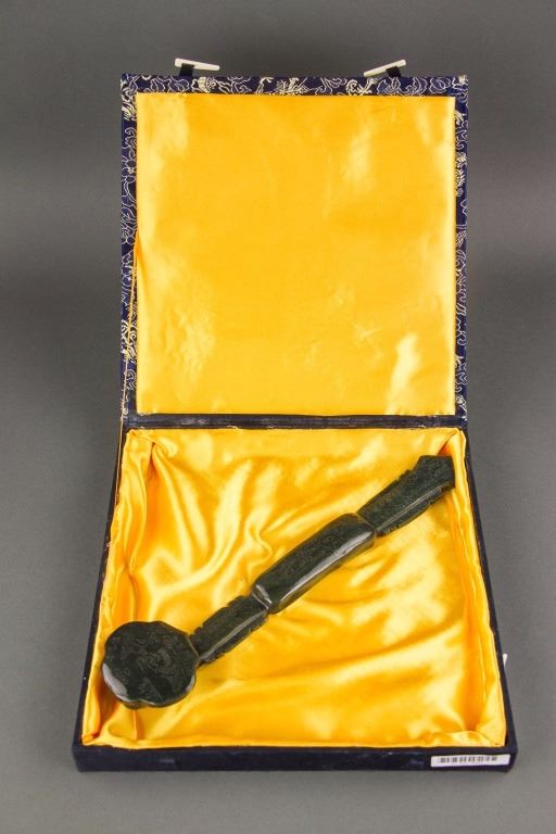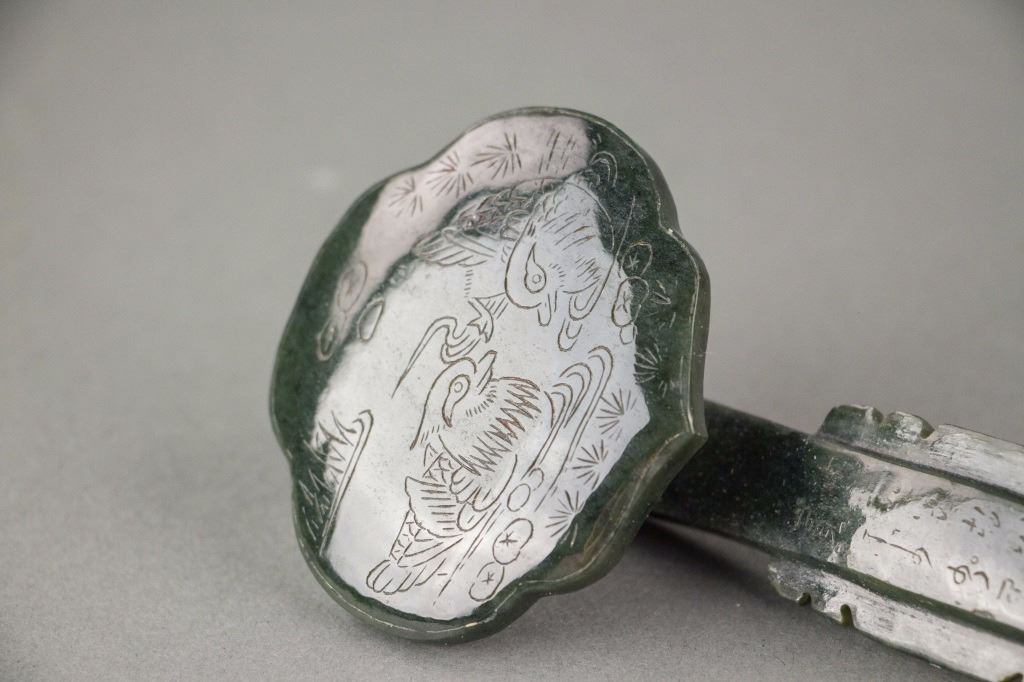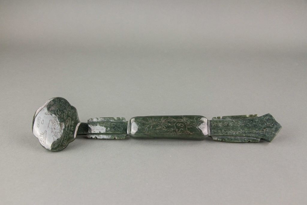 Chinese green jade carved ruyi scepter; comprised of a long handle and cloud shape top; carved with bamboo and mandarin ducks decoration; with carved Manchu and Chinese character on bottom; accompanied with a box; Qing period; W: 6.5 cm, L: 29 cm, 285 grams