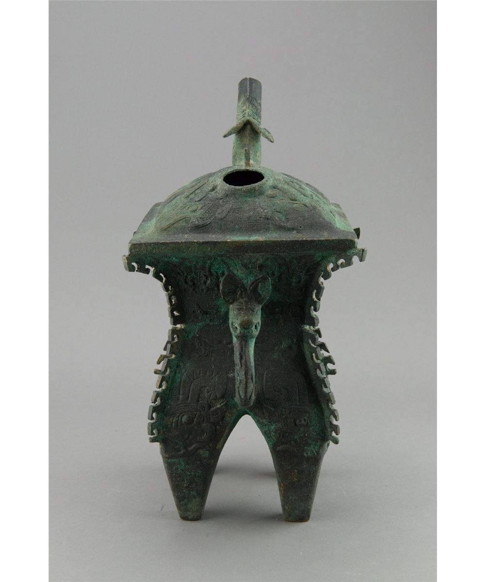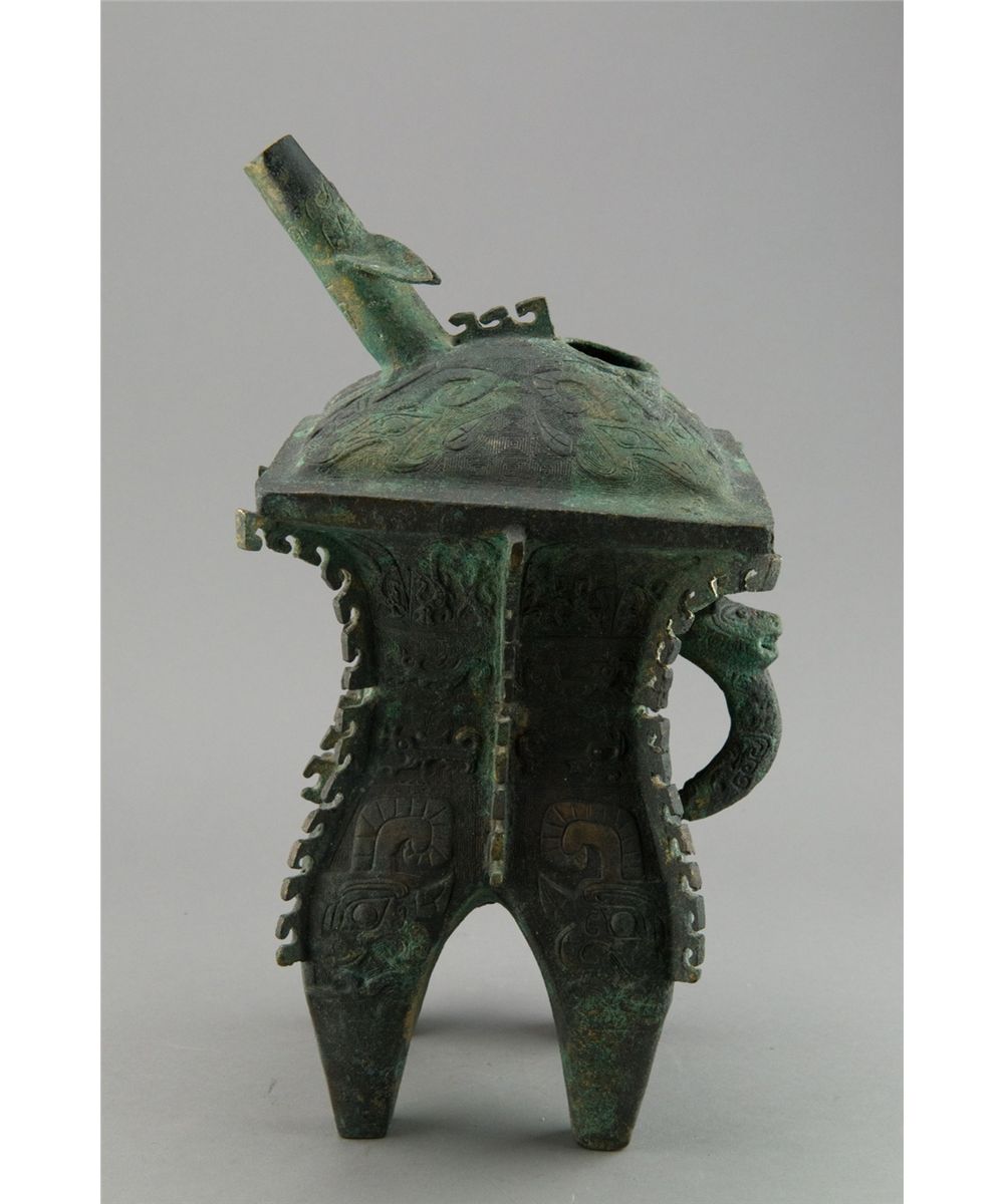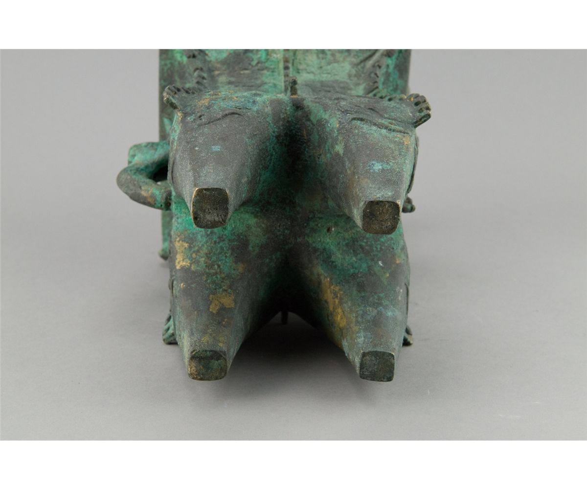 Qing period, Chinese patinated bronze waterpot, with archaic carvings and etched border, supported on four foot. 34 cm x 13 cm, 3.5 kg
