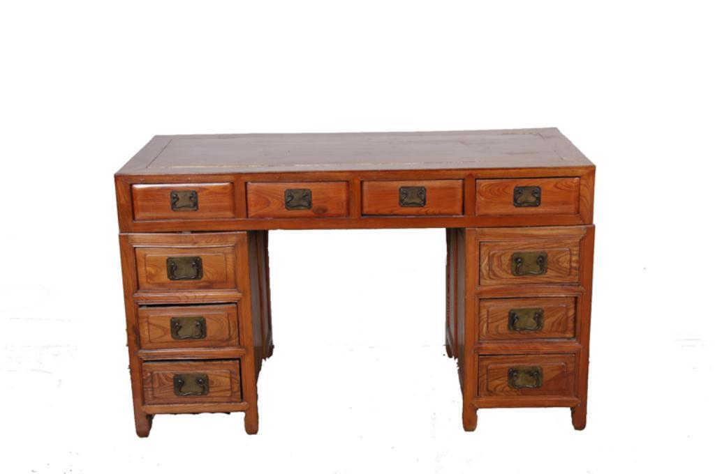 Qing Writing Desk Made of elm, measures 29"x52"x24", undecorated three piece desk with miter joints, four drawers across the top section and three drawers in each side section, all drawer edges are beveled and have unusual dovetail like joints. ConditionMade of elm, measures 29"x52"x24", undecorated three piece desk with miter joints, four drawers across the top section and three drawers in each side section, all drawer edges are beveled and have unusual dovetail like joints. Condition isfair overall with large joint shrinkage and cracks.