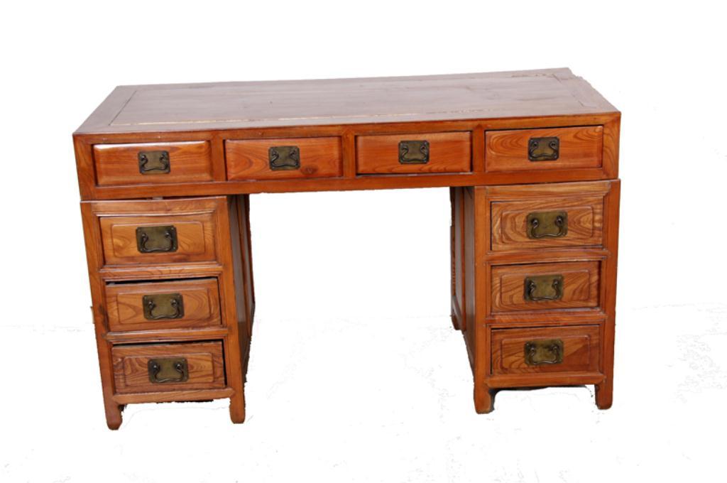 Qing Writing Desk Made of elm, measures 29"x52"x24", undecorated three piece desk with miter joints, four drawers across the top section and three drawers in each side section, all drawer edges are beveled and have unusual dovetail like joints. ConditionMade of elm, measures 29"x52"x24", undecorated three piece desk with miter joints, four drawers across the top section and three drawers in each side section, all drawer edges are beveled and have unusual dovetail like joints. Condition isfair overall with large joint shrinkage and cracks.