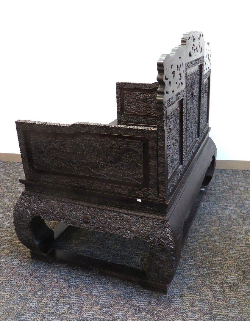 Throne chair, elaborately carved with dragons, clouds, and flaming pearls. The chair back has hardstone scenes of birds and flowering trees, and hardstone calligraphy. The reverse of the panel is delicately carved with dragons. Has repaired age cracks. R