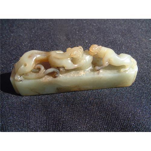Qing period green jade carving in shape of 2 facing hydra dragons on a rectangular base, with the flaming pearl in between them . High relief carving with miniature details of carving in open work. Length: 3.5" (9 cm.), width: 0.8" (2 cm.), height: 1.5" (3 cm.). Estimated market value: $2.000. From Dr. Veleanu's collection, the author of the collectors' textbook: "Jade, 5000 BC to 1912 AD, Guide to collectors".