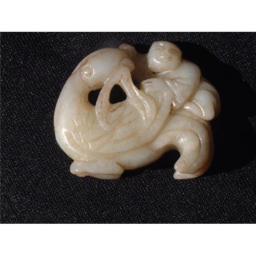 Antique mutton fat white jade carving in shape of a boy riding a giant bird holding a sprig in its beak. It dates to Qing period and is in perfect condition for its age. Size: 2.2" X 2" (5.5 cm. X 5 cm.). High quality of white jade with almost no inclusions present.