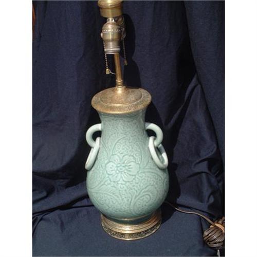 18th. century large celadon glaze vase with incised underglaze "claire de lune" decorations having a floral pattern. The handles have mock rings. This vase was transformed in a lamp in 20th. century. Height: 13" (33 cm.). Diameter at opening: 6" (15 cm.). Estimated value: $5000.
