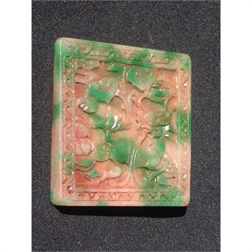 Qing period, 18th.-19th. century large rectangular jadeite plaque carved in high relief with ling zhi and lotus. The carving is done with master lapidary skills in greenish-red jadeite that is flawless. Dimensions: 4" X 4" (10 cm. X 10 cm.). Estimated value: $6.000-8.000. Provenance: Dr. Veleanu's jade collecton, the author of the collectors' textbook: "Jade, 5000 BC to 1912 AD, Guide to collectors".