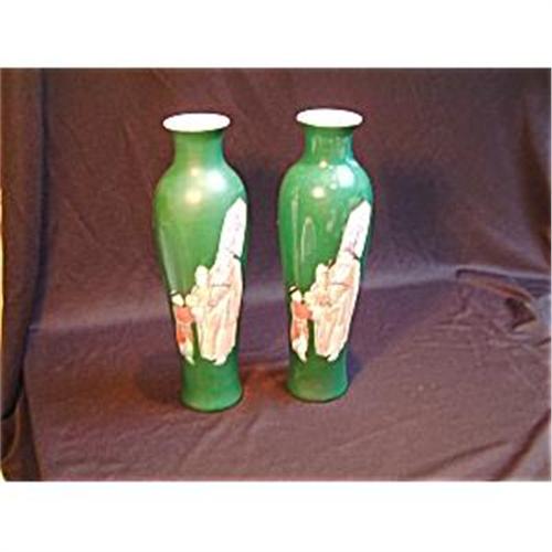 19th. century green vases with figural design. Size: height: 12.7 inches. Diameter at the vase mouth: 2.5 inches. Estimated value: $3.000.