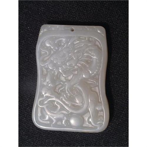 Exquisite 19. century CE mutton fat white jade pendant decorated with a dragon seeking tama. The reverse side is decorated with 2 incised characters. Highest quality of mutton fat white nephrite jade, free of inclusions and having a homogeneous color, dating to Qing period. Size: 2" X 1.5" (5 cm. X 4 cm.). Provenance: Dr. Veleanu's jade collection, the author of collectors' illustrated textbook: "Jade, 5000 BC to 1912 AD, Guide to collectors".
