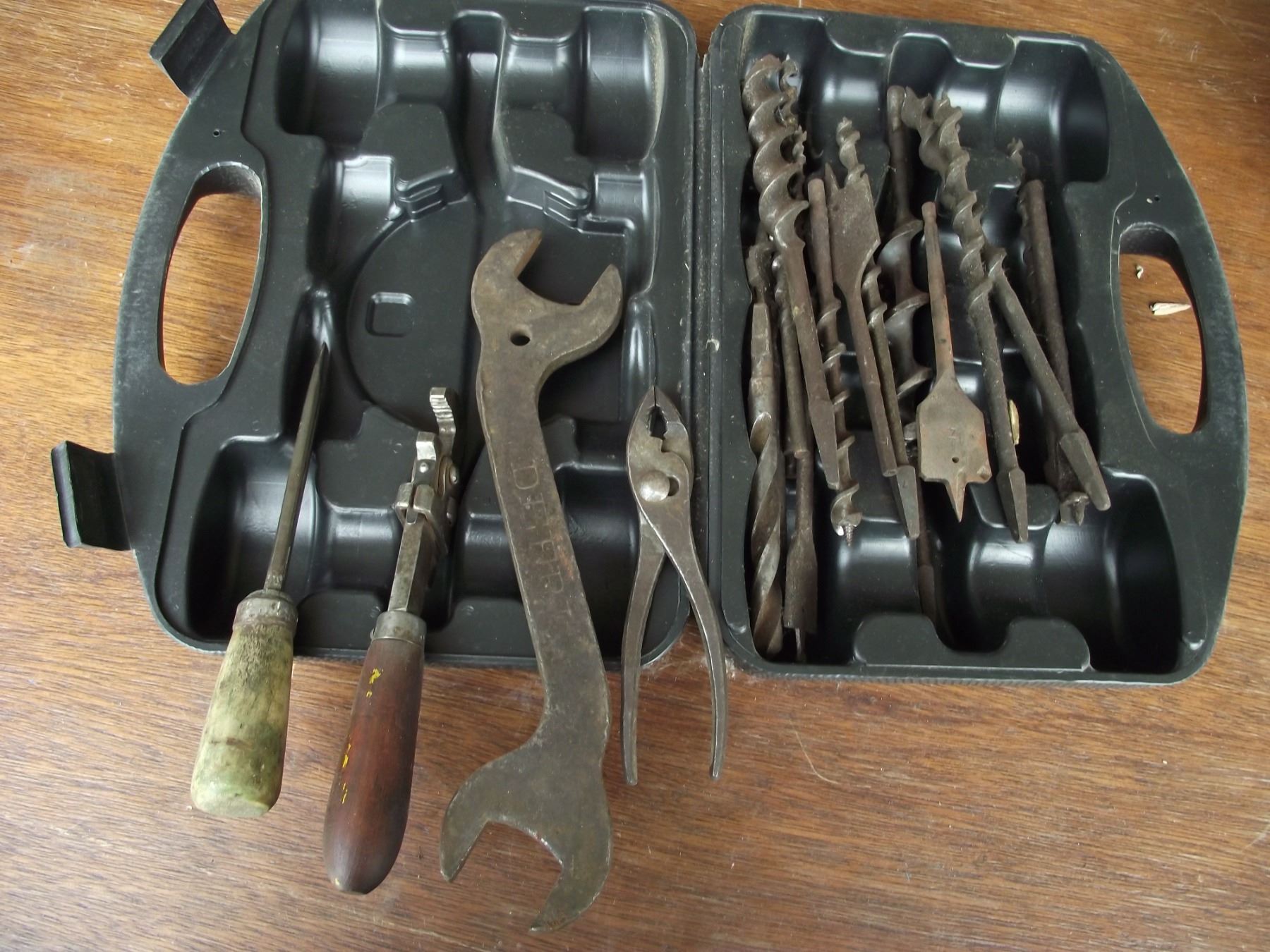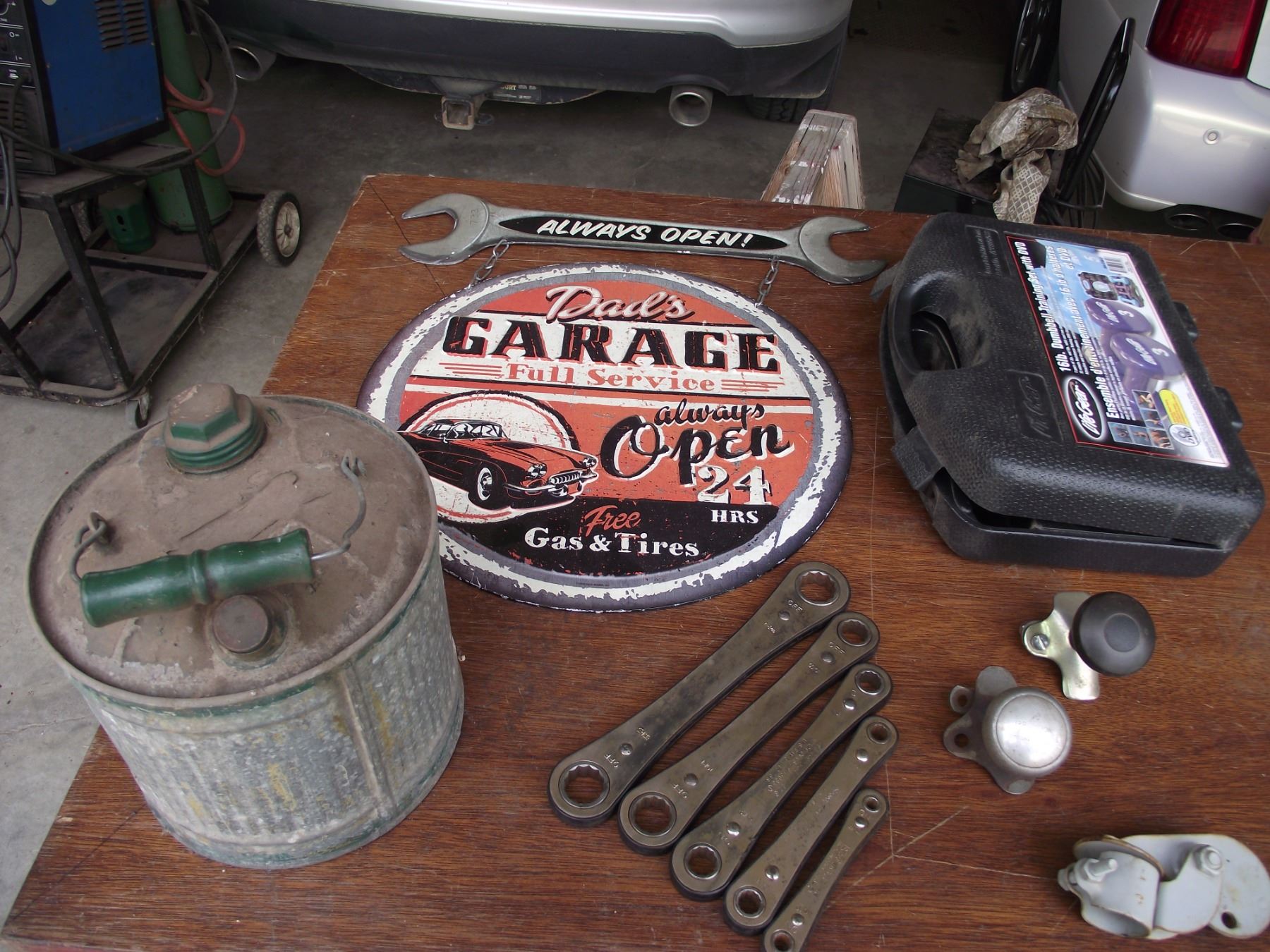 Qty of antique items, gas can, drill bits, wrenches, sign, wheel spinner and rain cap.