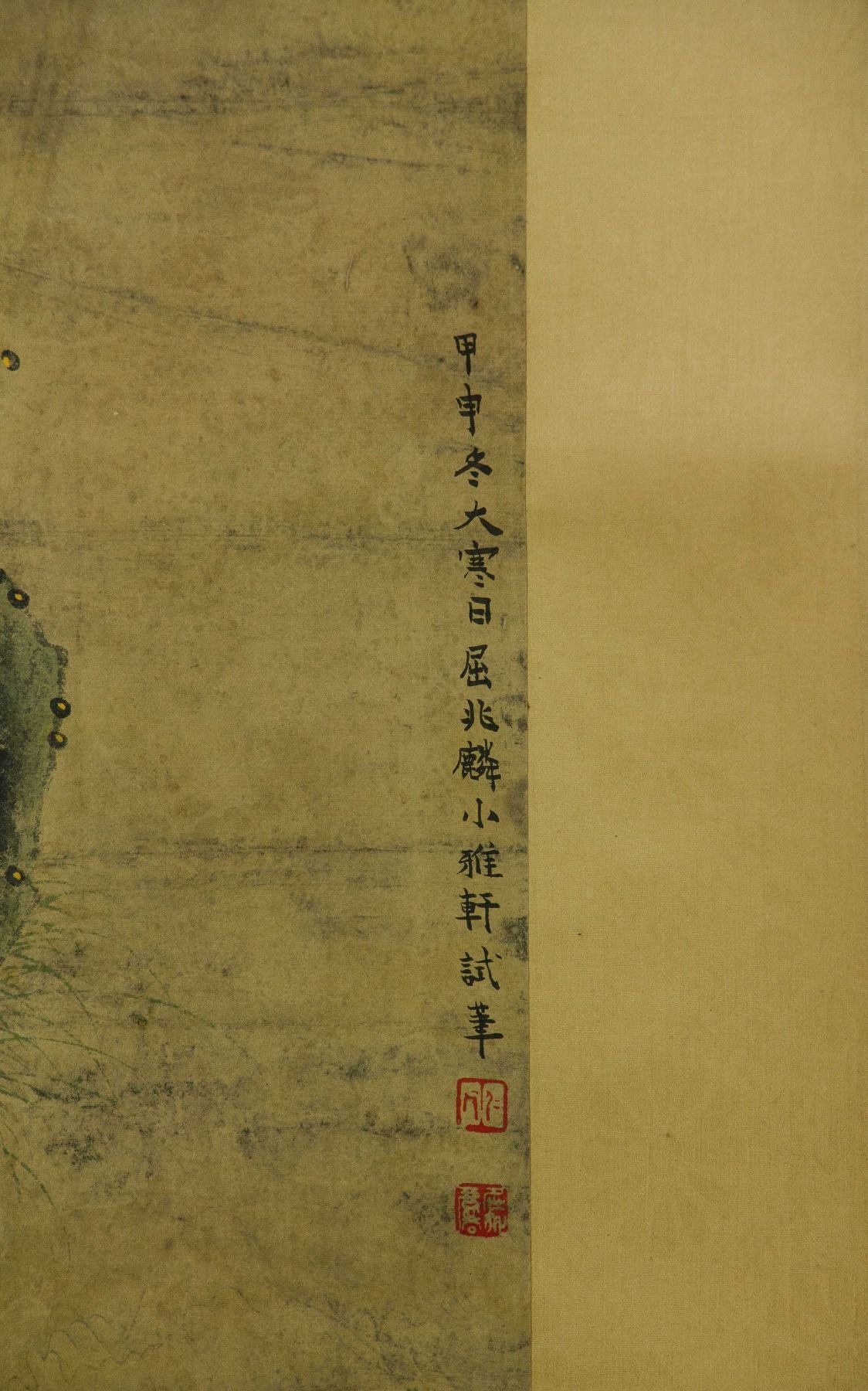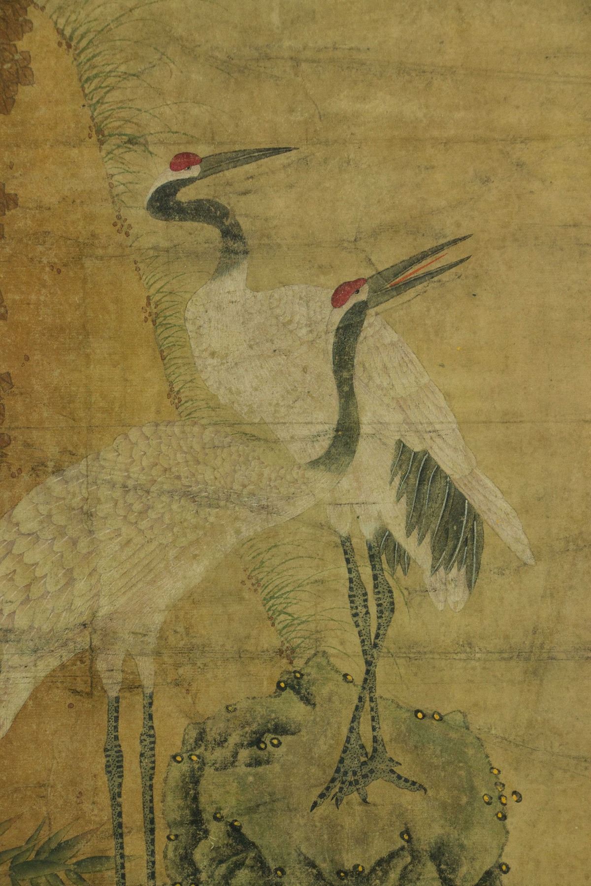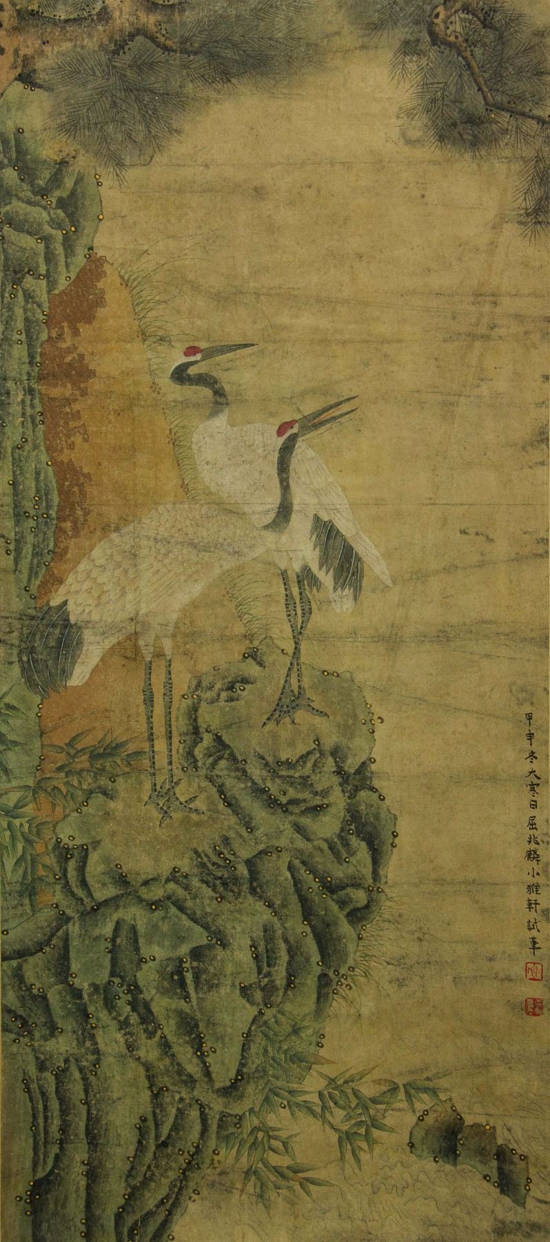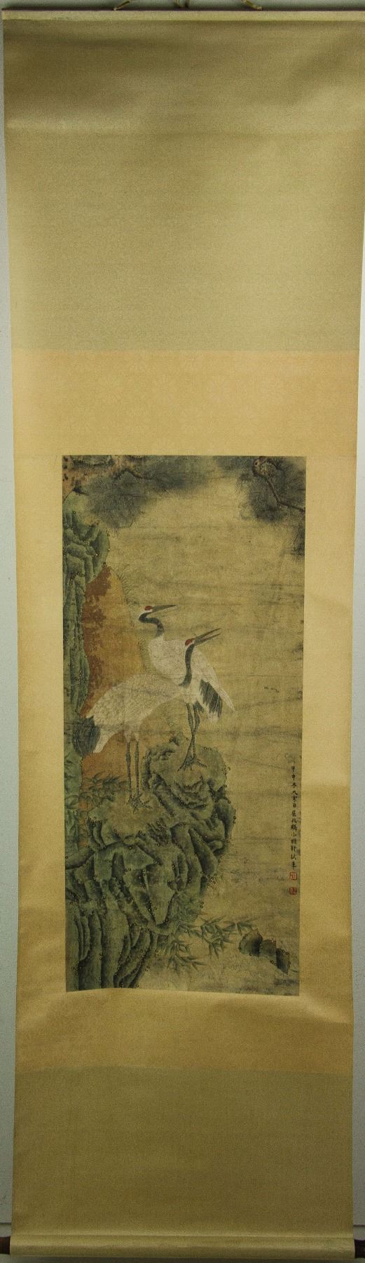 Cranes perched on craggy rocks; Chinese ink and watercolour on paper; hanging scroll; signed Qu Zhaolin (1866-1937); inscribed with two artist seals; 207 cm × 59 cm