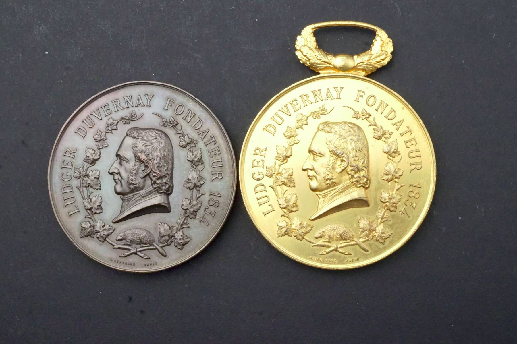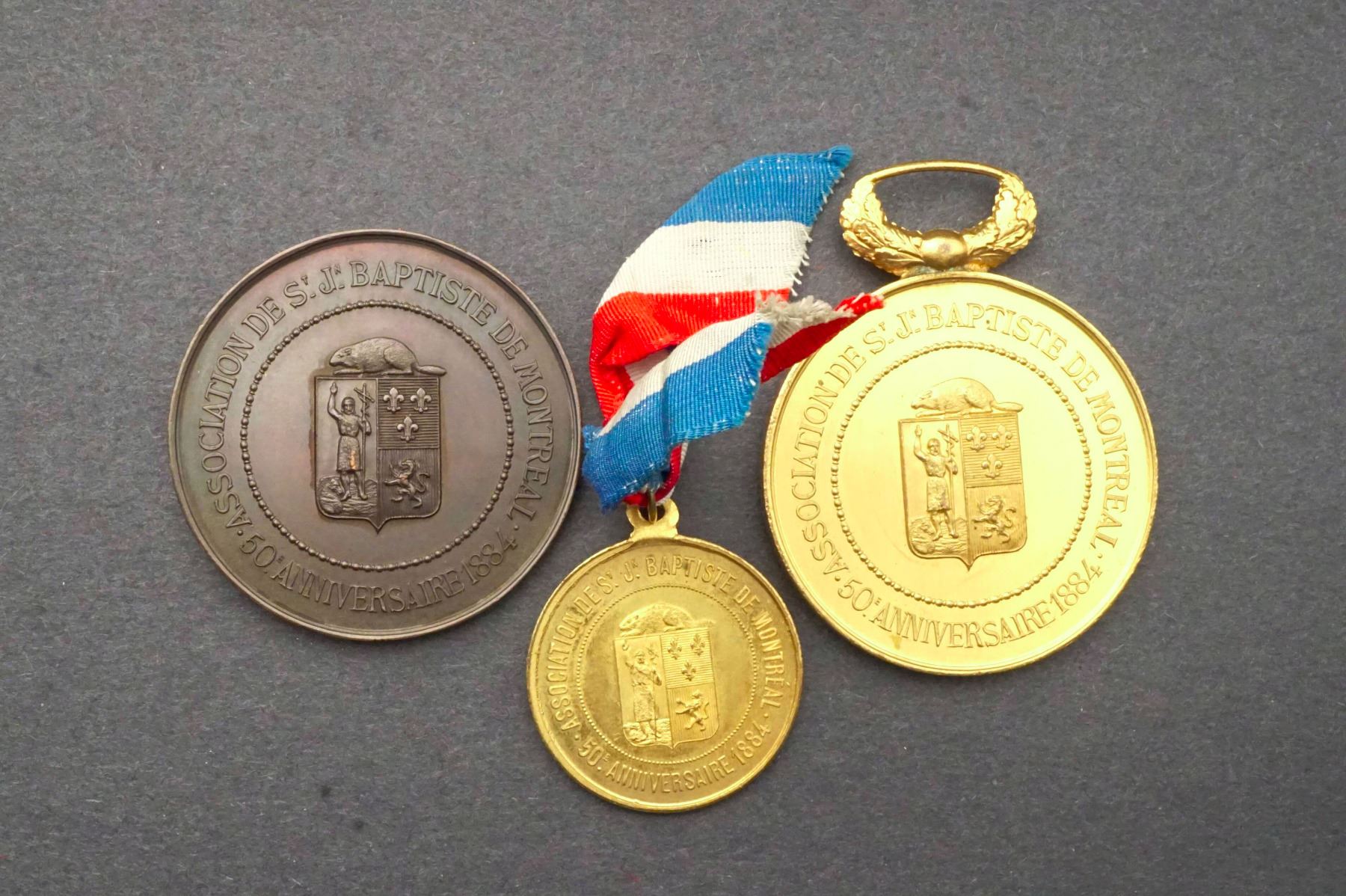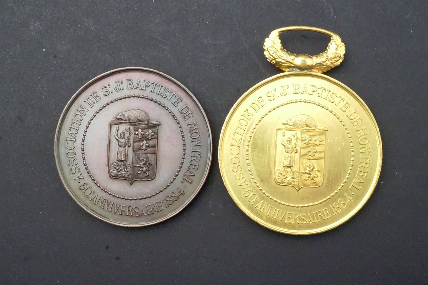3 Pcs. Lr-1742, Ludger Duvernay 50th. Anniversary of the Société de St-Jean Baptiste. UNC, WM-34, Gild w/ribbon 12.0 grs, Lr-1743 Lugder Duvernay by A. Bertrand. UNC, AE-50, Gild w/hanger 50.2 grs. & Lr-1743a, same in bronze but w/o hanger, AE-51, 48.2 grs.
