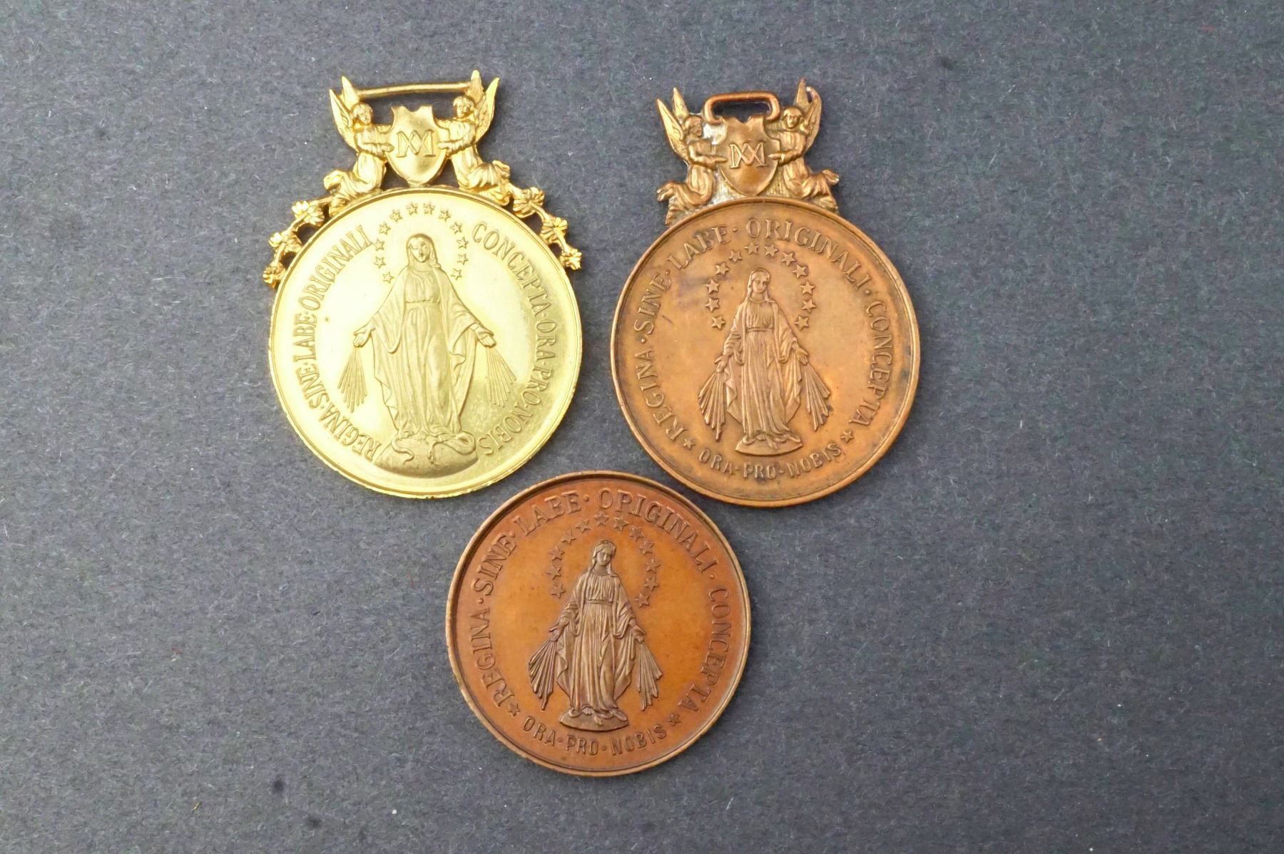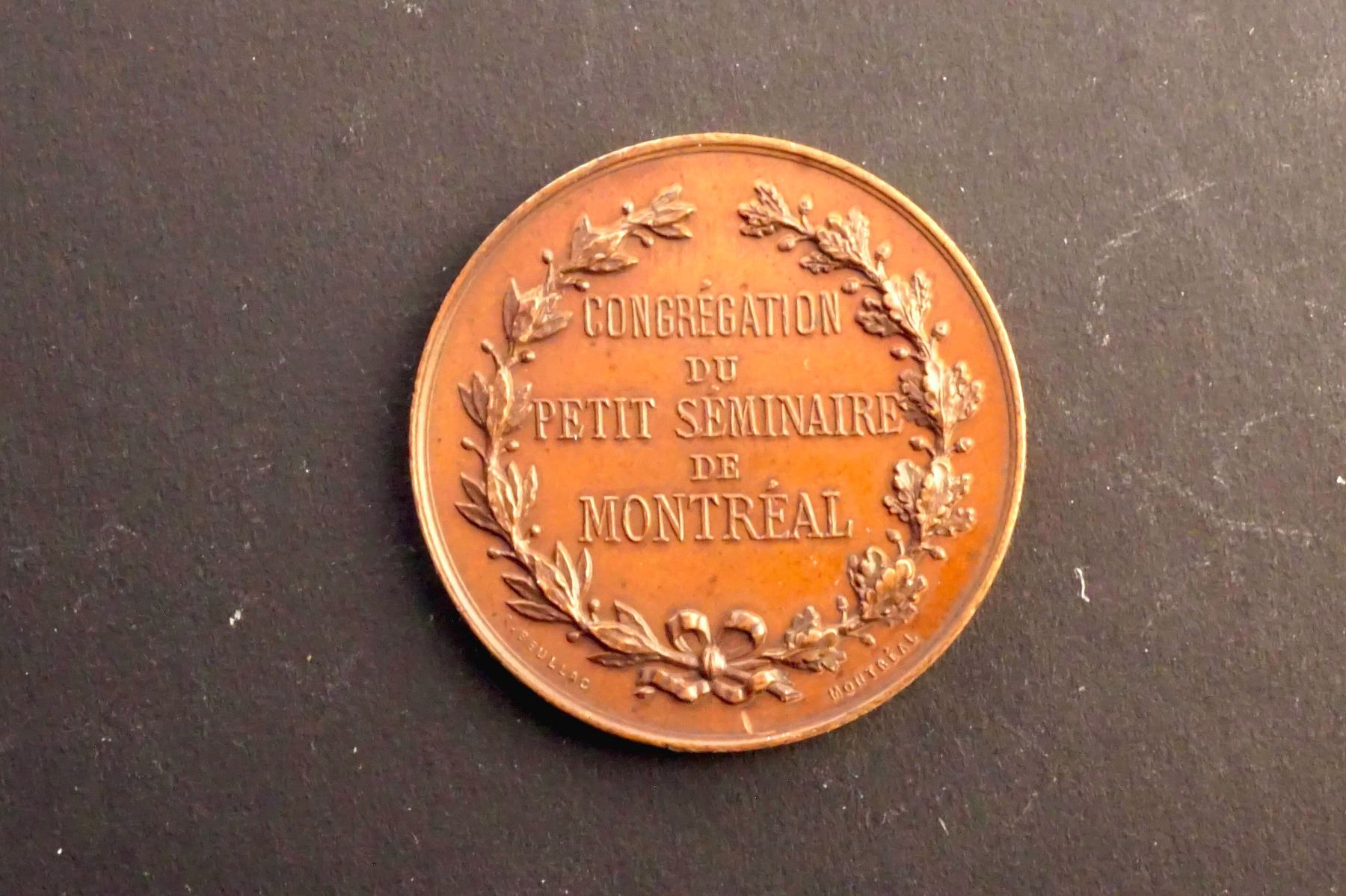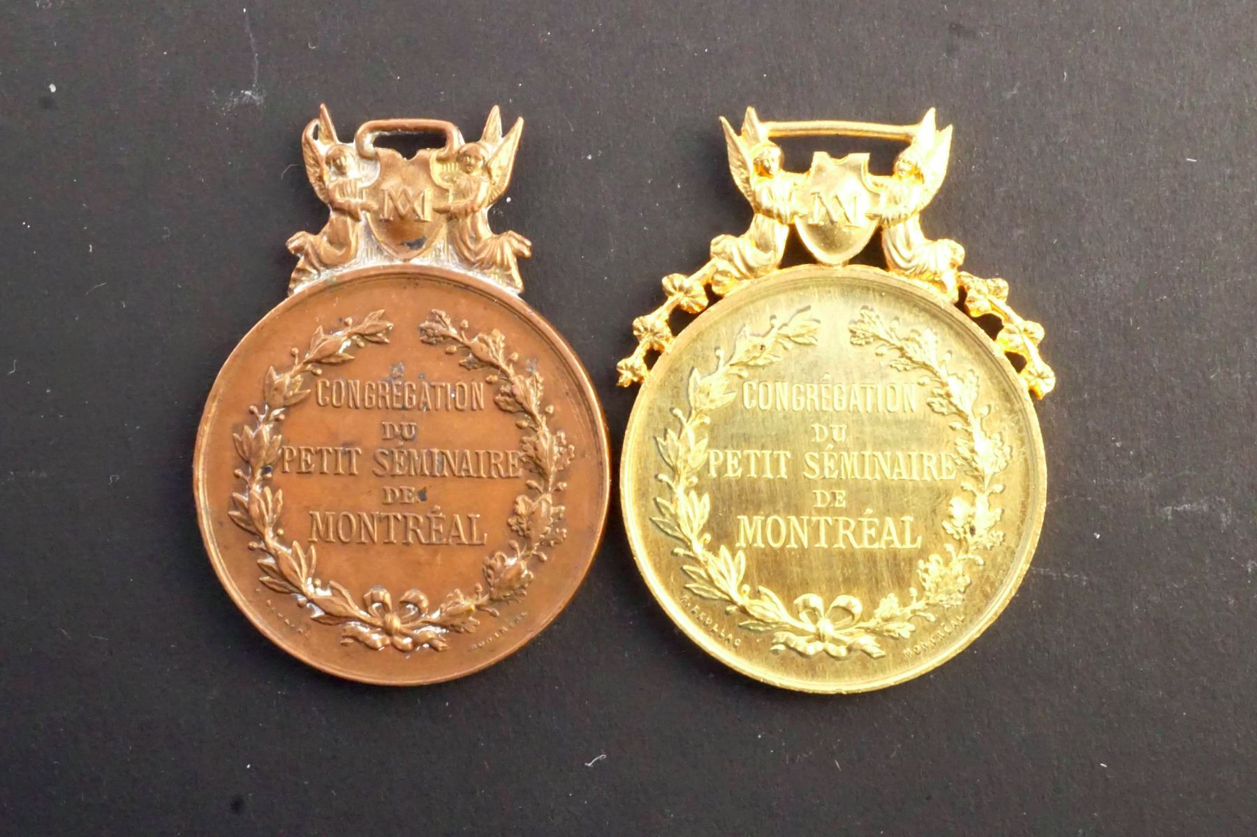 3 Pcs. Lr-1309, Petit Séminaire de Montréal by Beullac, FDC AE-37, 19.5 grs., Lr-1309a same BUT w/narrow header of angels and small suspender, EF, AE-38, 32.8 grs. & Lr-1309b same BUT Gilt w/ wide header, larger angels and flowers, FDC AE-38, 26.3 grs. Very interesting group.