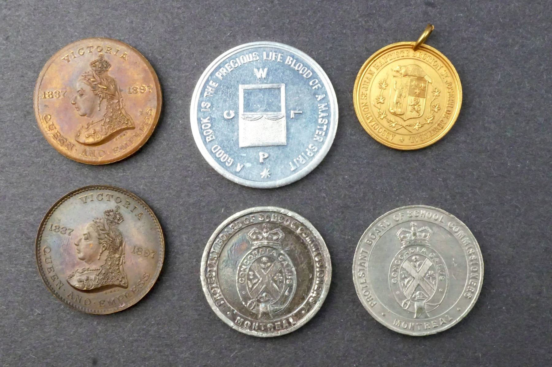 6 Pcs. Lr-1875a, Victoria w/ McGill Model School, UNC, AE-30, 14.7 grs, 2 x Lr-1875b, same w/Protestant School Board, VF, WM-30, 11.7 grs, same EF/Au, 13.8 grs & same UNC, AE-30, 15.1 grs, Lr-1875j, Victoria w/St-Jean Baptiste Society, UNC, AE-24 w/loop 5.7grs. and lastly Lr-1882, YMCA Library Opening, UNC, AL-34, 4.9 grs.
