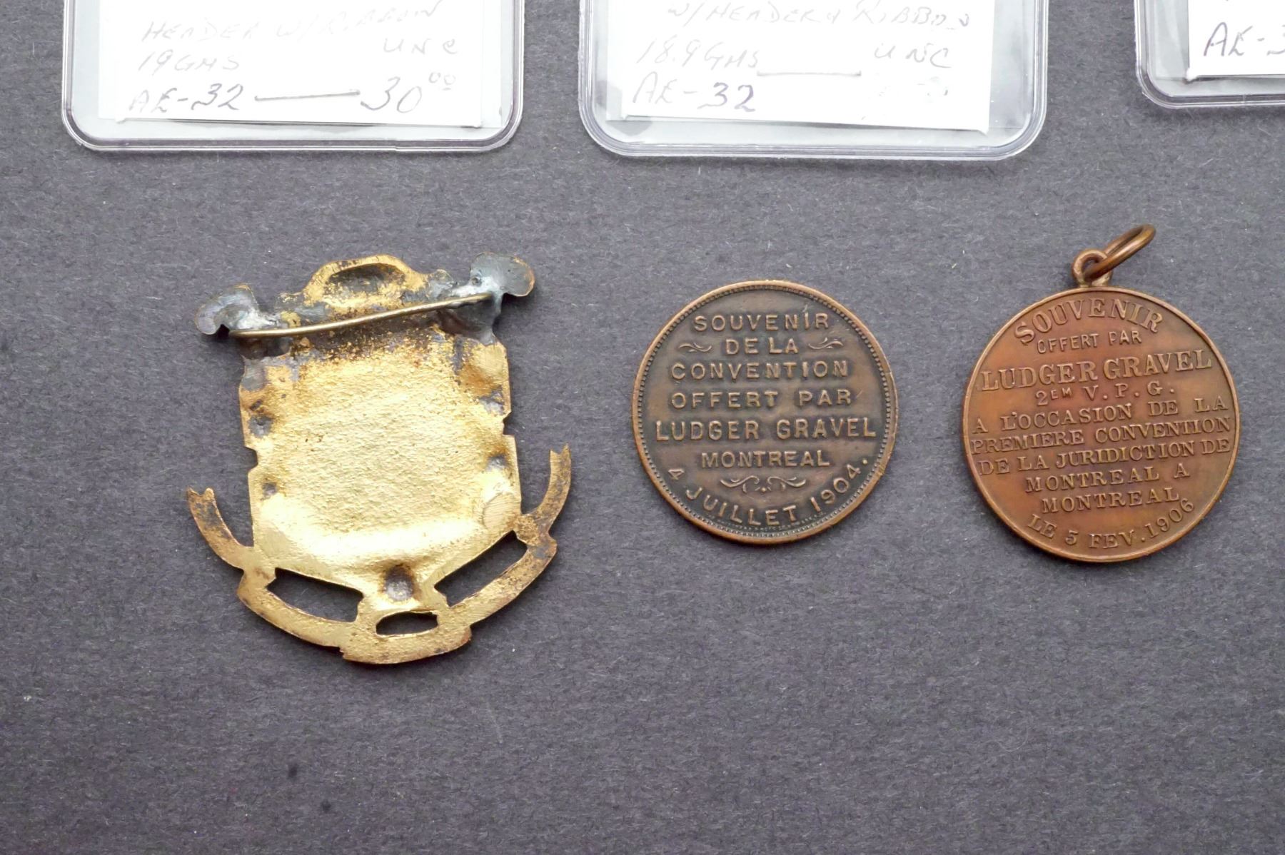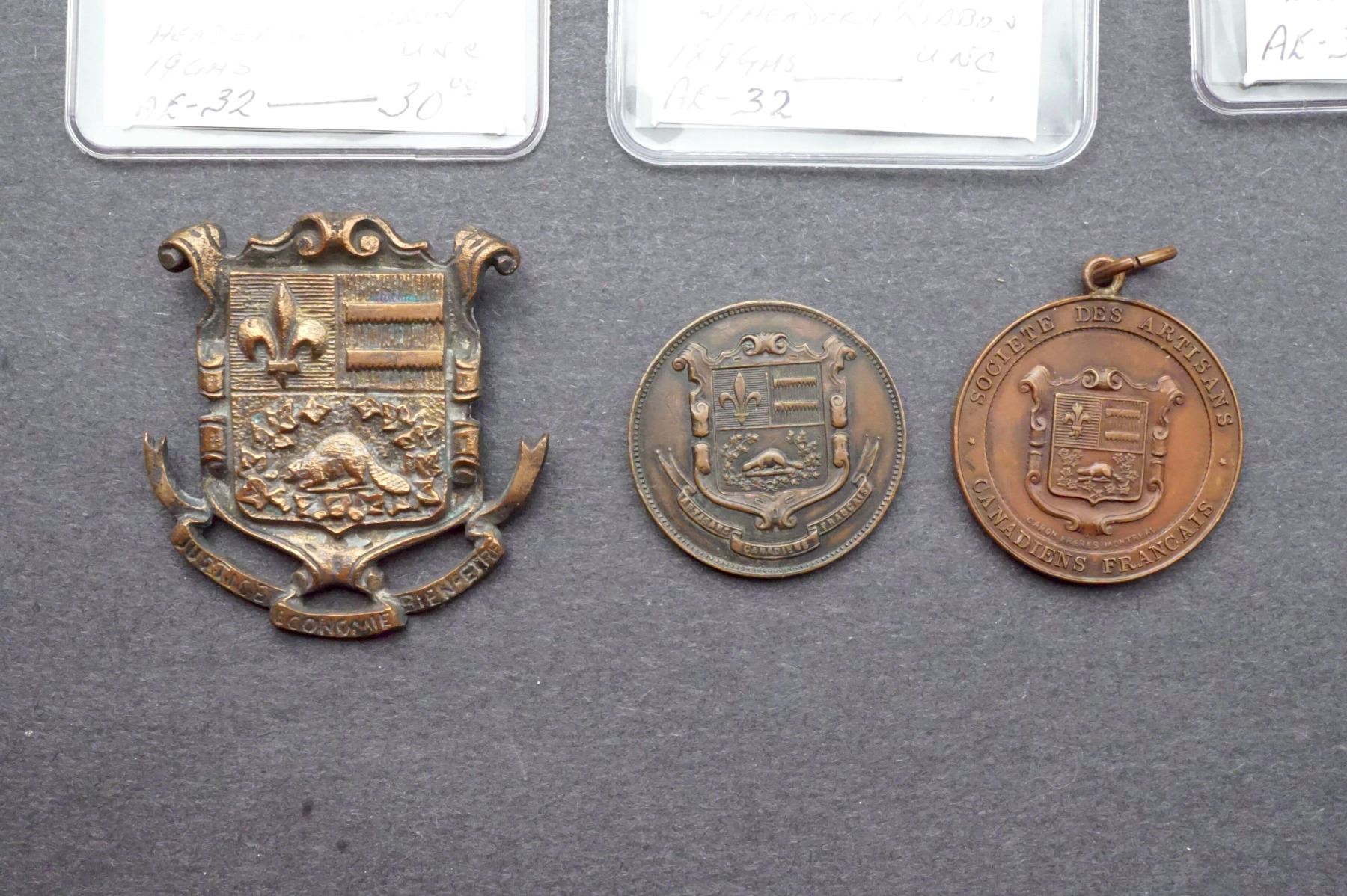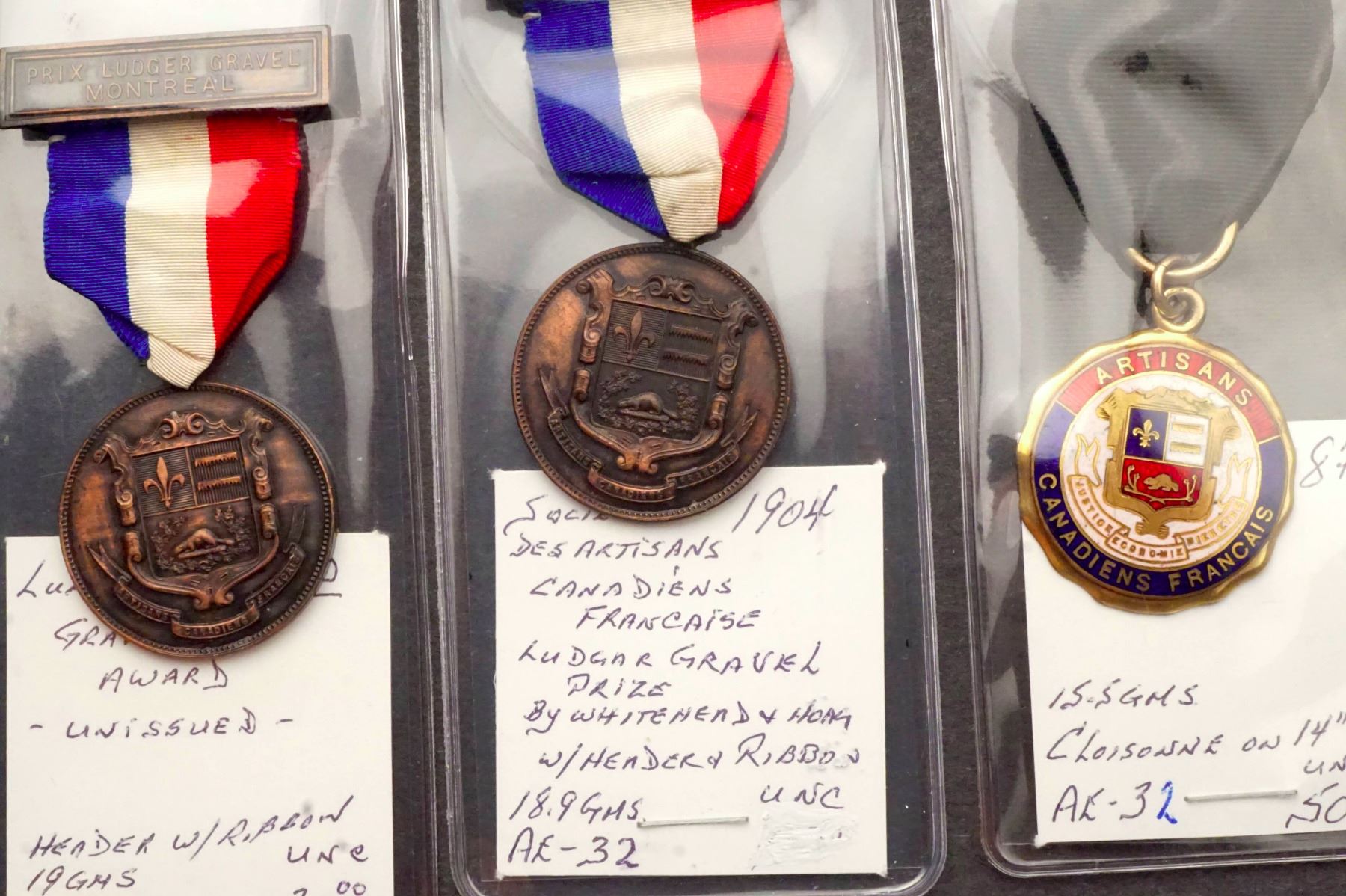 6 Pcs. 1904 Société des Artisans Canadiens Français Souvenir by Whitehead and Hoag. EF, AE-32, 11.5 grs. 2 x 1904 Prix Ludger Gravel in UNC, AE-32 w/ header and ribbon, N/D cloistered Coat of arms, AE-32, uniface w/14 inch black ribbon, 1906 Souvenir. UNC, AE-32, gilt w/loop 16.0 grs. & a Cast of the Coat of arms 49 x 49 mm. 21.6 grs.