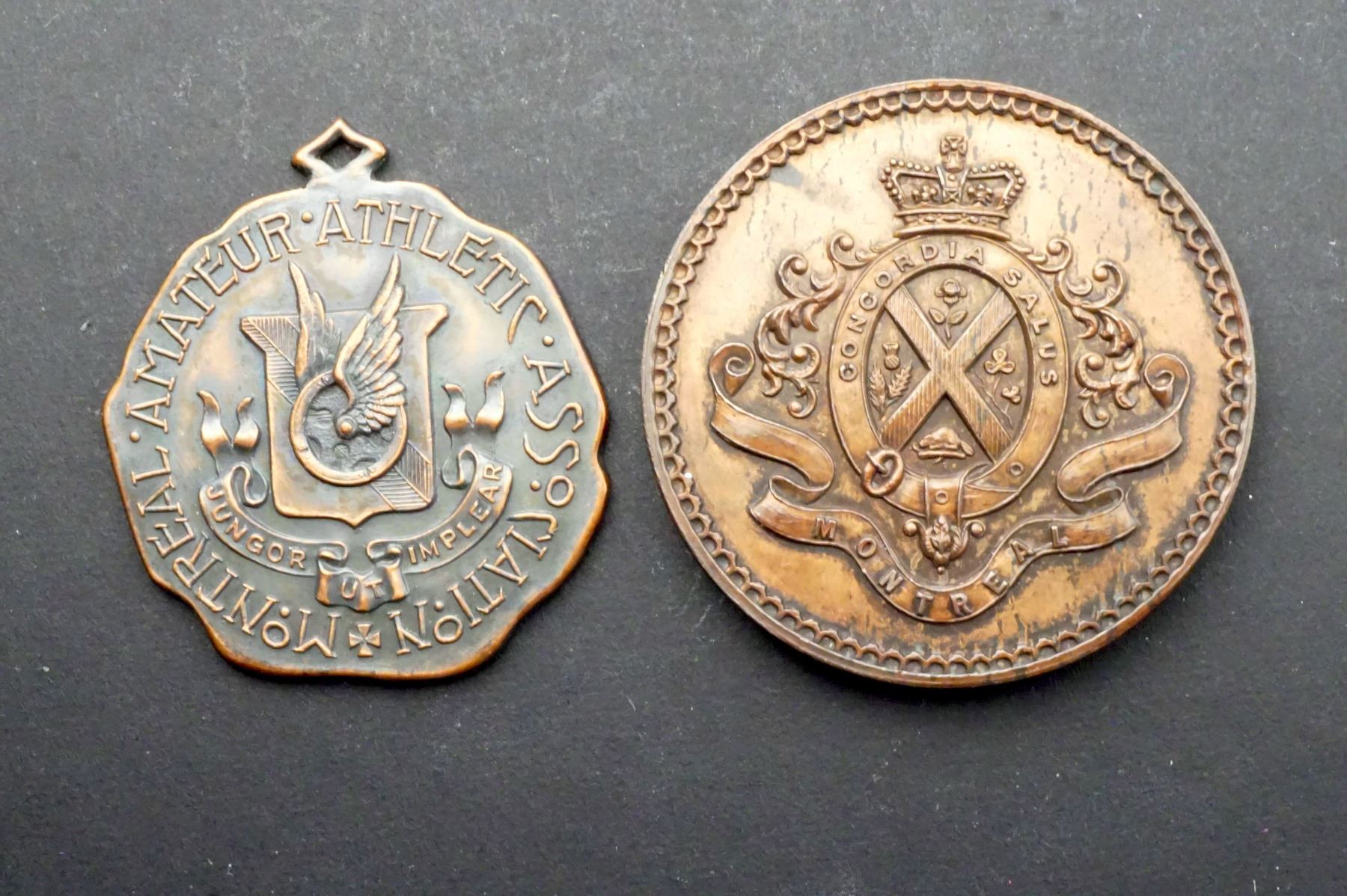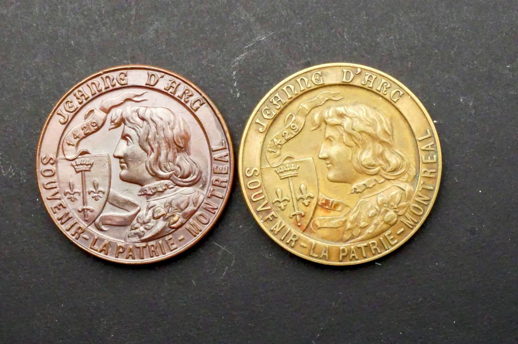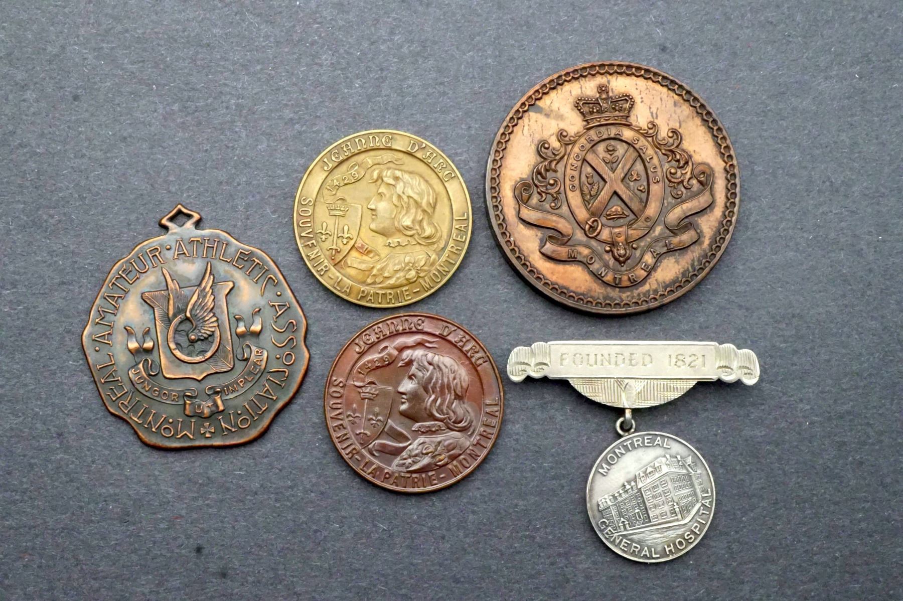 5 Pcs. Montréal Amateur Athletic Assoc. logo, uniface irregular medal by Hemsley. UNC, AE-40 w/loop, 19.3 grs, Montréal Canine Assoc. FDC AE-45, 41.3 grs., Montréal General Hospital nurse's training school medal by Birks, AR-23 w/hanger 10.1 grs. & 2 x La Patrie Jeanne D'Arc token by Caron, AE-32, #'s 148736 & 59737.