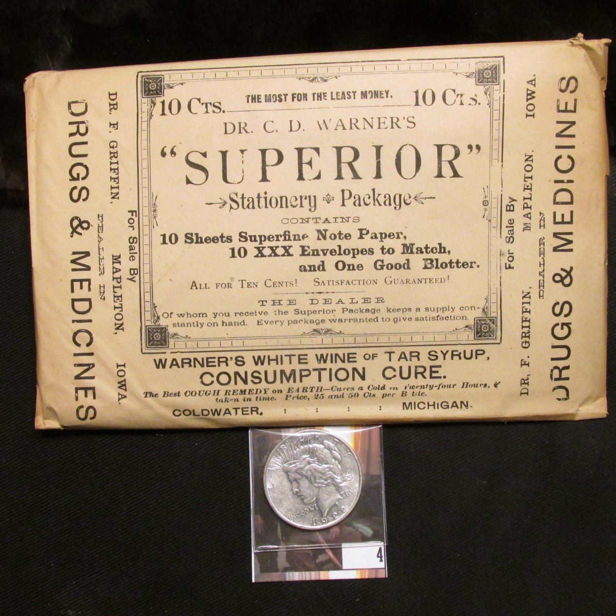 Quack Doctor advertising Envelope containing "Dr. C.D. Warner's "Superior" Stationery Package…Warner's White Wine of Tar Syrup Consumption Cure…Coldwater, Michigan"; cardboard sign "Warner's White Wine of Tar Syrup Consumption Cure! contains 10 Sheets Superfine Note Paper, 10 XXX Envelopes to Match, and One Good Blotter. All for Ten Cents! Satisfaction Guaranteed!"; & 1922 D U.S. Silver Peace Dollar, AU-BU.