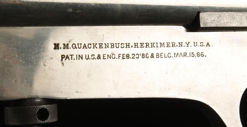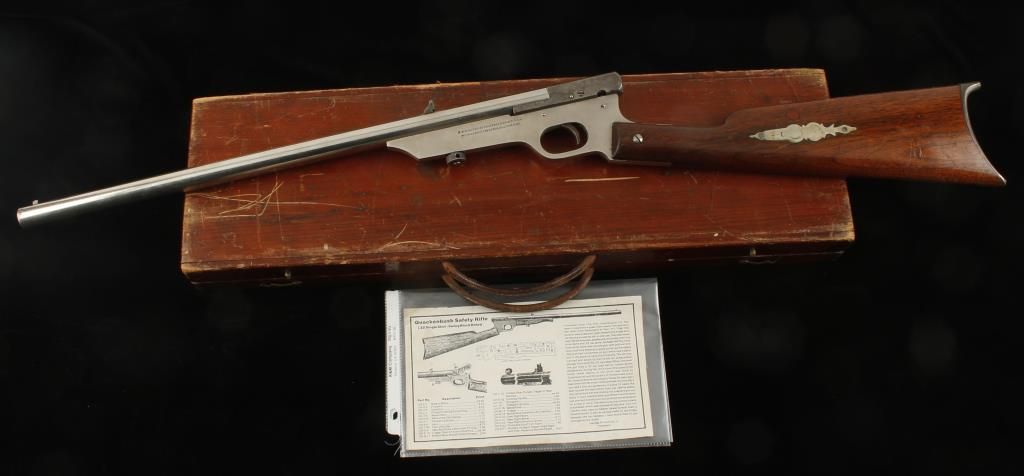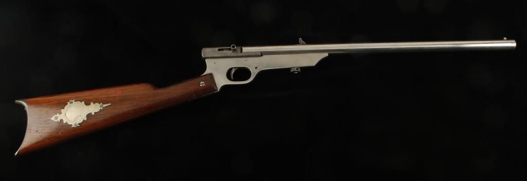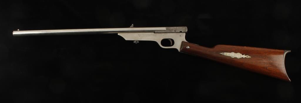 Single shot takedown boys rifle made in 1890's with 18" barrel. Nickel finish, straight grip walnut stock, crescent butt plate and fixed sights. Right side of butt stock inlaid with "patchbox" and left side also inlaid with miniscule size "patchbox". Very good bore and action. Includes original wood box. Condition: Very good showing 90% nickel, small pitting spot in front of trigger guard and wood is good showing early repair of a hole through stock behind wrist. *Antique Firearm*