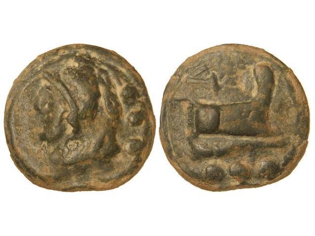 Quadrans. 225-216 a.C. ROMA. Anv.: Cabeza de Minerva a izquierda, detrás tres puntos. Rev.: Proa de nave a derecha, debajo tres puntos. 35,60 grs. Pátina verde terrosa. Se-No cita; Vecchi-No cita. EBC+.