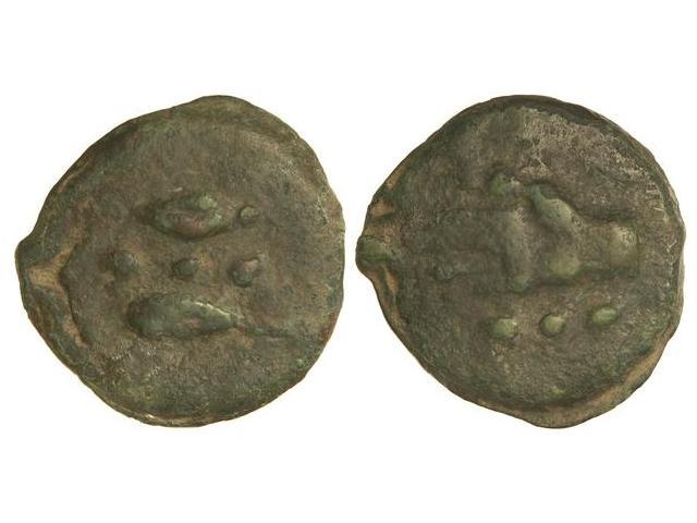 Quadrans. 289-245 a.C. ANÓNIMO. ROMA. Anv.: Dos granos de cebada entre ambos tres puntos. Rev.: Mano a izquierda, debajo tres puntos. 74,40 grs. Pátina verde. T&V-4A. MBC+.