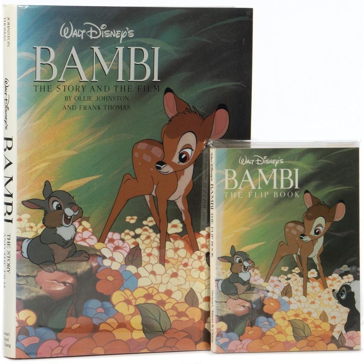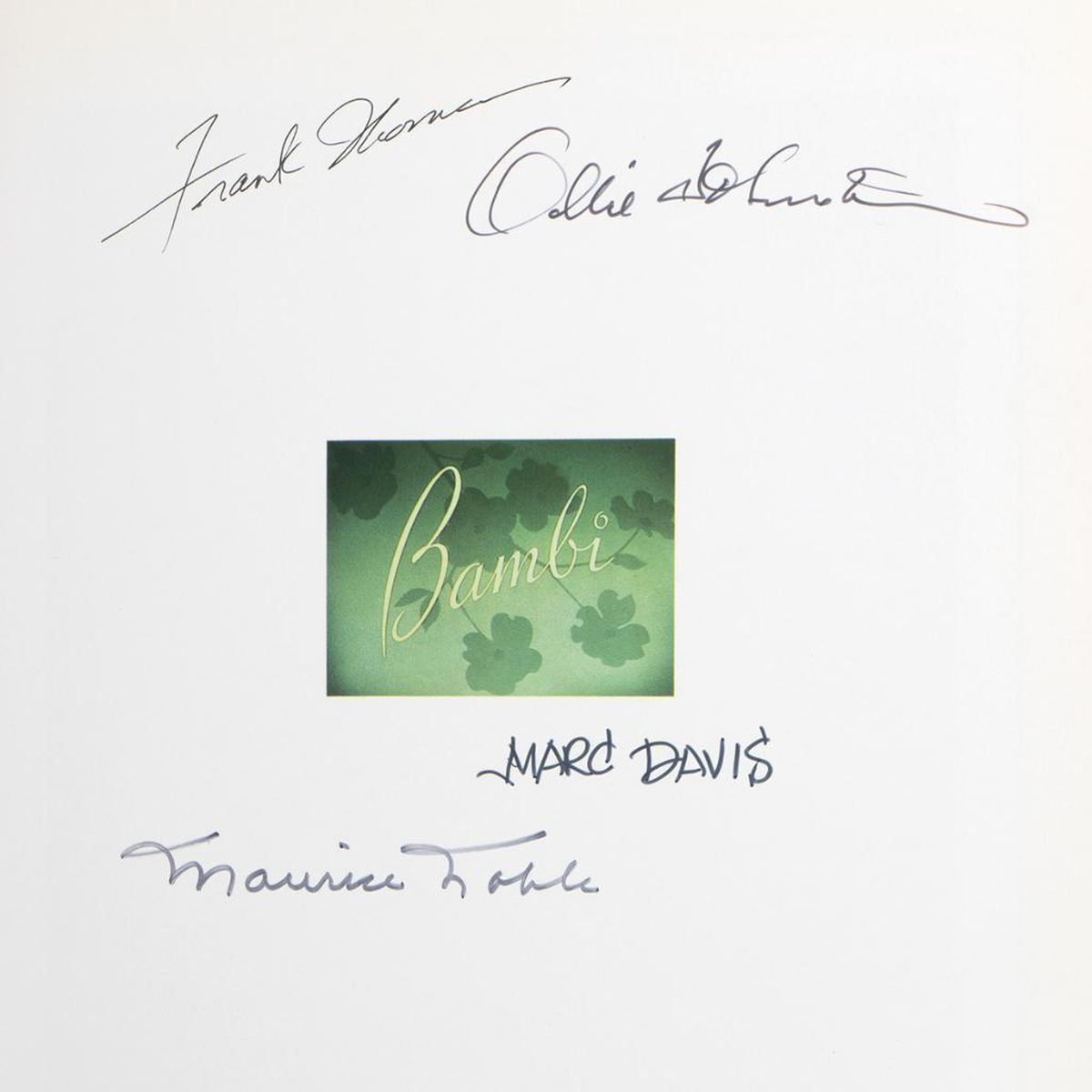 Quadruple signed Disney Bambi collectors set Walt Disneys Bambi, The Story and The Film together with Bambi, The Flip Book, the story of the making of the film Bambi€, the main volume with text by Ollie Johnston and Frank Thomas, artwork in both volumes by Ollie Johnston, Frank Thomas, Marc Davis, and Maurice Noble, published by Stewart, Tabori & Chang, New York, 1990. Both books are signed by all four of the artists. The main volume fine in a near fine dust jacket, the flip book is fine.