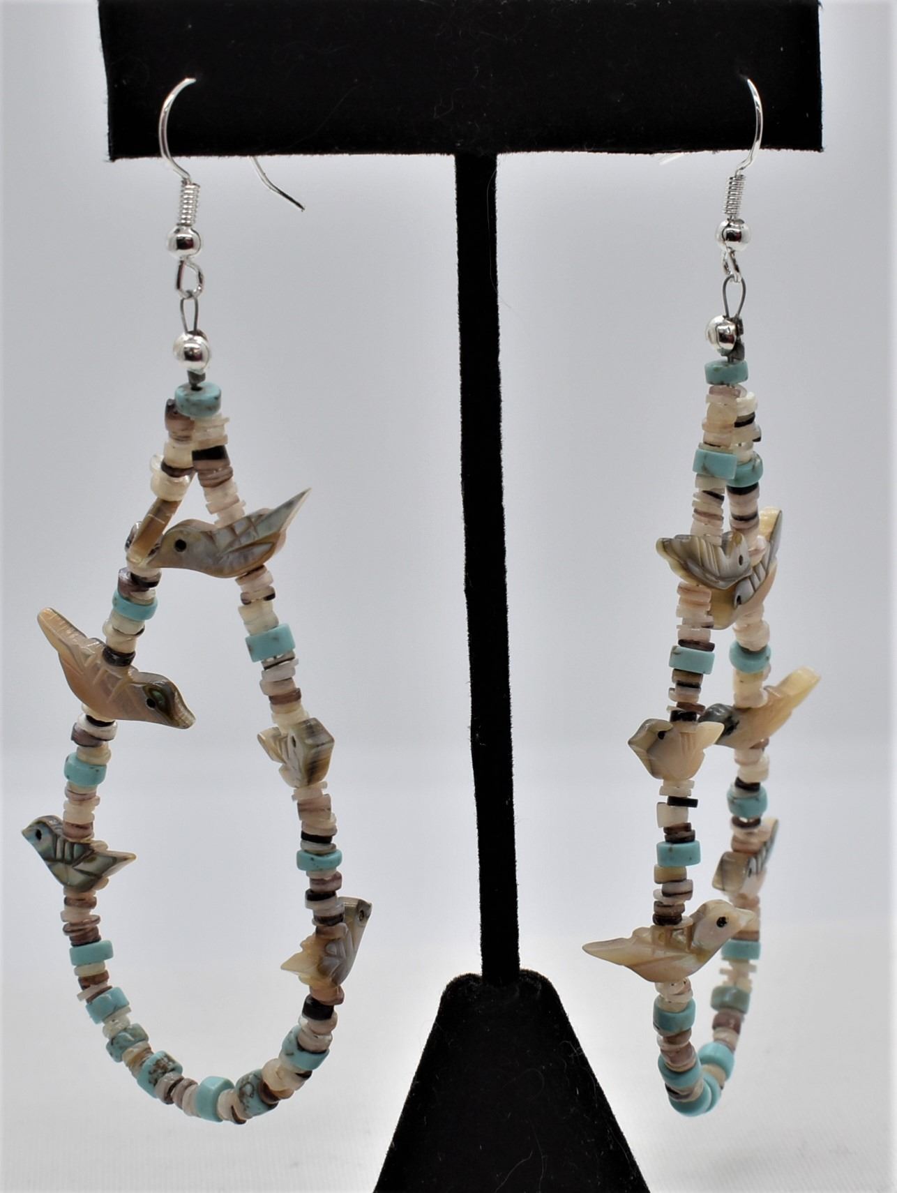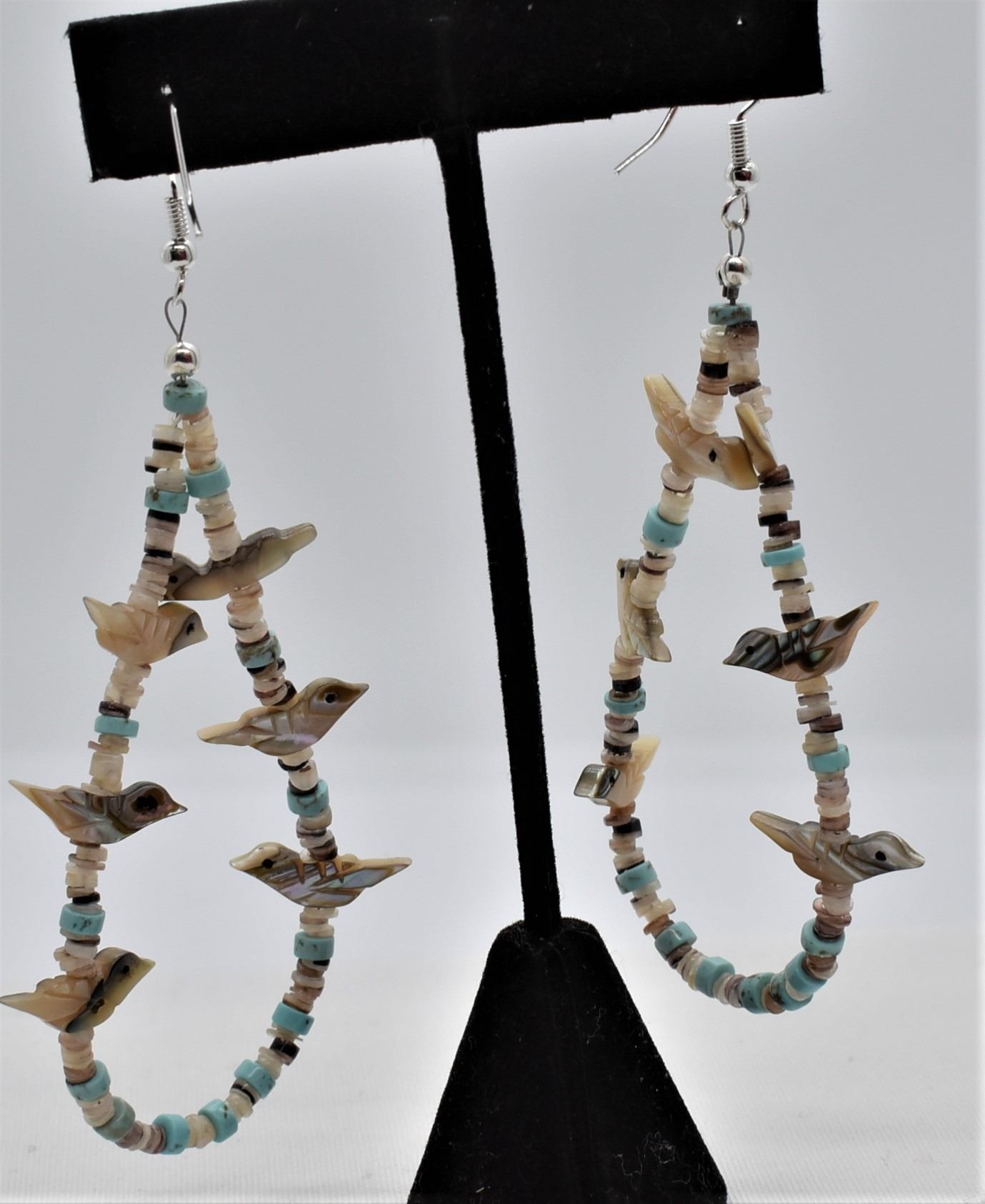 Quail Ridge Studios Abalone Bird Fetish Loop Earrings by Larry McLellan, abalone bird fetishes, Hammer Shell and Turquoise heishi beads as spacers, for pierced ears have a drop of 3'', The magic of the Desert Southwest is timeless in its display of open landscapes, sunrise and sunset colors with infinite possibilities of artistic expression. The design studio of Quail Ridge was founded on these possibilities, forging an endless variety of earthen gems to their metallic counterparts. The artist, Larry McLellan, designs jewelry contemporary in style, while maintaining elements of native designs.