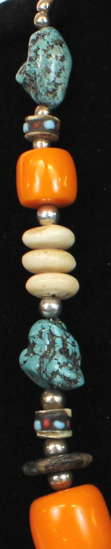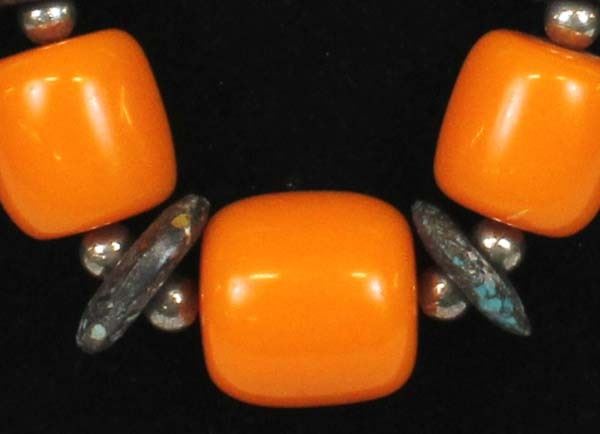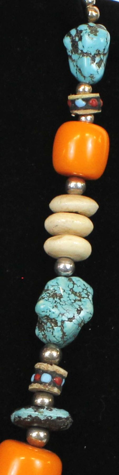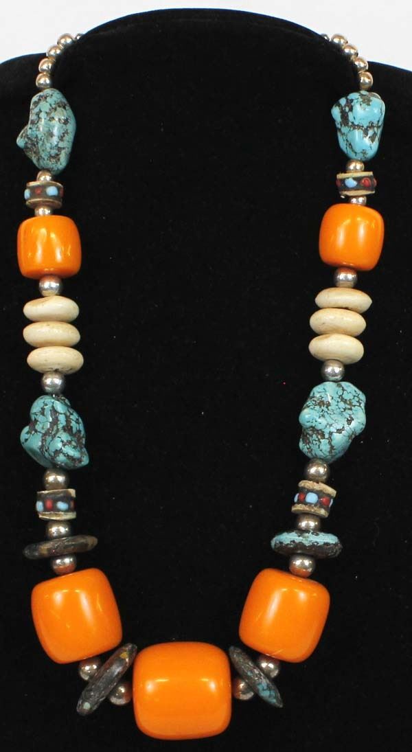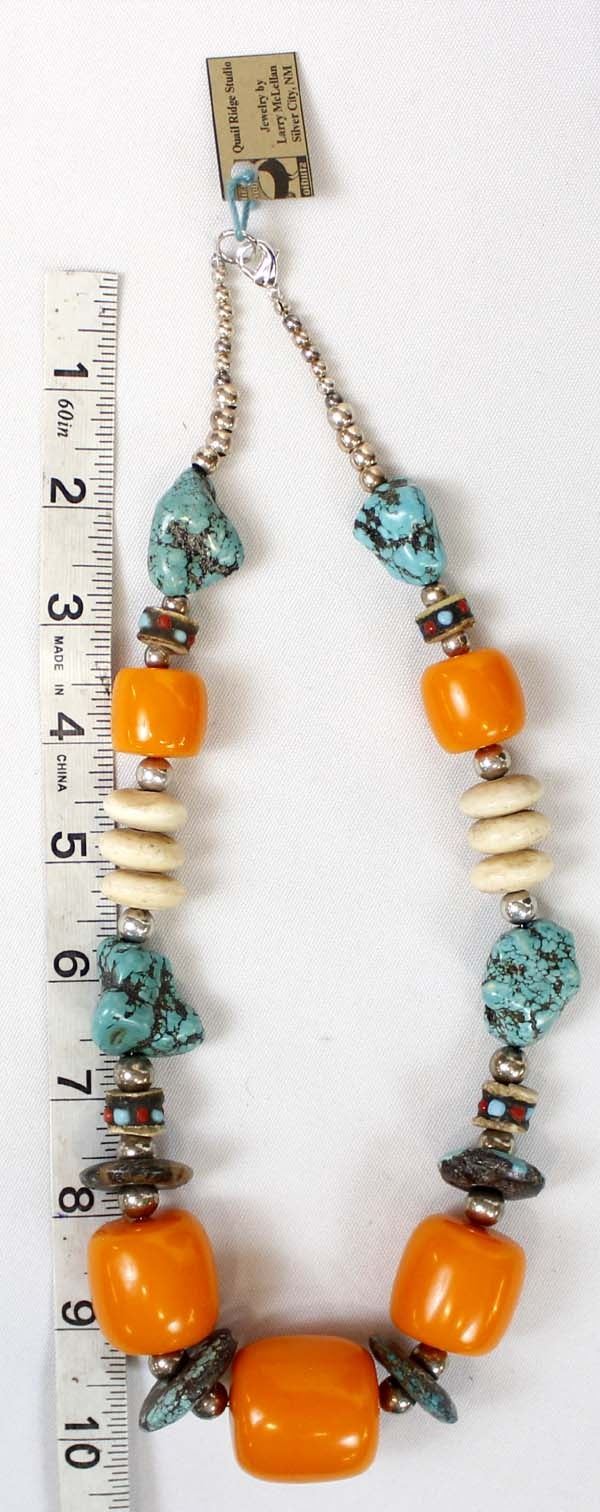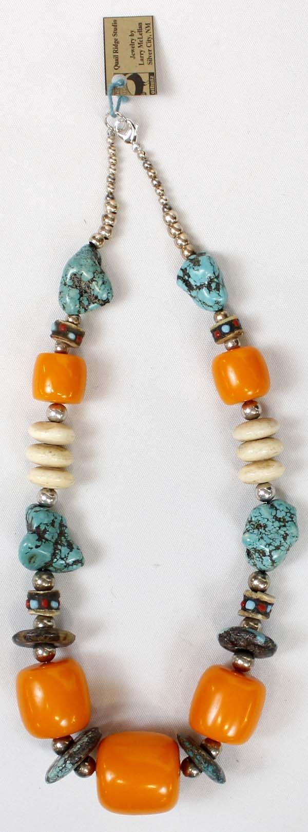 One of a Kind Quail Ridge Studios African Butterscotch Amber & Turquoise Bead Necklace by Larry McLellan of Silver City NM, measures 21''L end to end, also features magnesite, bone rondelles, turquoise & coral encrusted beads, and silver beads largest bead measures 1''D x 1.25''L, stunning colors, The magic of the Desert Southwest is timeless in its display of open landscapes, sunrise and sunset colors with infinite possibilities of artistic expression. The design studio of Quail Ridge was founded on these possibilities, forging an endless variety of earthen gems to their metallic counterparts. The artist, Larry McLellan, designs jewelry contemporary in style, while maintaining elements of native designs.