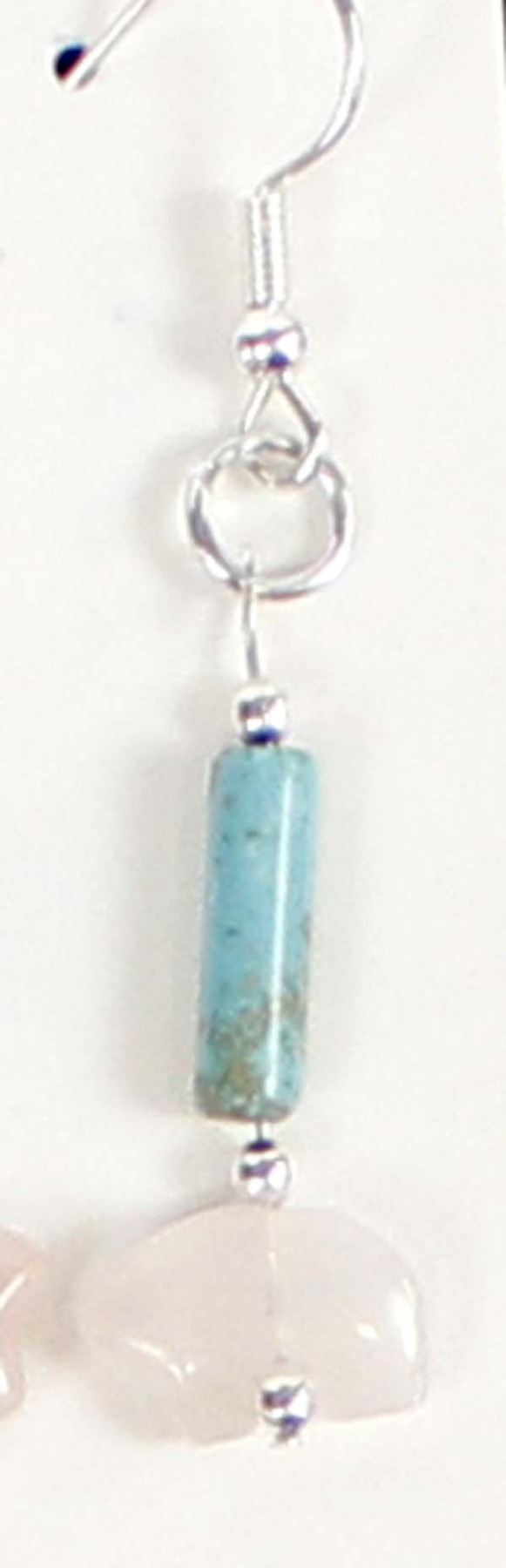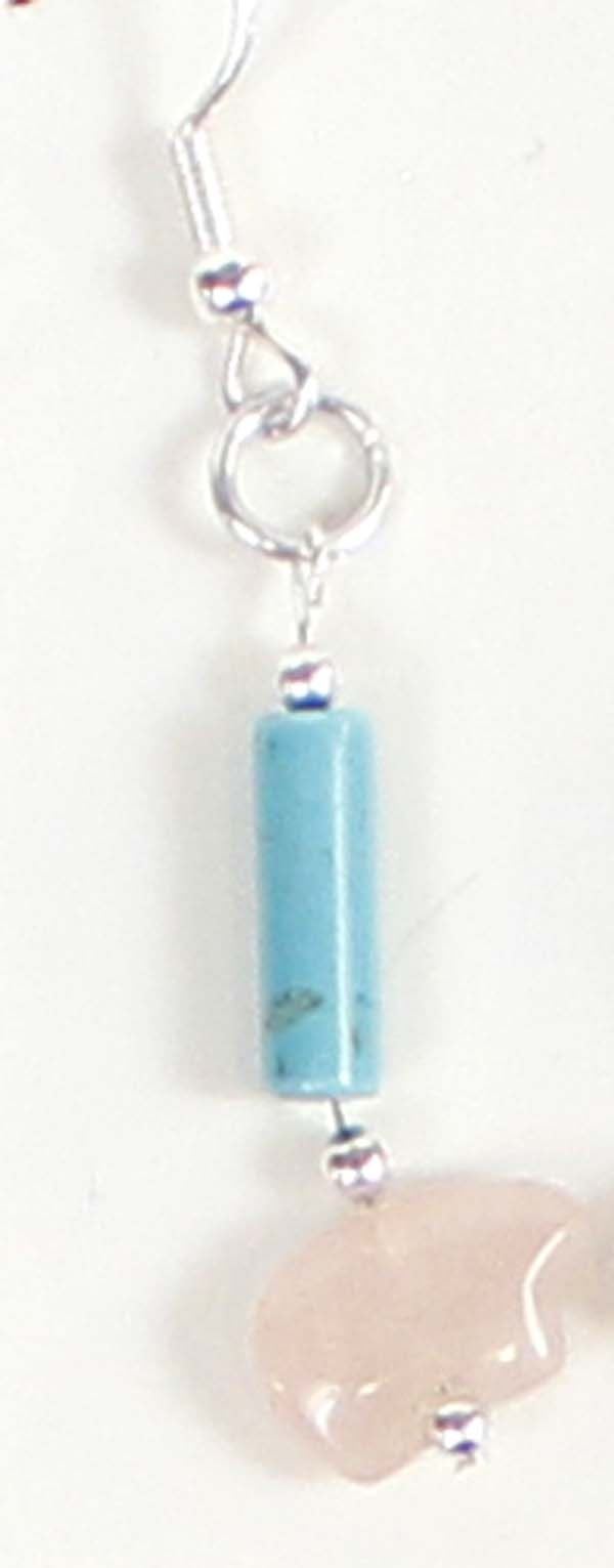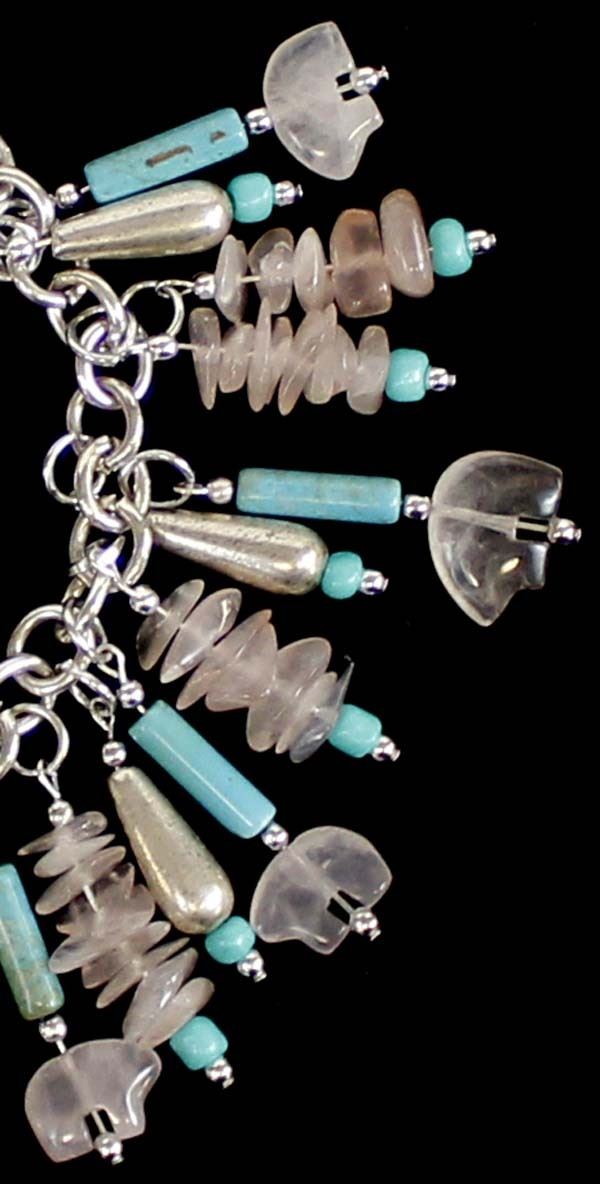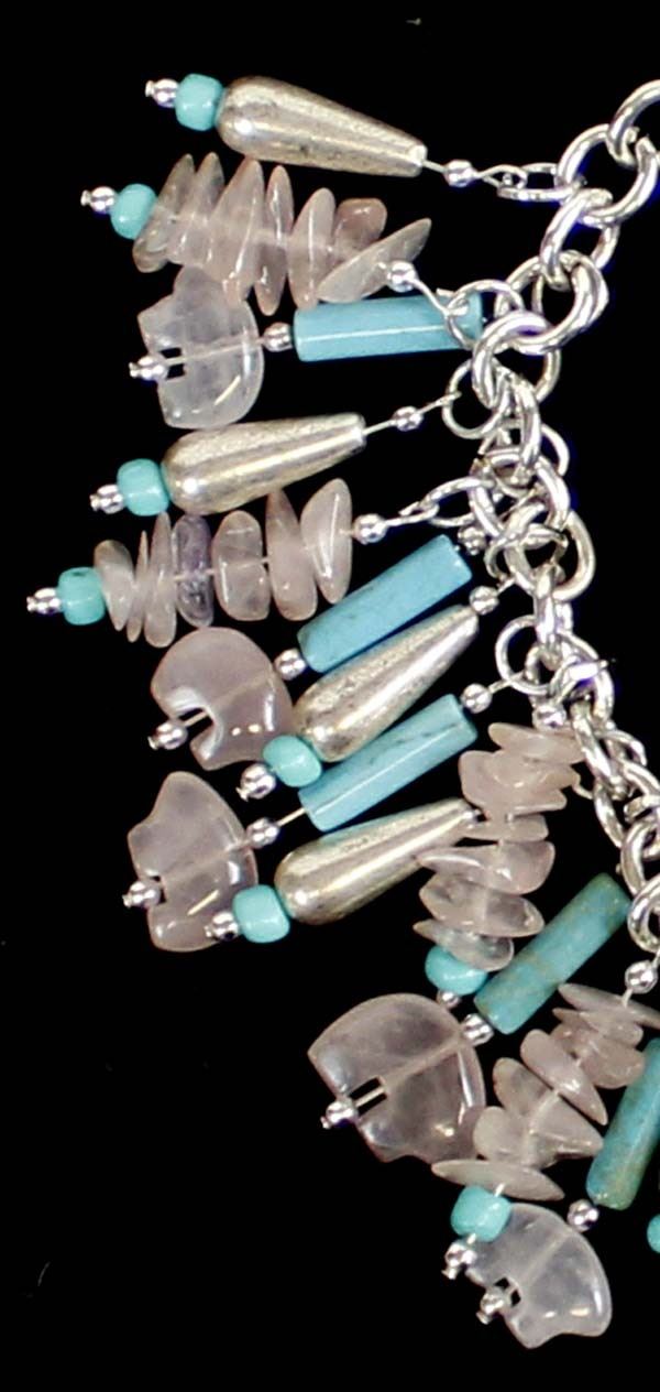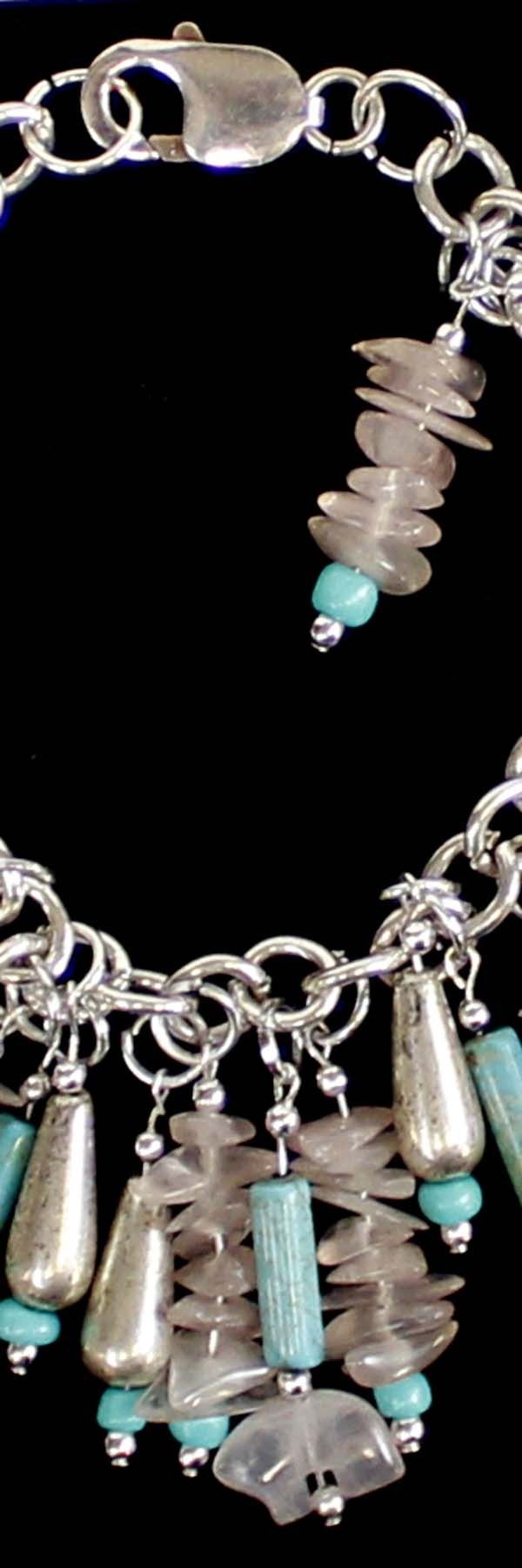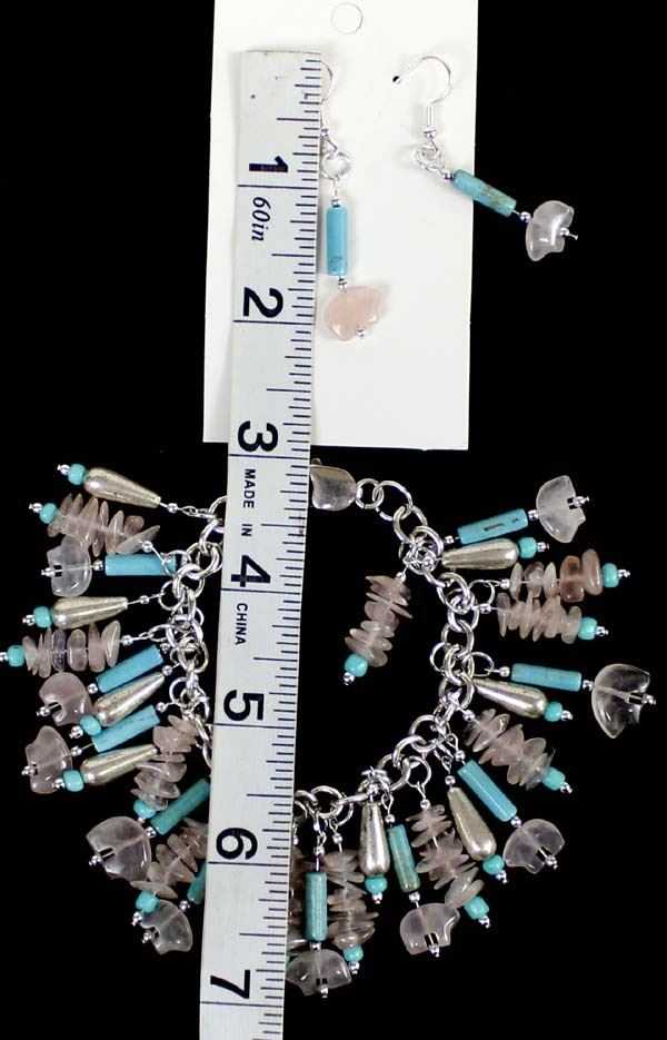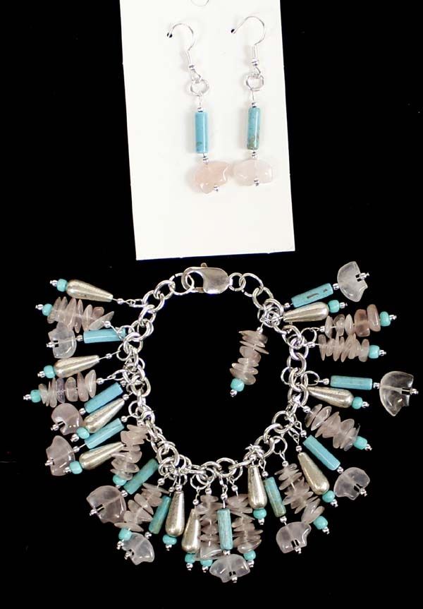 Quail Ridge Studios One of a Kind Rose Quartz Bear Fetish Bracelet & Earrings, turquoise magnesite tube beads, brushed silver drop beads and drops of stacked rose quartz chip beads, sterling silver lobster style clasp, measures 7.5'', matching earrings 2.25'' drop, The magic of the Desert Southwest is timeless in its display of open landscapes, sunrise and sunset colors with infinite possibilities of artistic expression. The design studio of Quail Ridge was founded on these possibilities, forging an endless variety of earthen gems to their metallic counterparts. The artist, Larry McLellan, designs jewelry contemporary in style, while maintaining elements of native designs.