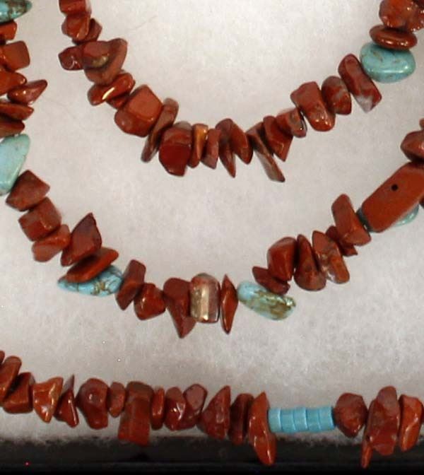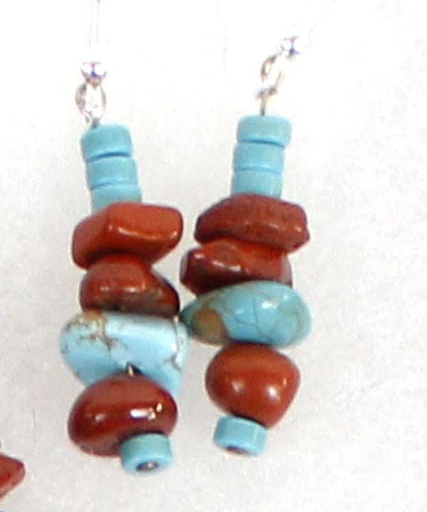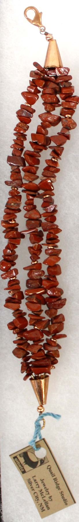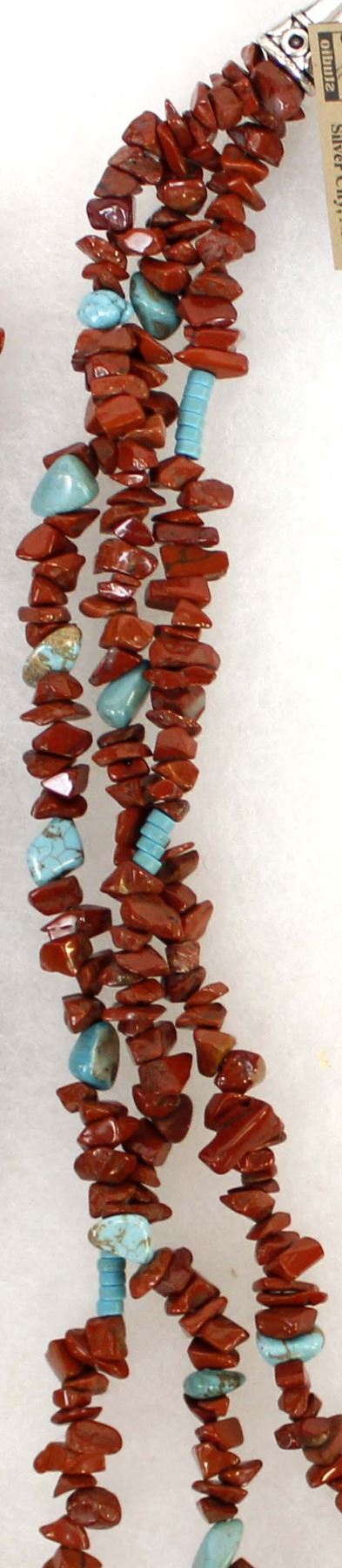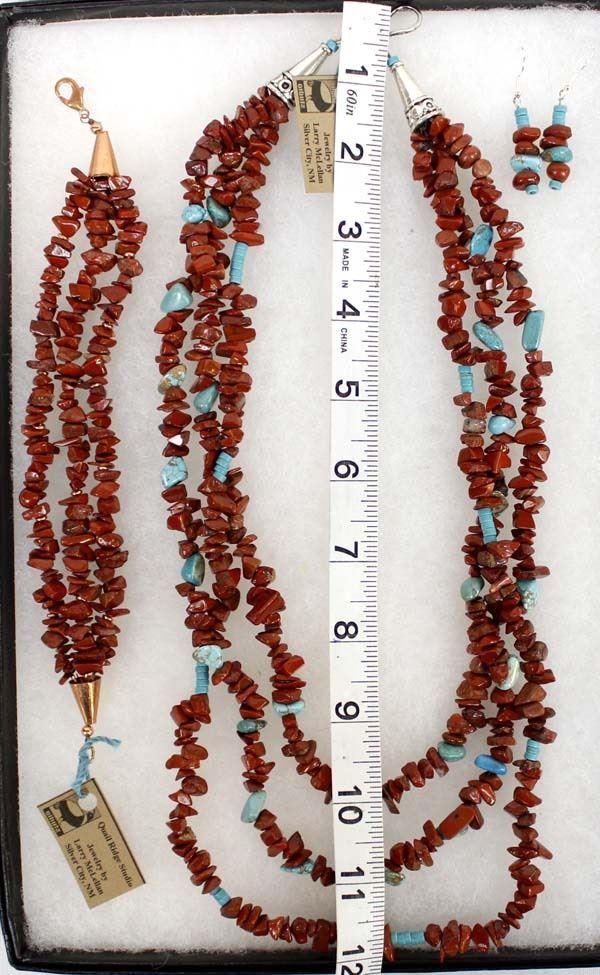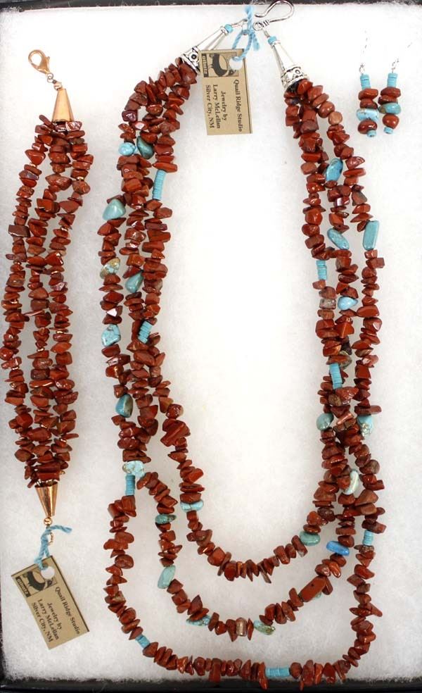 Quail Ridge Studios One of Kind Jasper Jewelry Suite by Larry McLellan, includes a 3 strand jasper bracelet with copper cones accents and a lobster clasp closure, measures 8.75''L end to end, a 3 strand jasper, and turquoise necklace accented with silvertone cones, measures 23''L end to end, hook closure, turquoise and jasper drop earrings measuring 2''L which also includes the French hooks, truly an eye catching suite, The magic of the Desert Southwest is timeless in its display of open landscapes, sunrise and sunset colors with infinite possibilities of artistic expression. The design studio of Quail Ridge was founded on these possibilities, forging an endless variety of earthen gems to their metallic counterparts. The artist, Larry McLellan, designs jewelry contemporary in style, while maintaining elements of native designs.